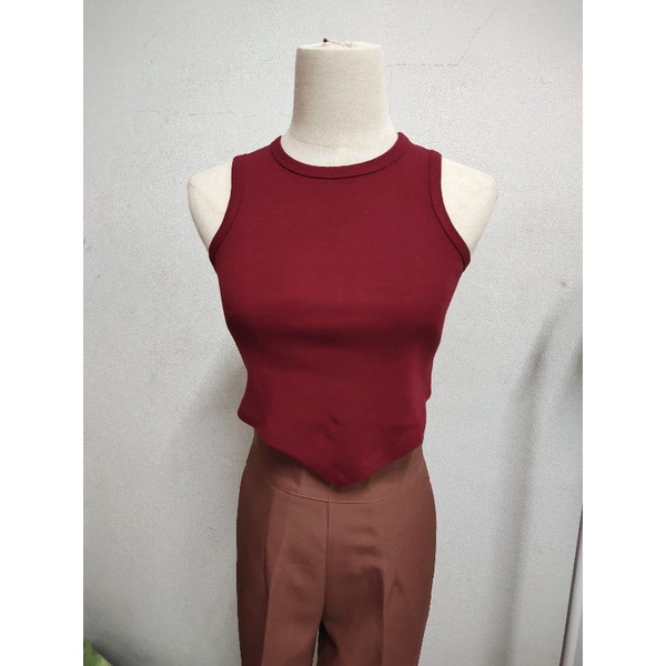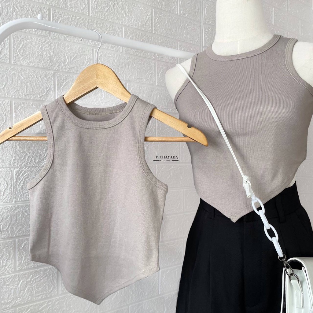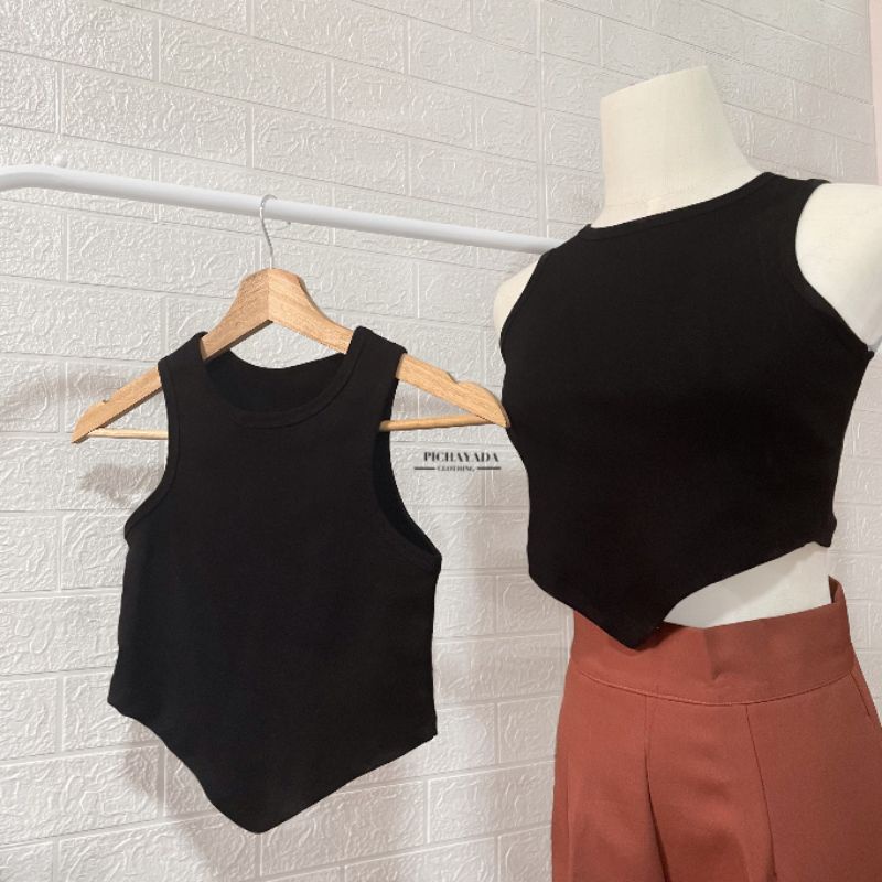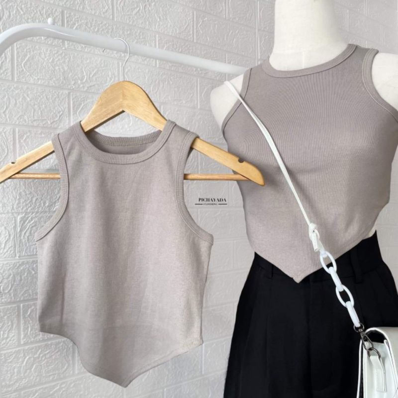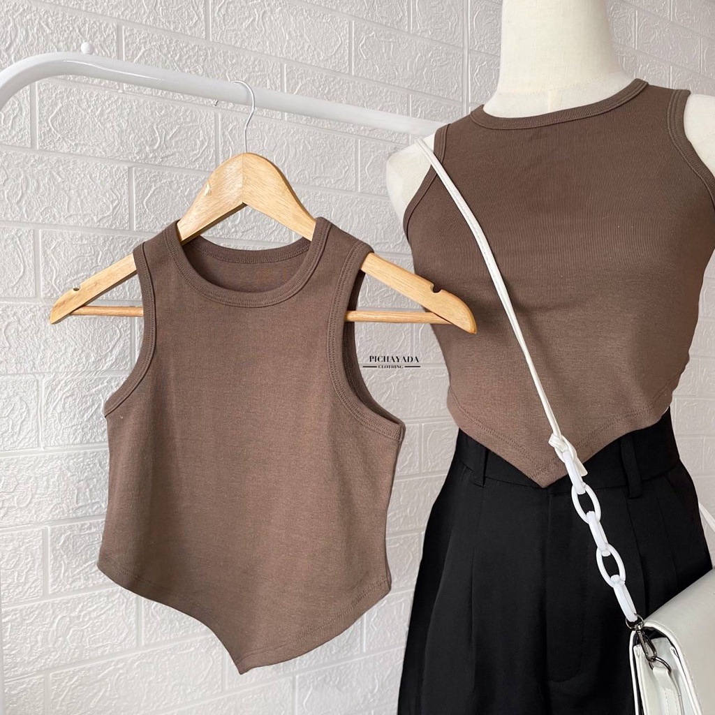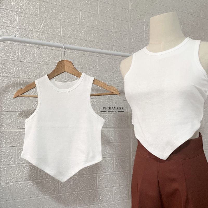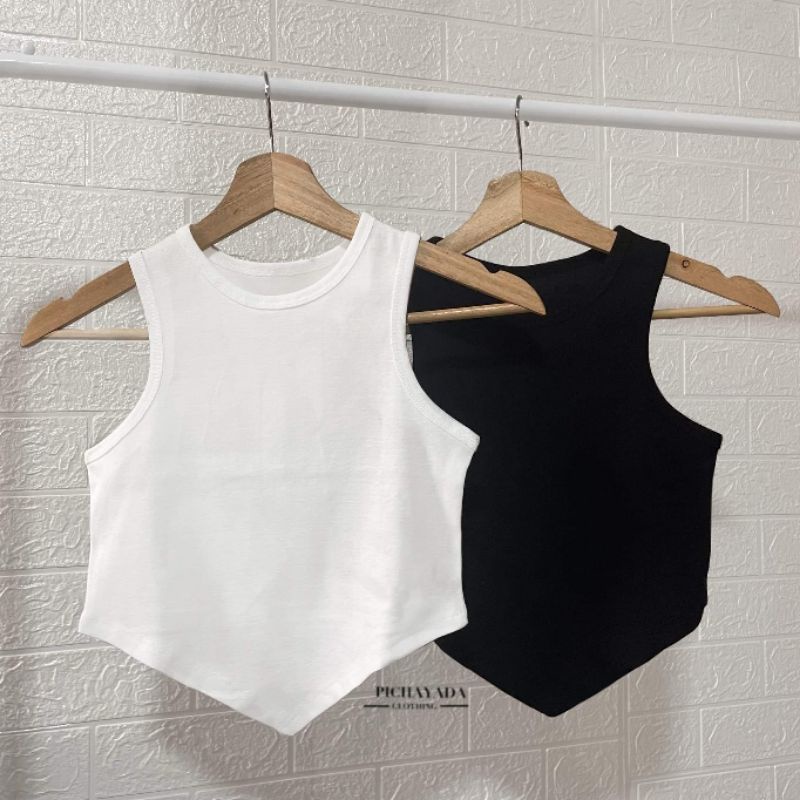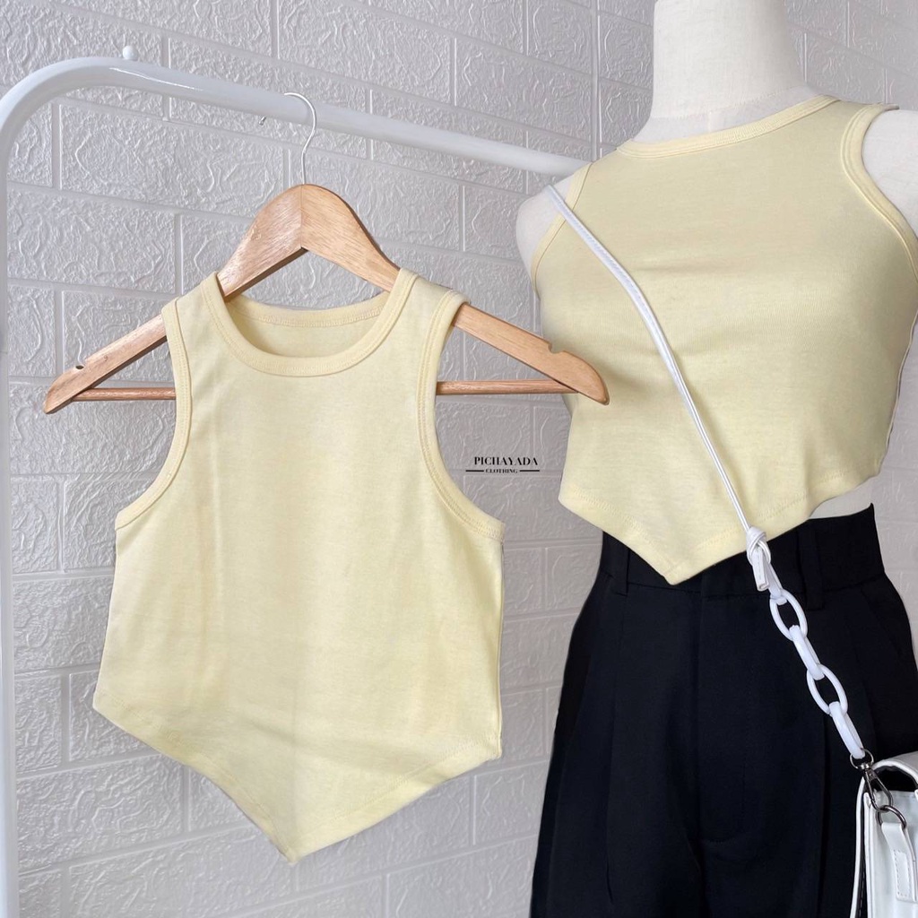 Pich_clothing# ✨พร้อมส่ง🍦เสื้อครอปสั้นคอกลม แขนกุด แต่งดีเทลหน้าทรงวีหลังสั้น มี9สี🌽✨