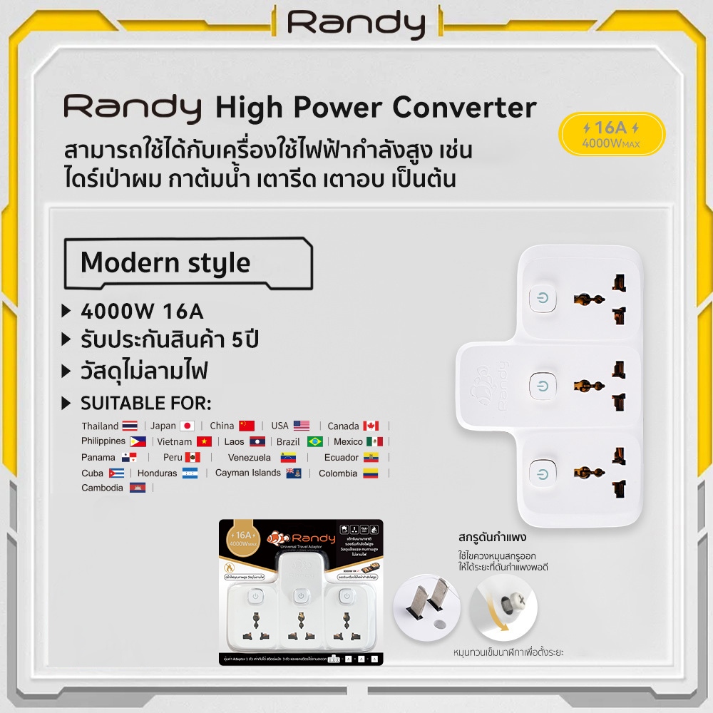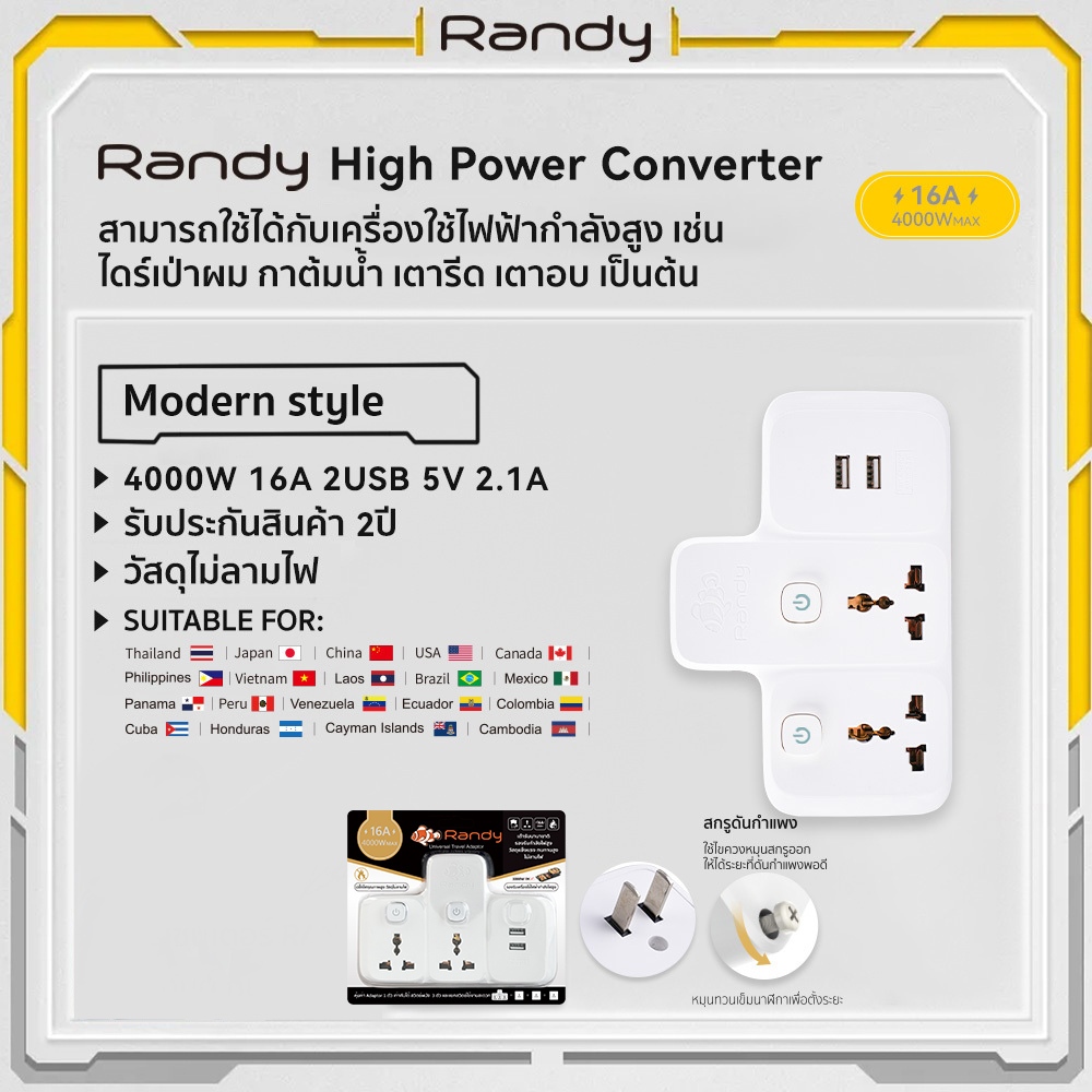Randy ปลั๊กไฟ16A ปลั๊กแปลง 3680W ปลั๊กไฟusb adapter UKEUรับกำลังไฟสูง หัวชาร์จUSB รางปลั๊กไฟทองแดง ปลั๊กแปลงไฟ ปลั๊ก