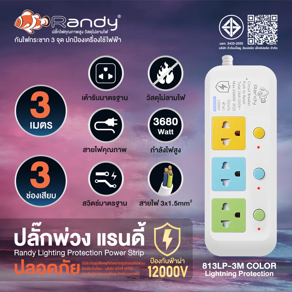 Randy ปลั๊ก 81LPป้องกันแรงดันไฟฟ้าสูง 12000V ป้องกันไฟกระชาก3จุด ปลั๊กไฟ ปกป้องเครื่องใช้ไฟฟ้าแพง รางปลั๊กไฟ 3M 16A3680W