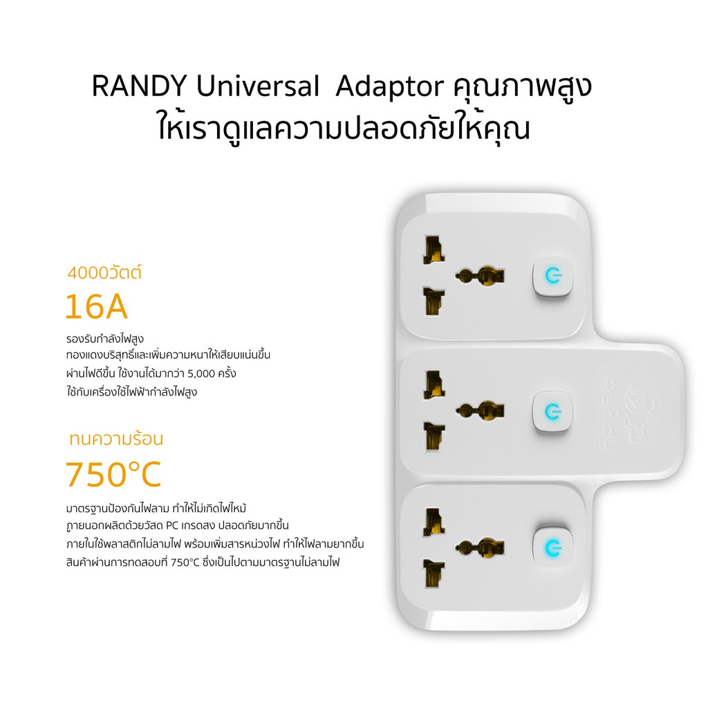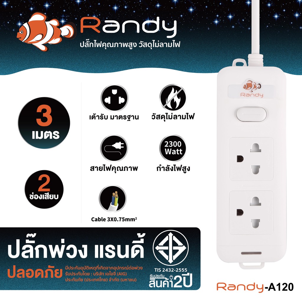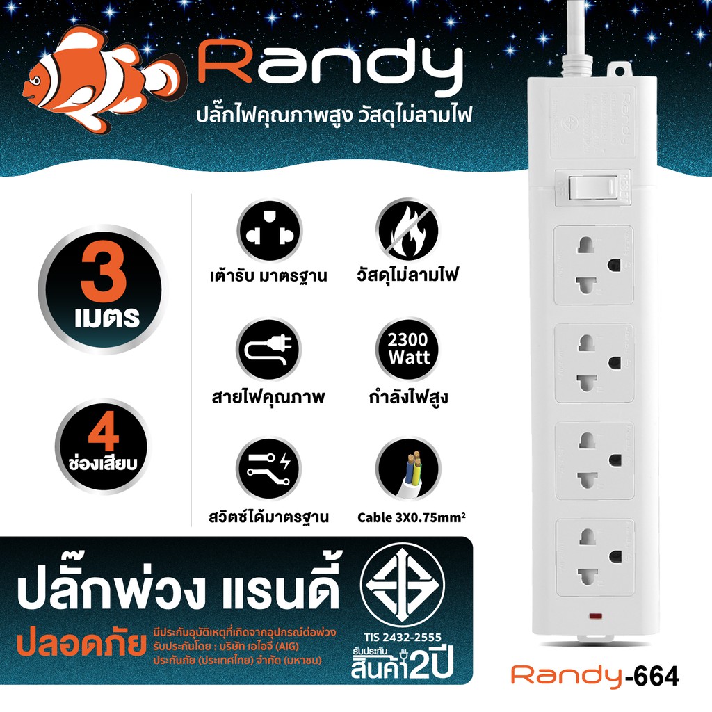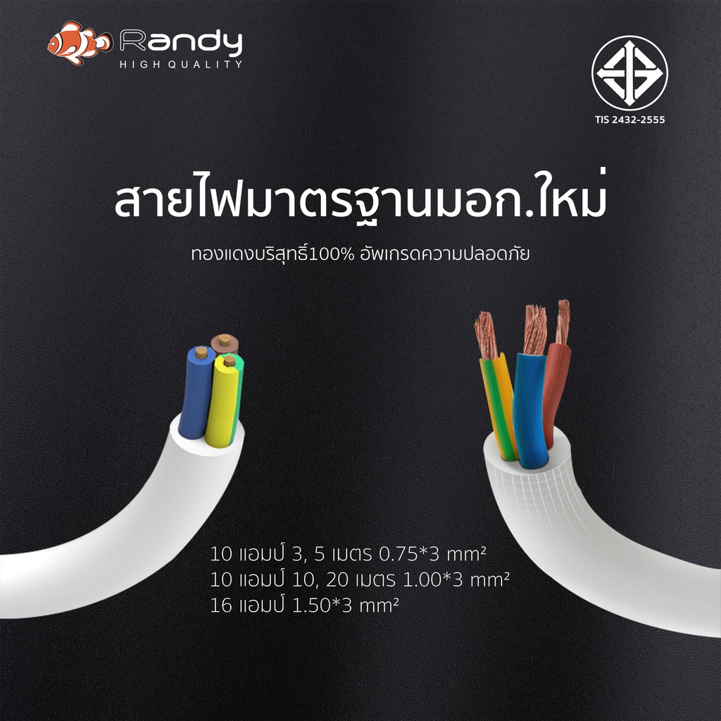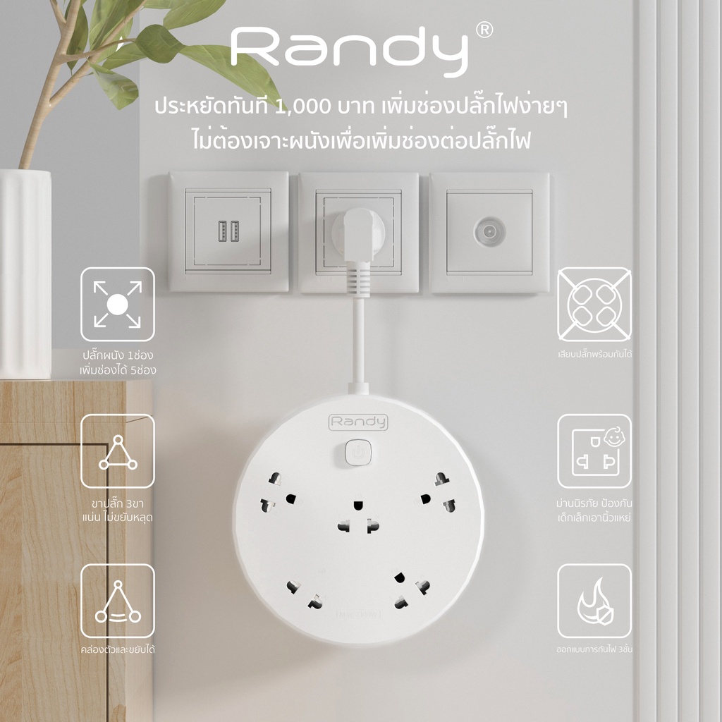 Randy 2-6ช่อง ปลั๊กไฟ มอก. กันไฟสองชั้น ปลั๊กพ่วง 3M 5M 10M มี USB 10A2300W 100%ทองแดง วัสดุทนไฟ