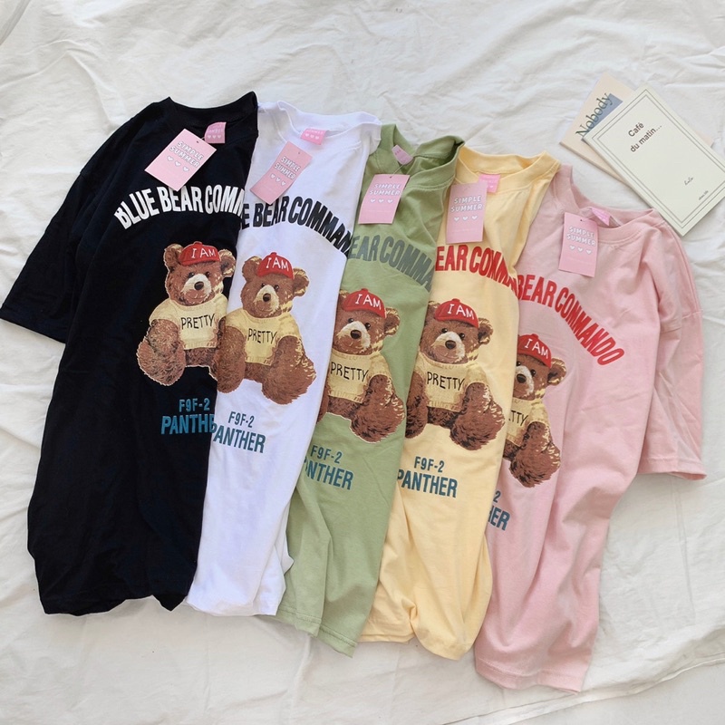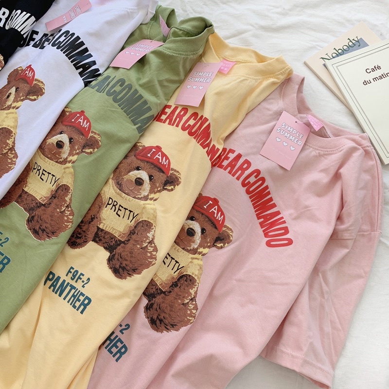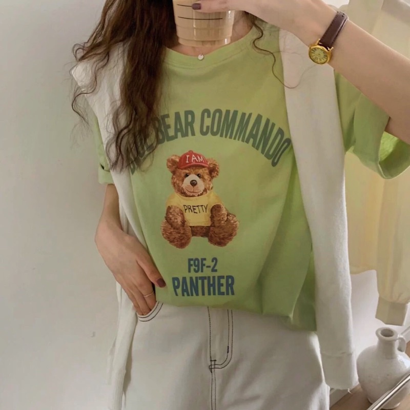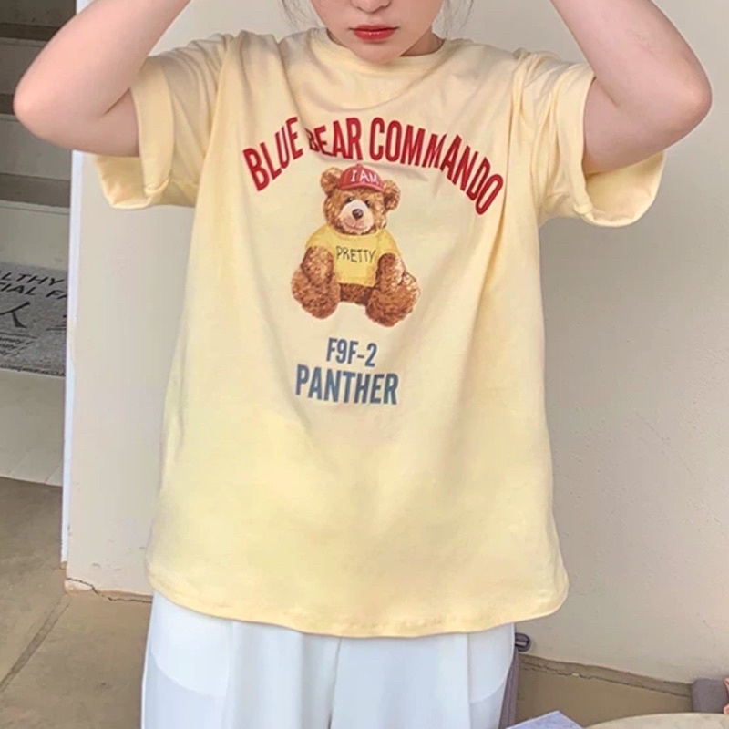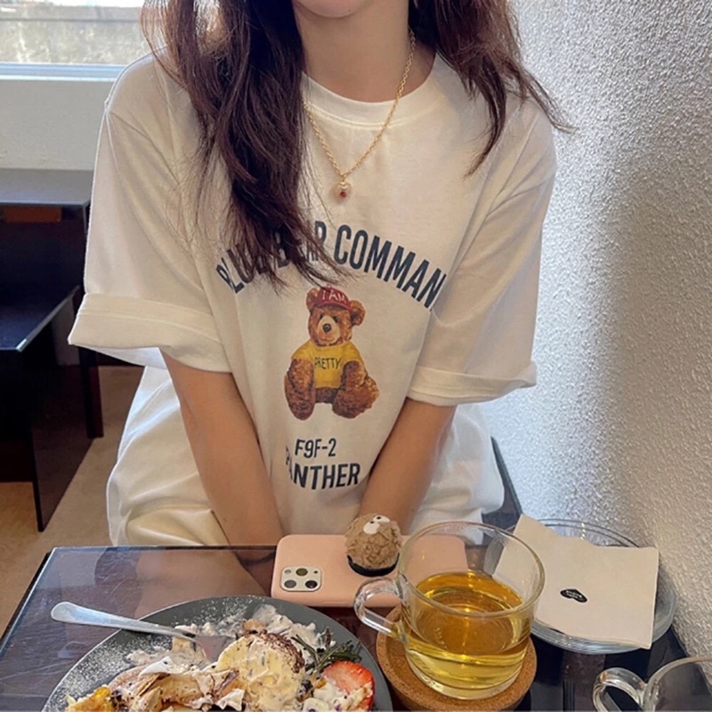 พร้อมส่ง ผ้าคอตตอน⚾️เสื้อยืด oversize ปักลายสไตล์มินิมอล ลายหมีหมวกแดง