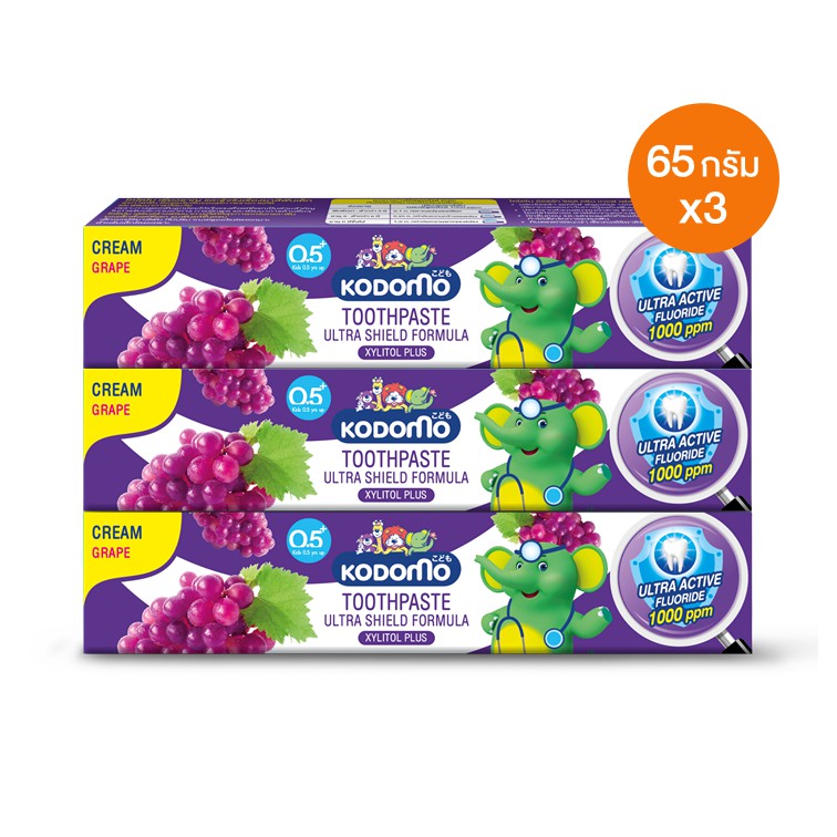 [ 3ชิ้น ] KODOMO ยาสีฟันเด็ก โคโดโม ชนิดครีม สูตรอัลตร้า ชิลด์ ฟลูออไรด์ 1000 ppm กลิ่นองุ่น 65 กรัม LIONSOS