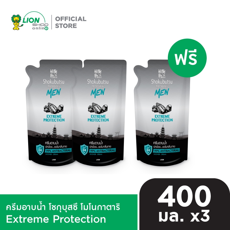2ฟรี1SHOKUBUTSUForMenครีมอาบน้ำโชกุบุสซึโมโนกาตาริสำหรับผู้ชายสูตรปกป้องระงับกลิ่นกายExtremeProtectionสีเทาถุงเติม400มล.