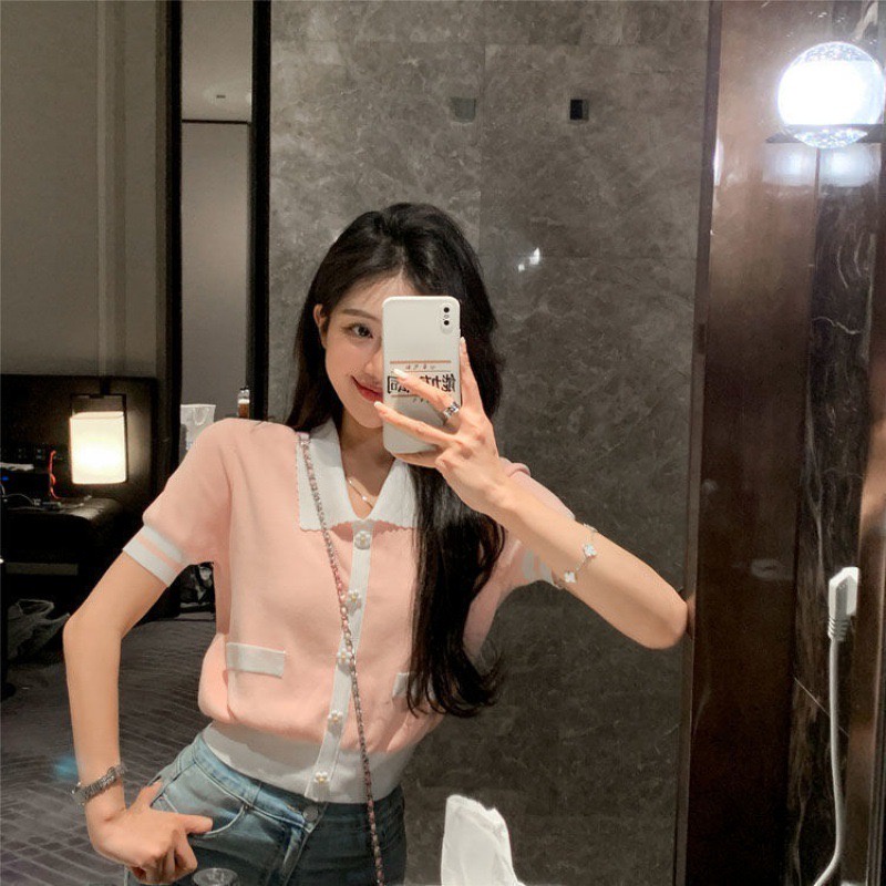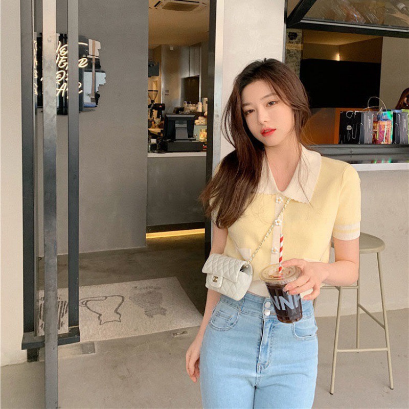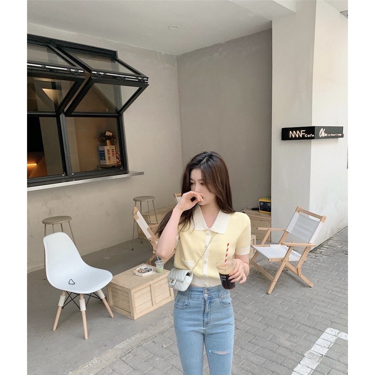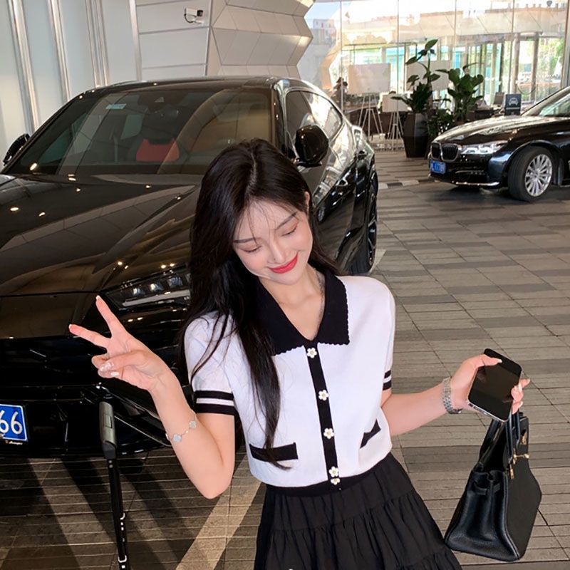 เสื้อไหมพรมคอปกแขนสั้น เสื้อไหมพรม สไตล์เกาหลี แบบสวมแต่งกระดุมดอกไม้ เอวจั๊ม มี3สี