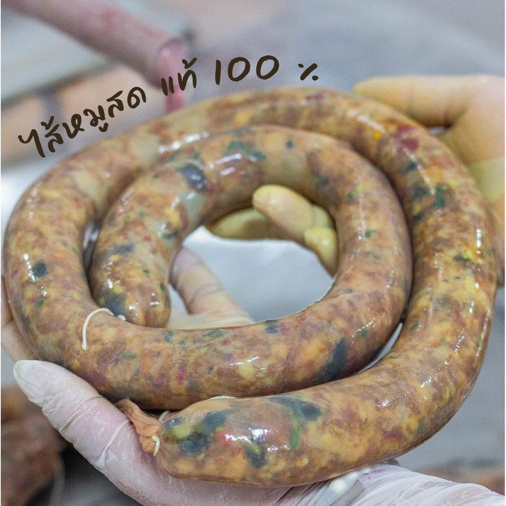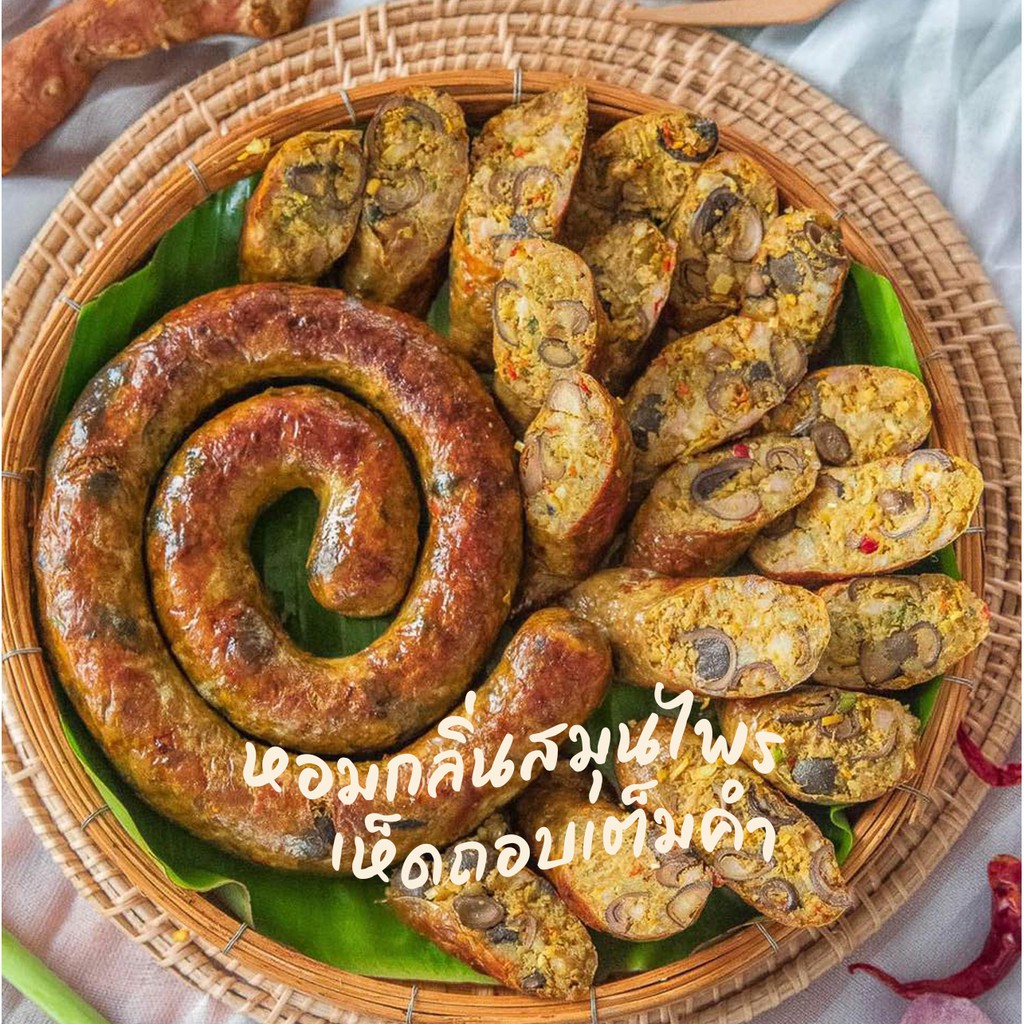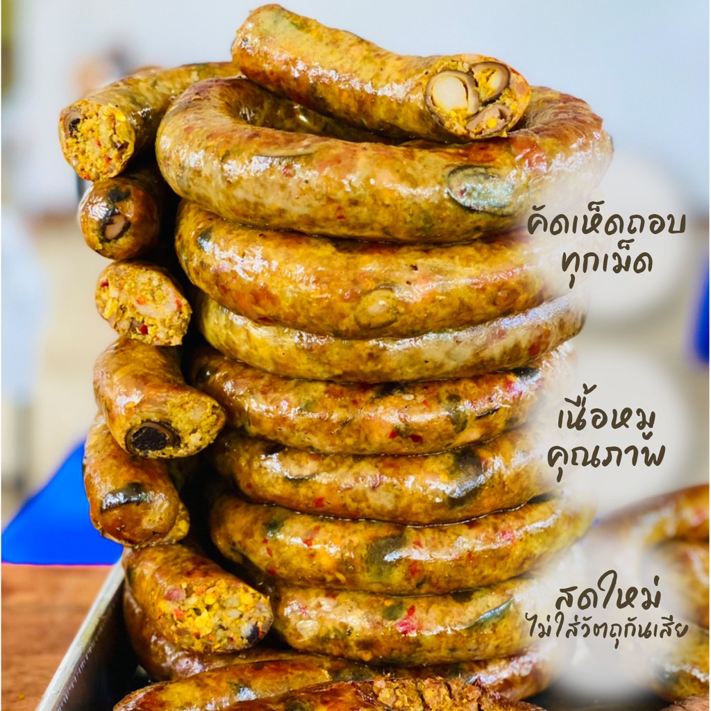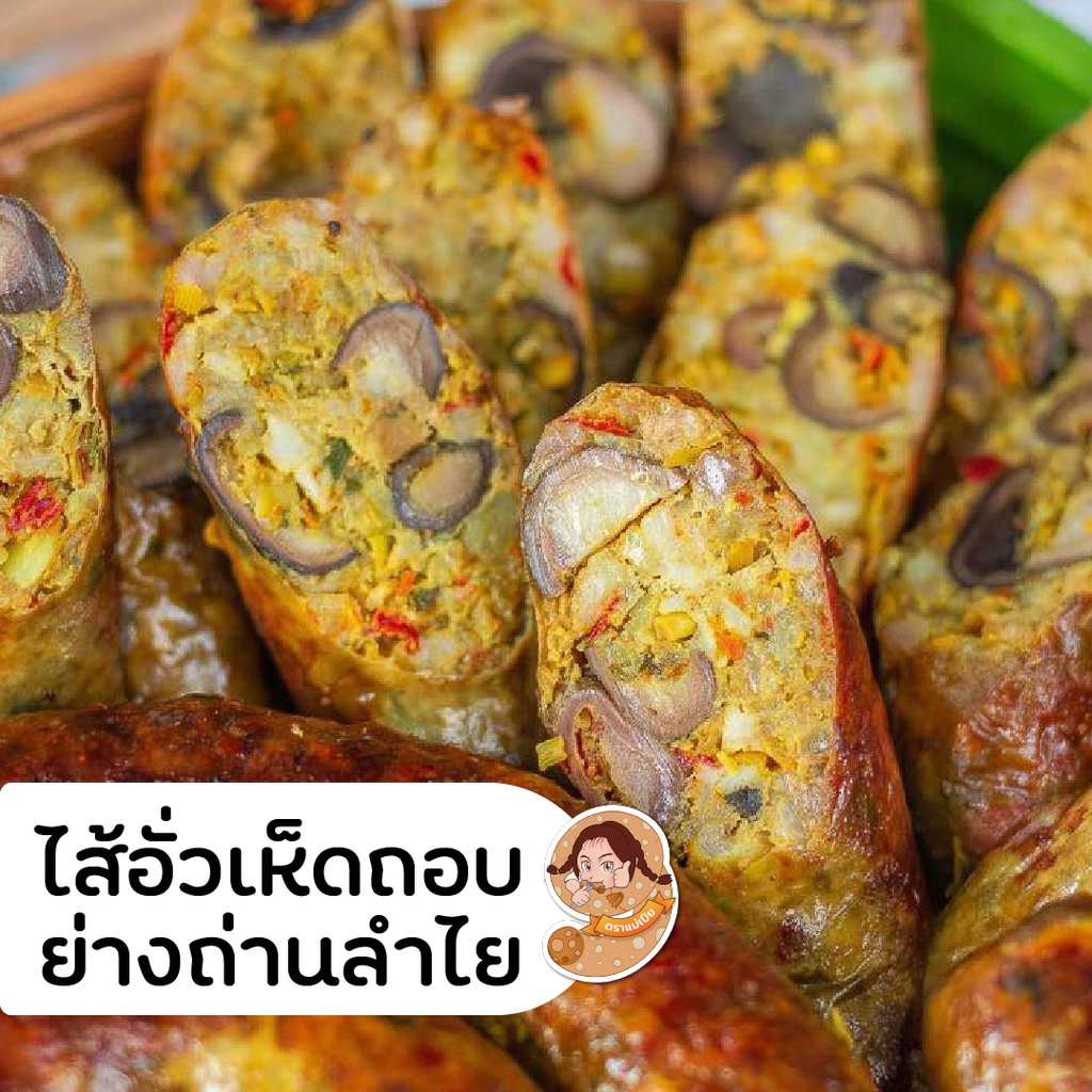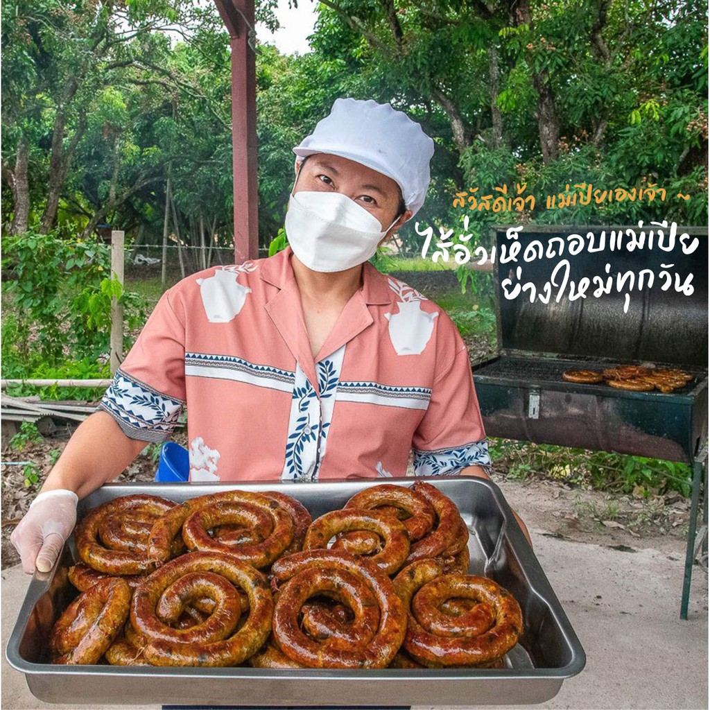ไส้อั่วเห็ดถอบย่างถ่านลำไย ตราแม่เปีย ไม่ใส่สารกันบูด มันน้อย ขนาด 300 กรัม