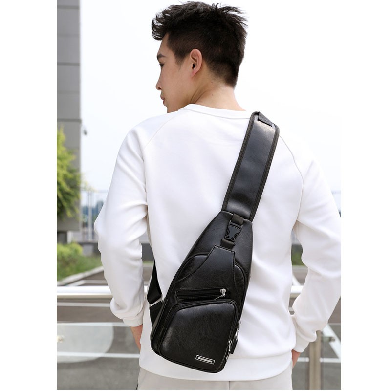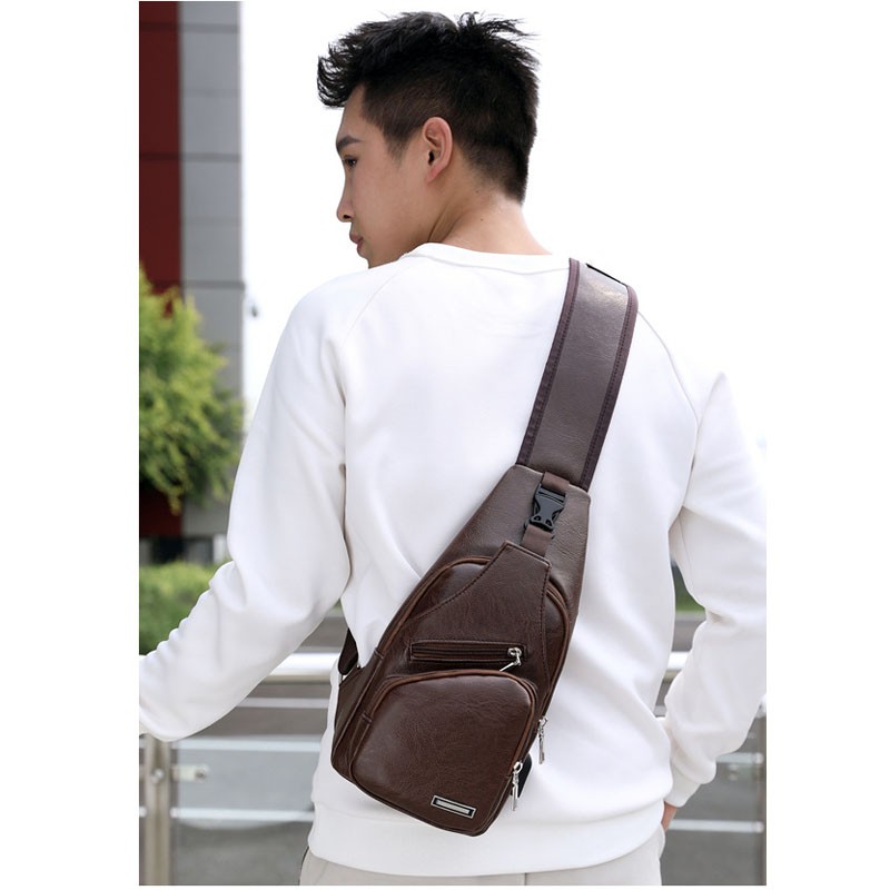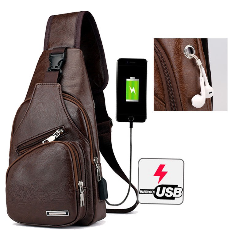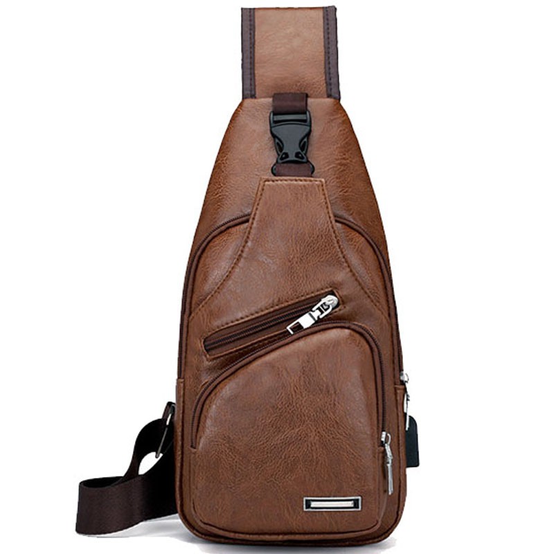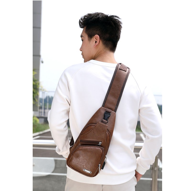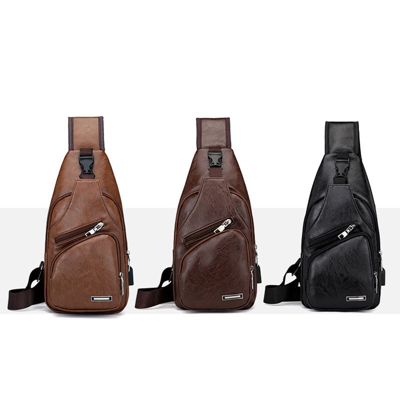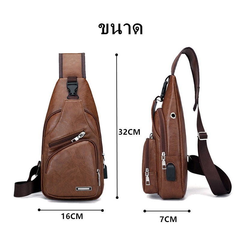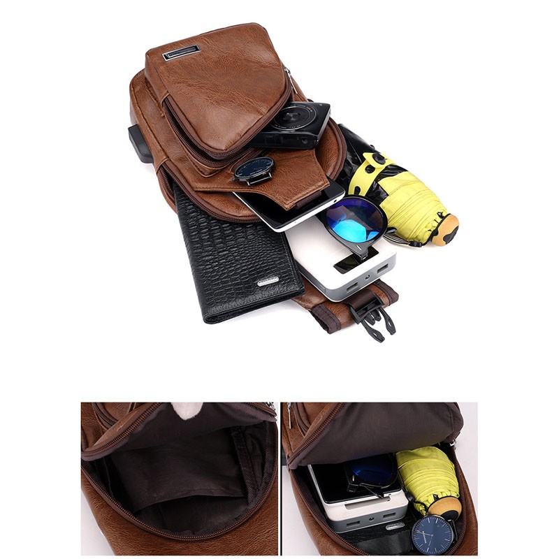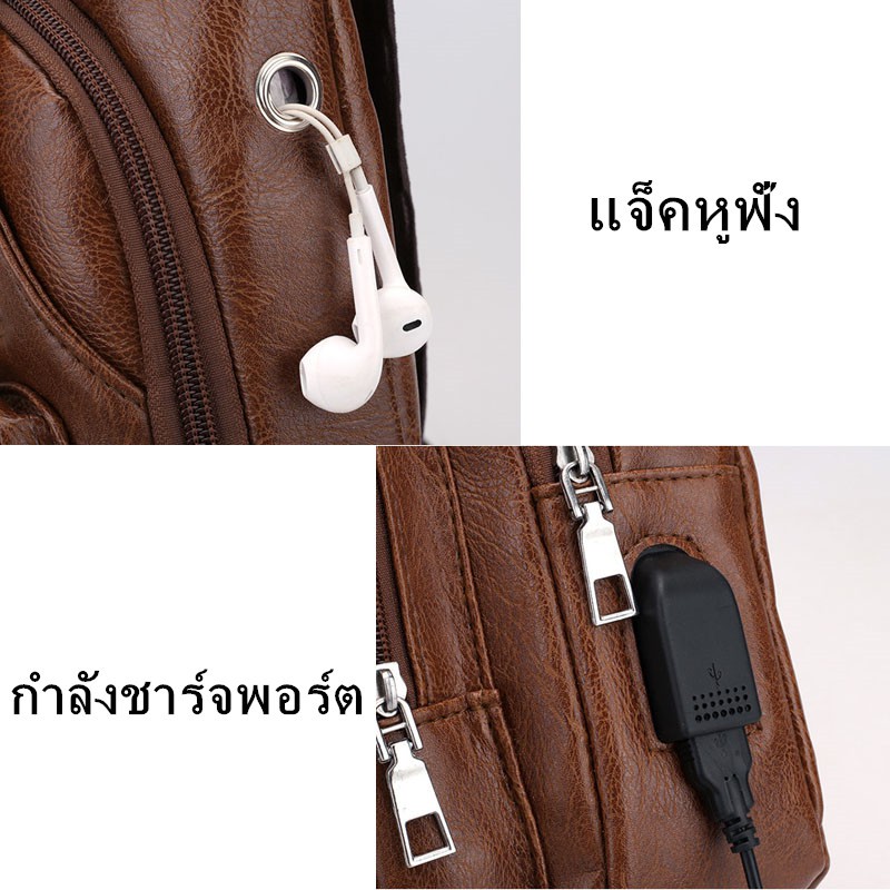 กระเป๋าสะพายหนังเย็นสบาย ๆ แฟชั่นผู้ชายกระเป๋า Messenger USB ชาร์จหลุมหูฟังภายนอกมัลติฟังก์ชั่ความจุขนาดใหญ่