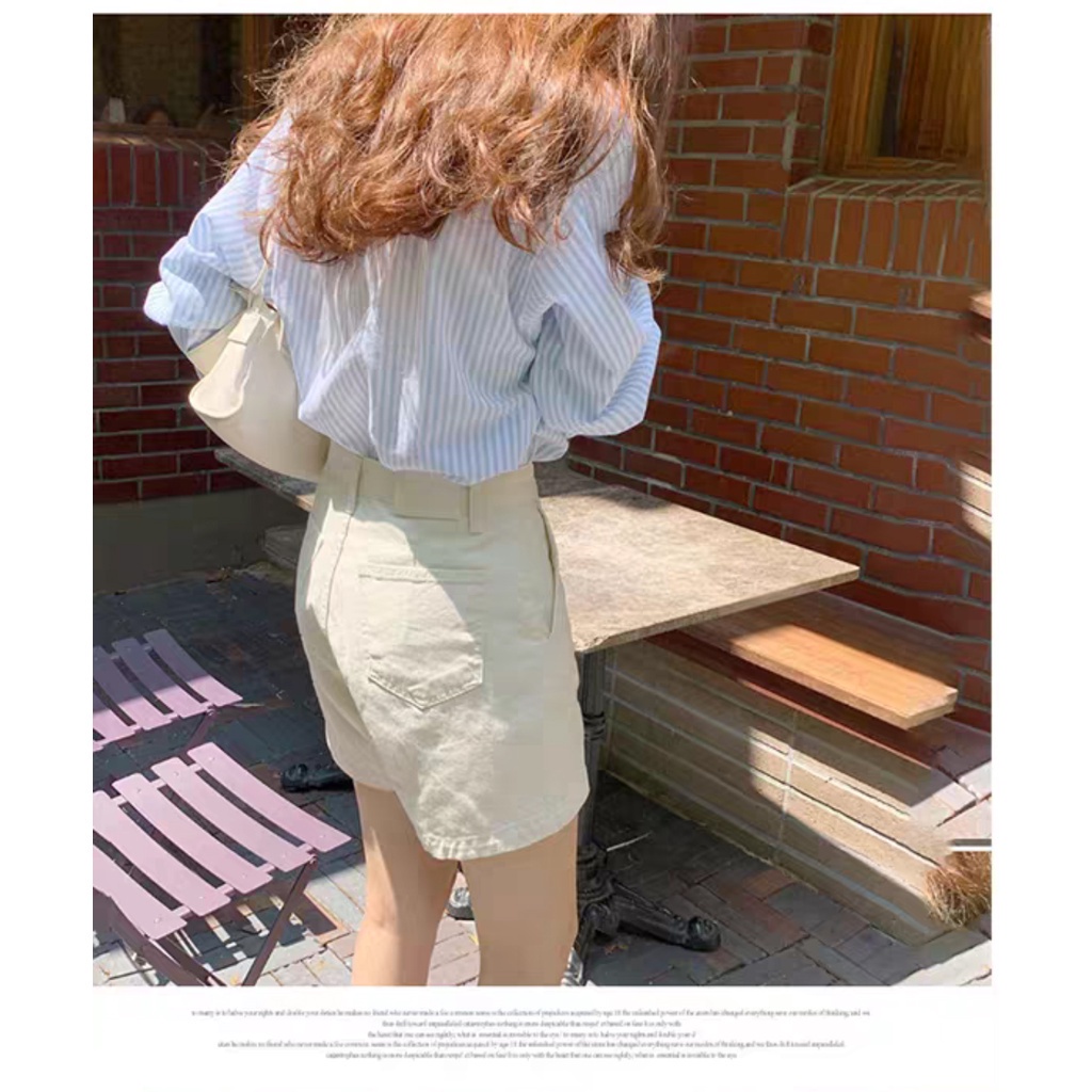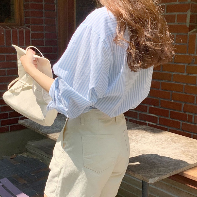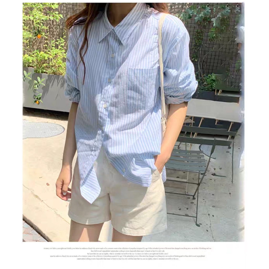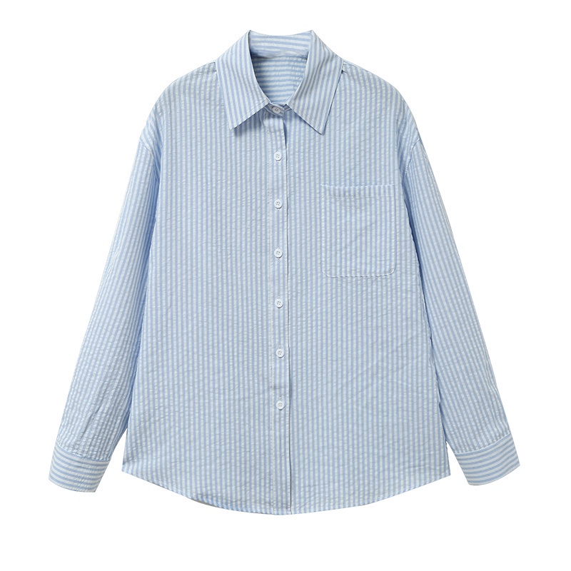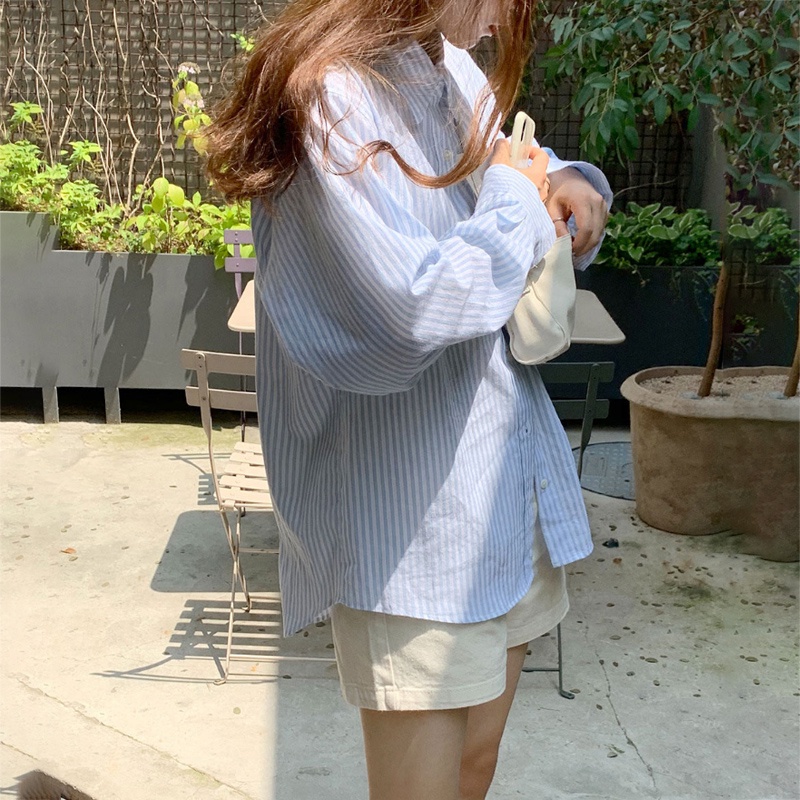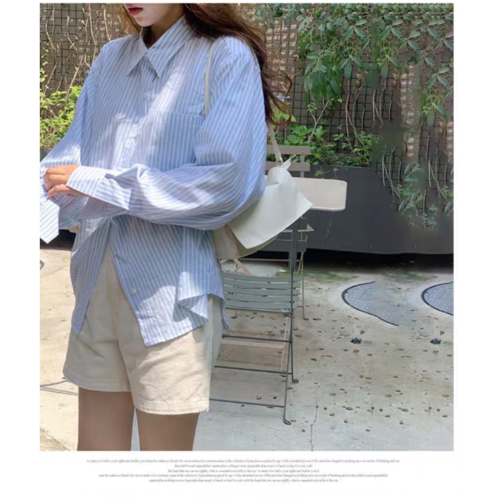 แขนยาวทุกการแขงขันใหม เสือเชิตลายทางผูหญิงเกาหลีหลวมสบายๆเสื อสีฟา