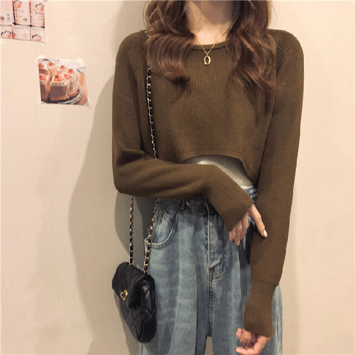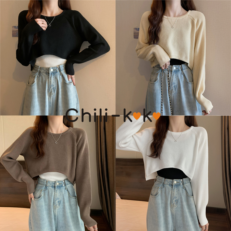 KOKO❤️เสื้อกันหนาวไหมพรมแขนยาว คอกลม ตัวสั่น โชว์เอว ผ้าไหมพรมชักร่องแต่งลายในตัว 9572