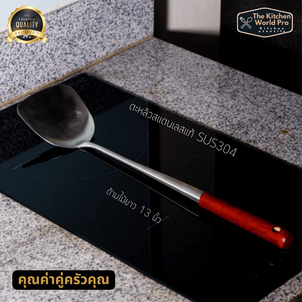 ตะหลิว สแตนเลสเนื้อหนา ทำจากสแตนเลสแท้ SUS304 ไม่เป็นสนิม คุณภาพแข็งแรง คุณภาพดี ด้ามจับไม้ยาว13นิ้ว ใช้คู้กับกระทะเหล็ก