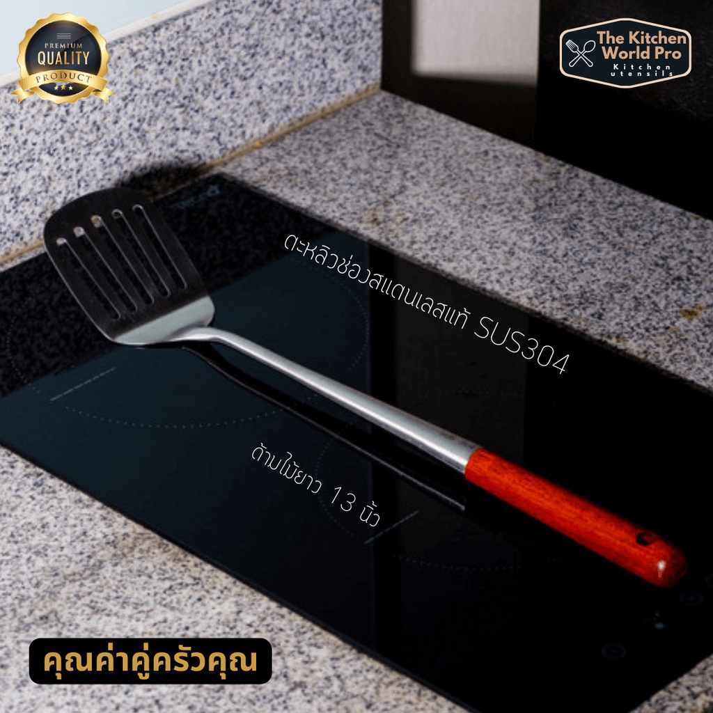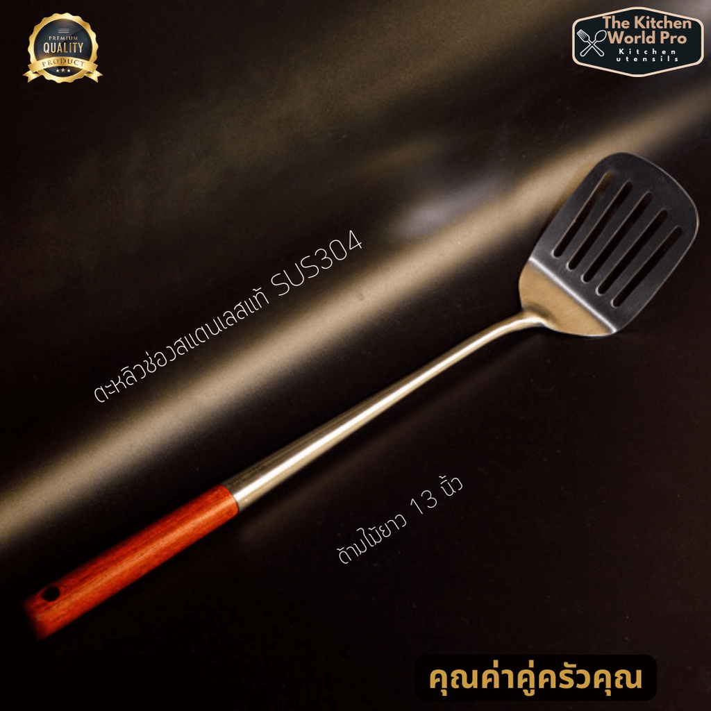 ตะหลิวสแตนเลส มีช่องสำหรับทอดเนื้อหนา คุณภาพแข็งแรง ด้ามจับไม้ ยาว13นิ้ว ส่งฟรี