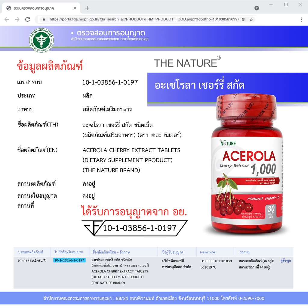 [ซื้อ 1 แถม 1] วิตามินซี อะเซโรล่า เชอร์รี่ สกัด 1000 mg Acerola Cherry Extract เดอะ เนเจอร์ THE NATURE อะเซโรลา