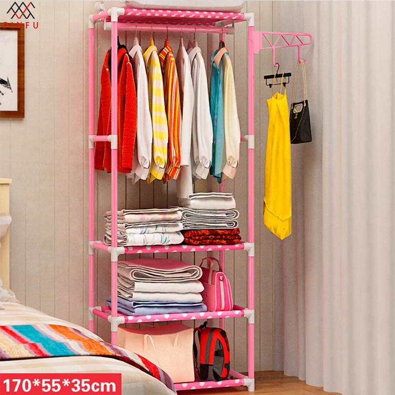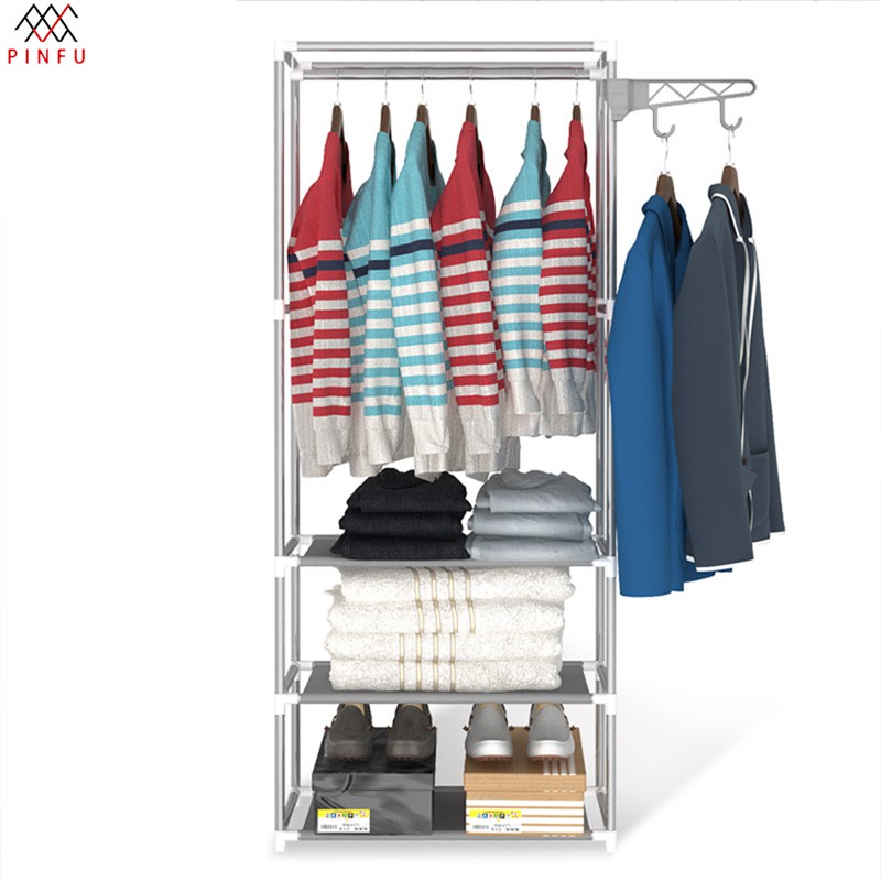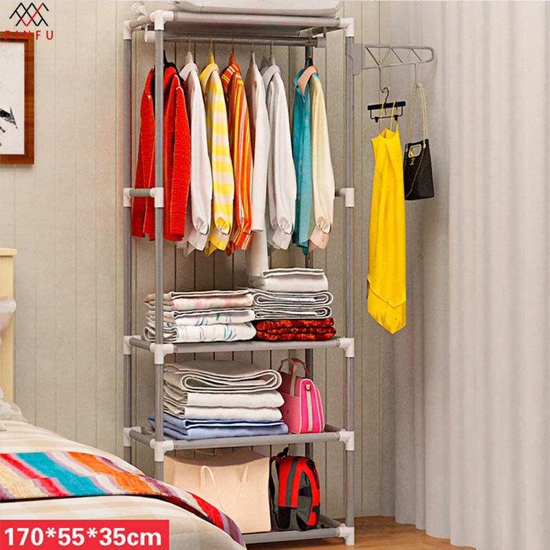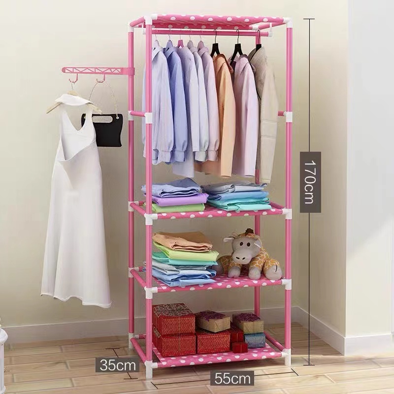 PINFU_SHOP K-203 ราวแขวนผ้า 4เหลี่ยม ราวแขวนเสื้อผ้า พร้อมชั้นวาง 4ชั้น และที่แขวนกับตะขอเสริม