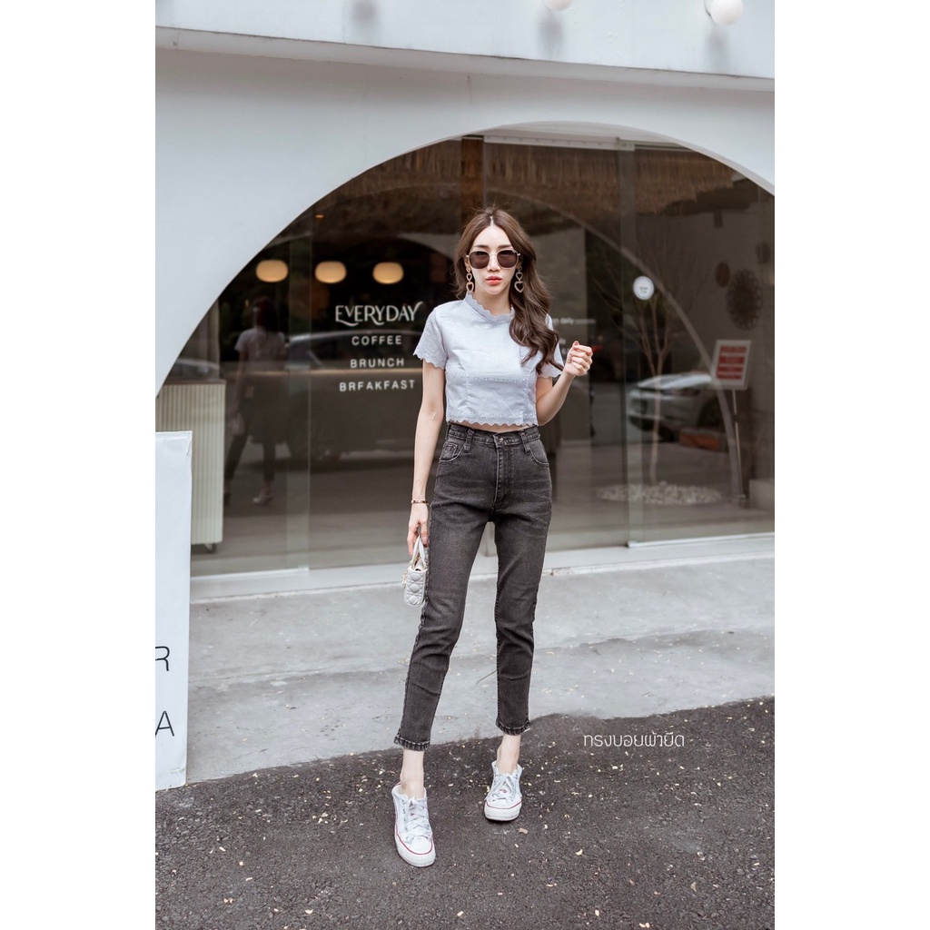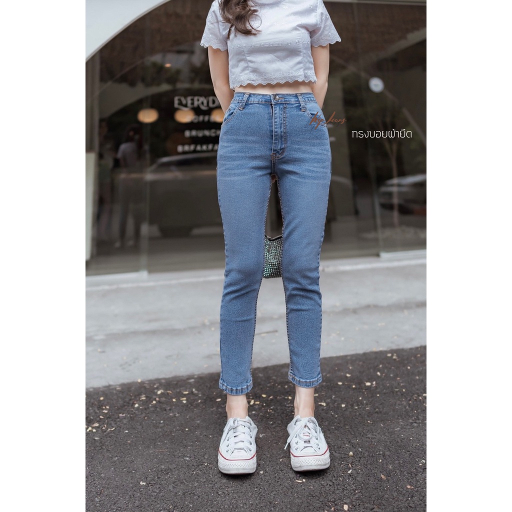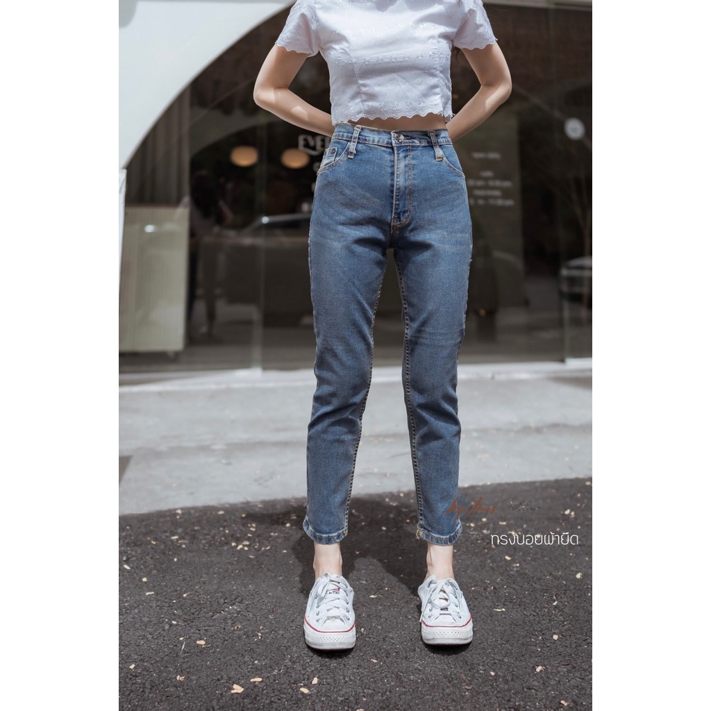 📌 กางเกงยีนส์ผู้หญิงทรงบอยเอวสูงผ้ายืดทรงยอดฮิต 😎 แฟชั่นผญ เกาหลี ขายาว boyfriend slim fit กางเกงยีนส์ผู้หญิง