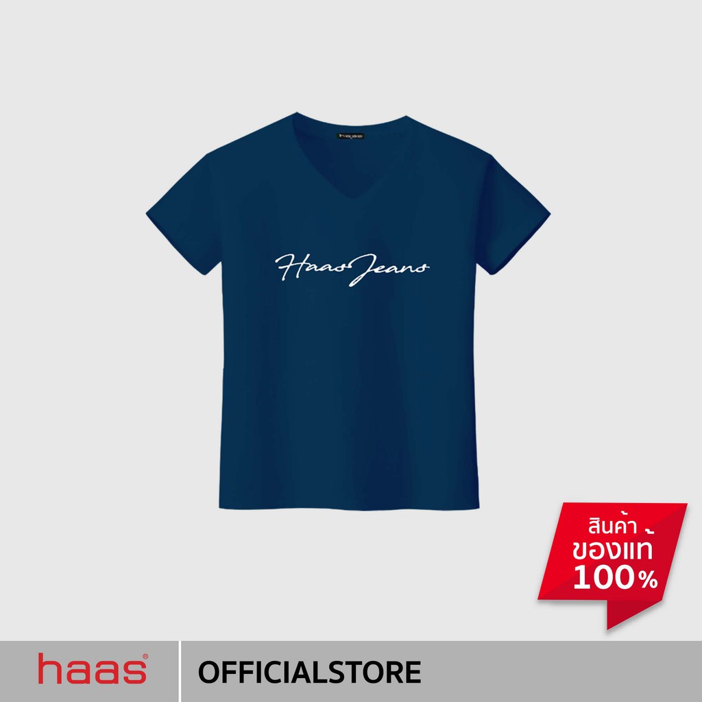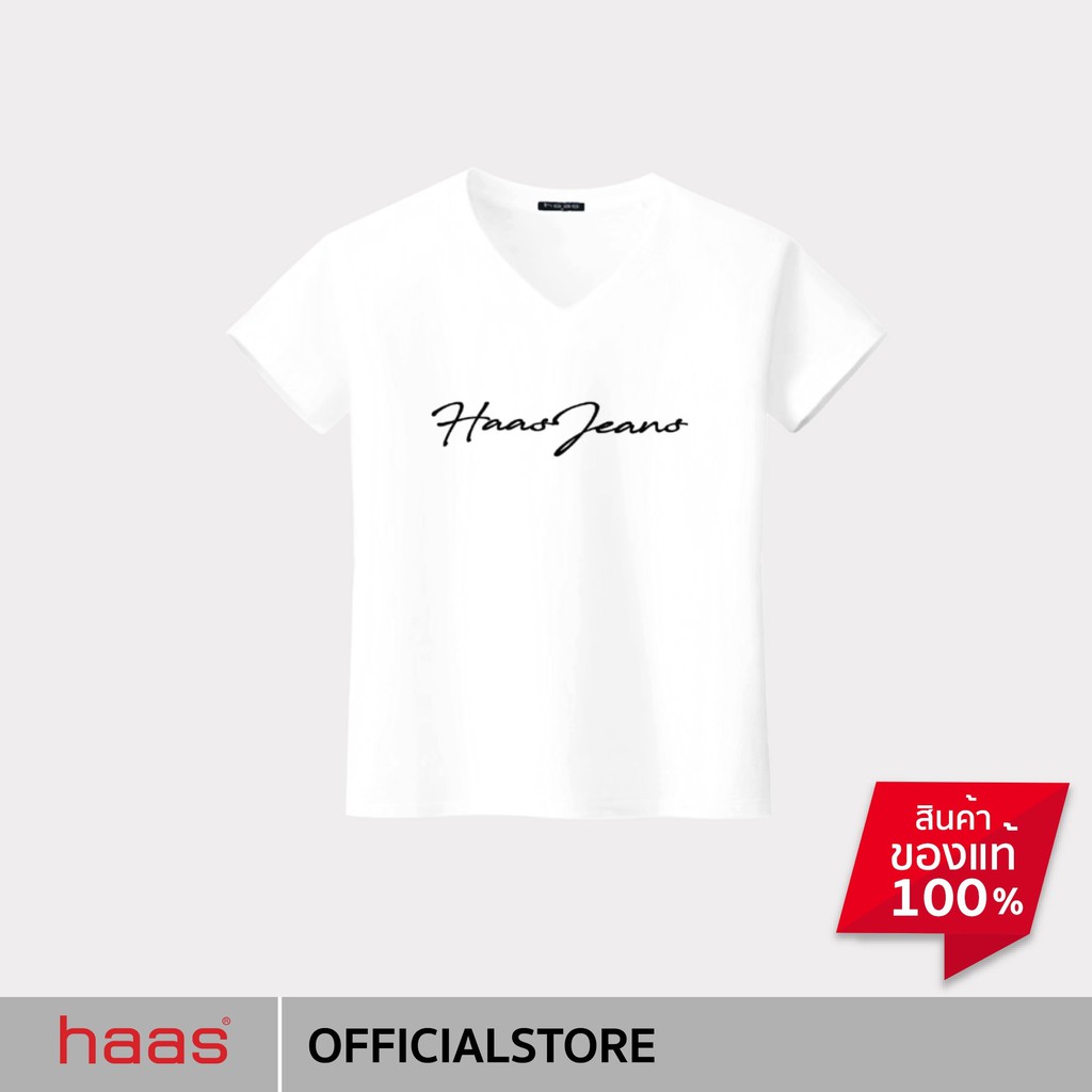haas เสื้อยืดผู้หญิง คอวี แขนสั้น ลายสกรีน Haas Jeans HHVK2320