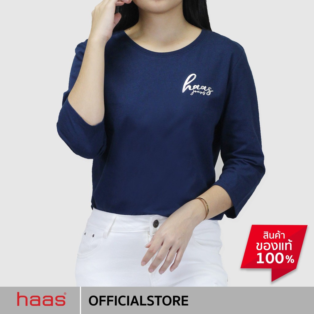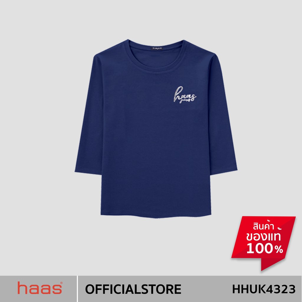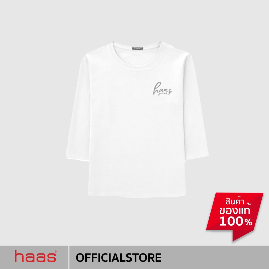 haas เสื้อยืดแขนยาว ผู้หญิง แขนสามส่วน ลายสกรีน haas HHUK4323
