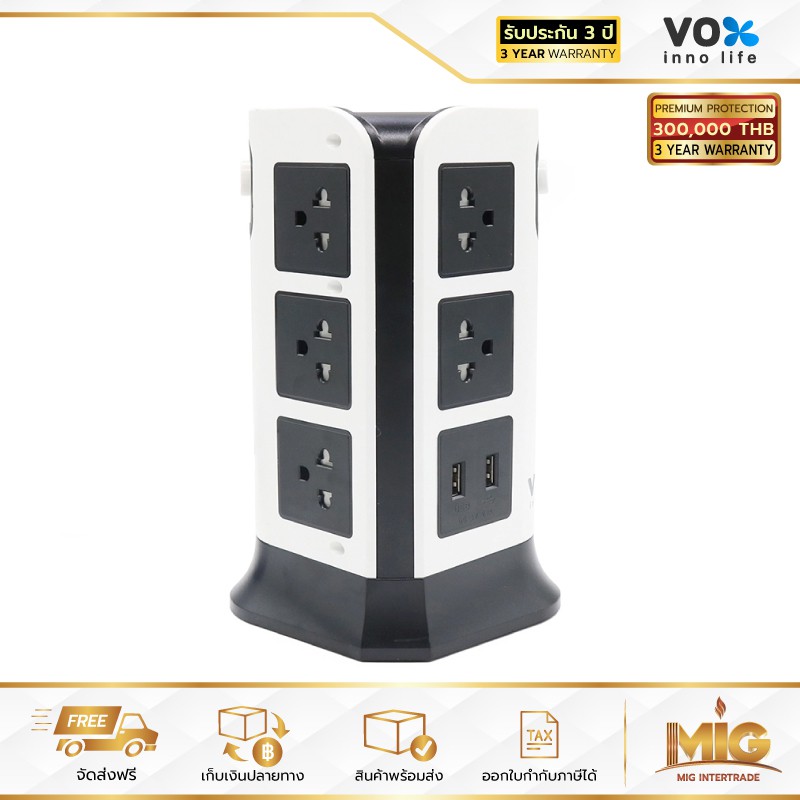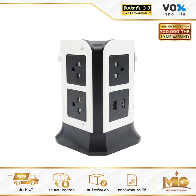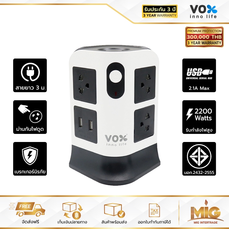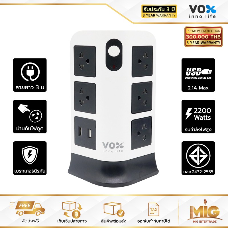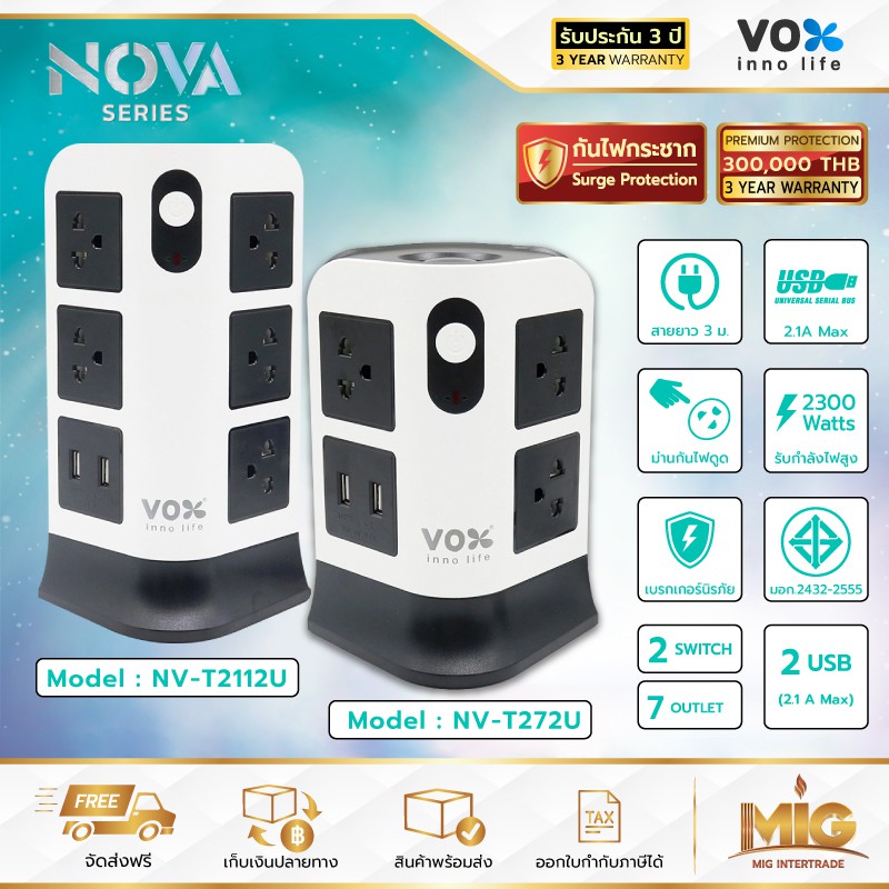 Vox ปลั๊กไฟคอนโดมาตรฐาน มอก. รุ่น NV-T272U (2 ชั้น) และ รุ่น NV-T2112U (3 ชั้น) 16A. 2300W 3M. มีกันไฟกระชาก ประกัน 3 ปี