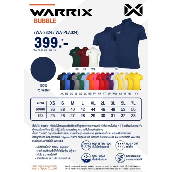 Warrix เสื้อโปโลลำลอง รุ่น Bubble สีทีมชาติ ผู้ชาย ผู้หญิง (WA-3324)