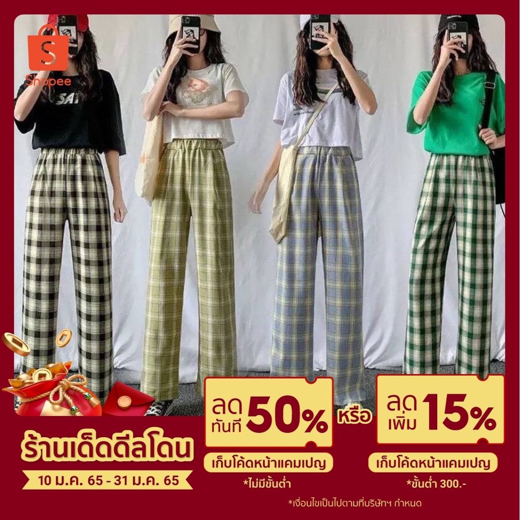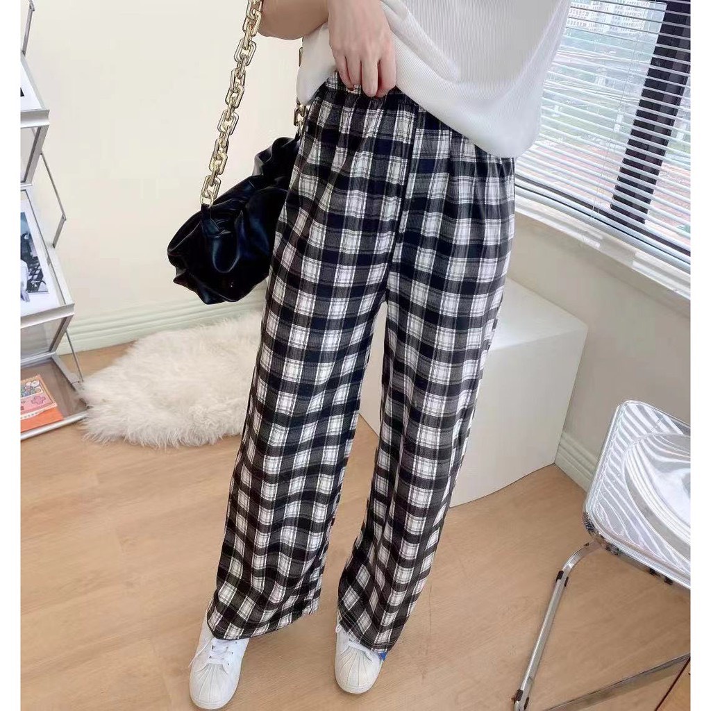 ถูกที่สุด-กางเกงลายสก็อต สไตล์เกาหลี ขายาวเอวสูง ทรงกระบอกเอวยางยืด #355