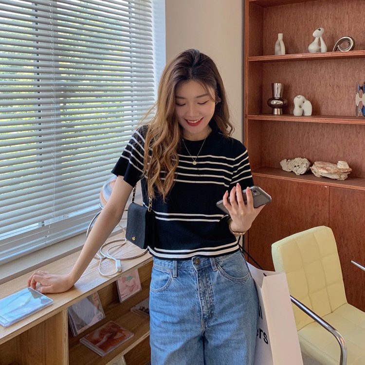 🛒FF.shop🛒 เสื้อไหมพรมแขนสั้น คอกลม แต่งลายขวาง ผ้าใส่สบาย สไตล์เกาหลี #B32