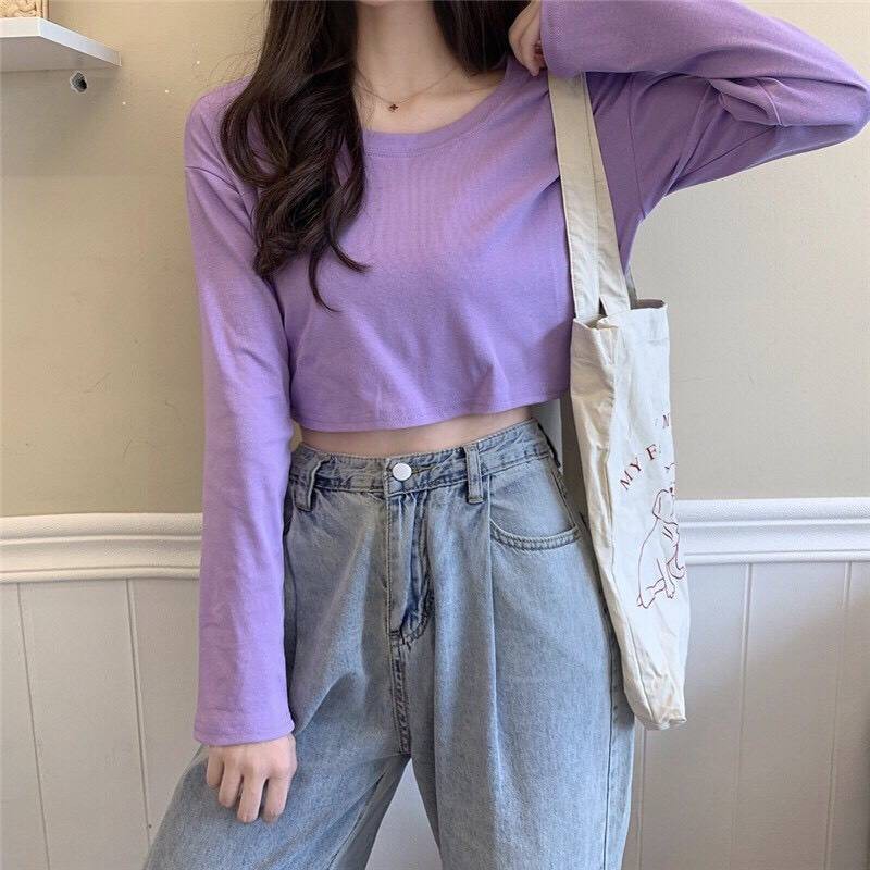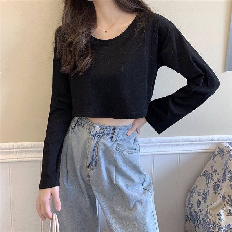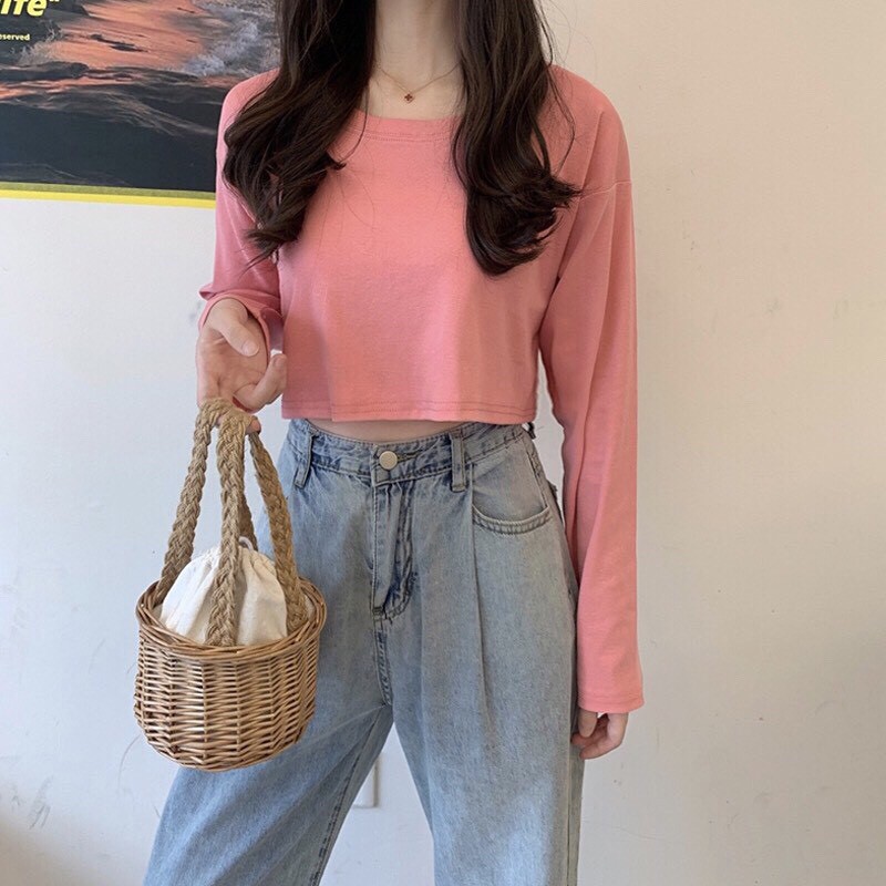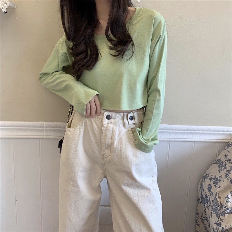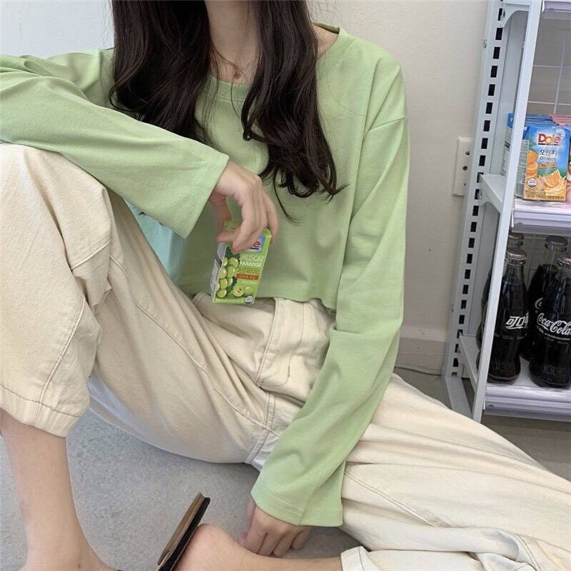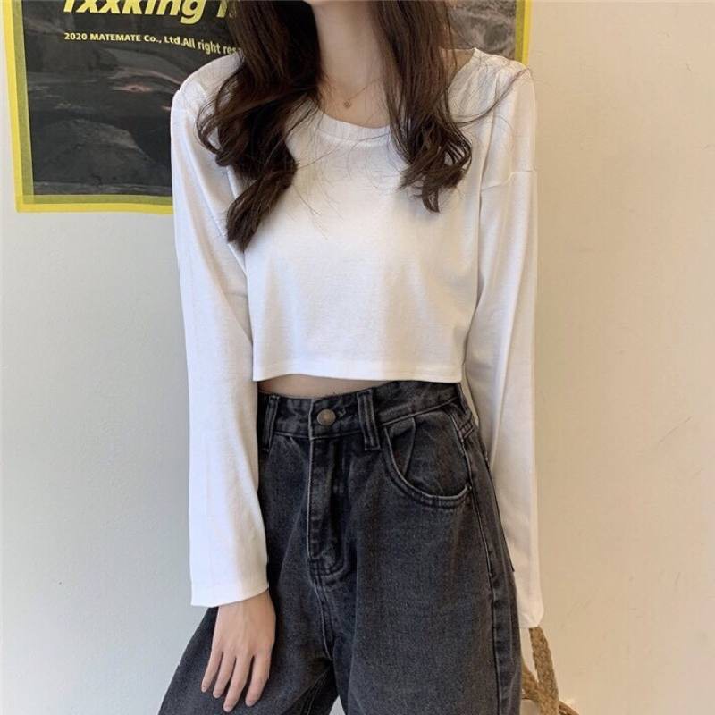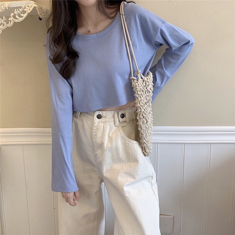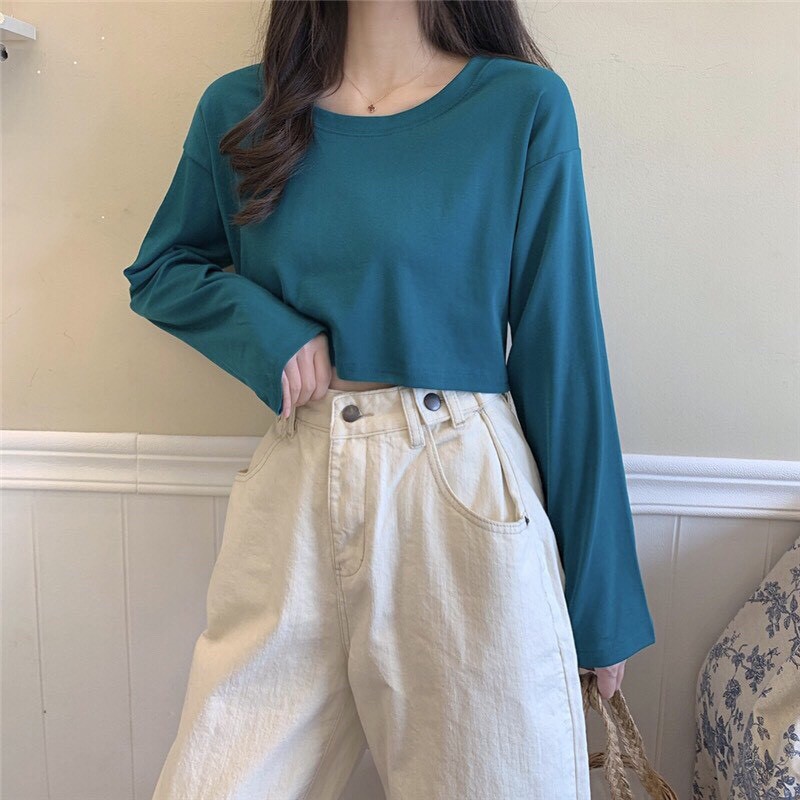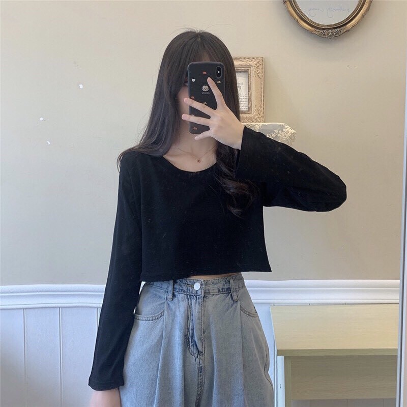 🛒FF.shop🛒 เสื้อครอปแขนยาว คอกลม คอกว้าง สไตล์เกาหลีสำหรับผู้หญิง #9019