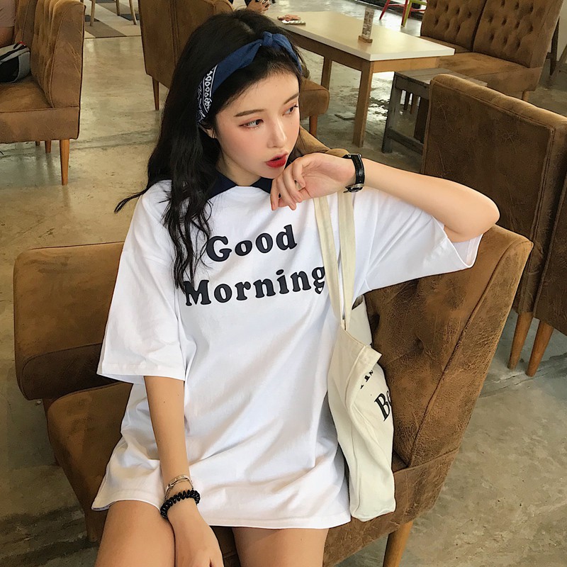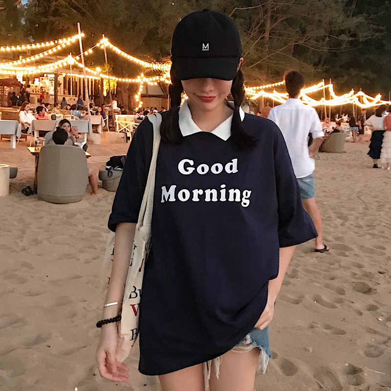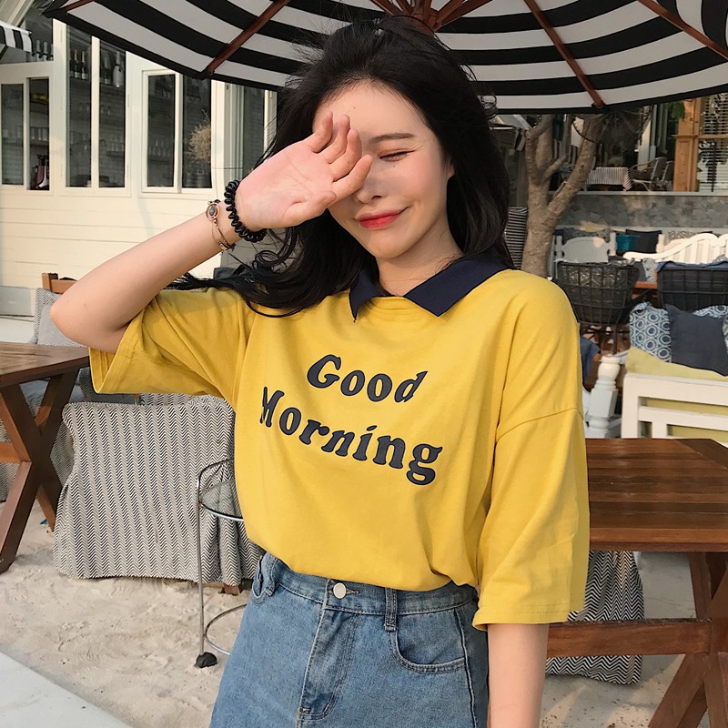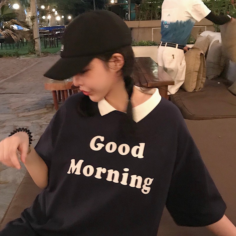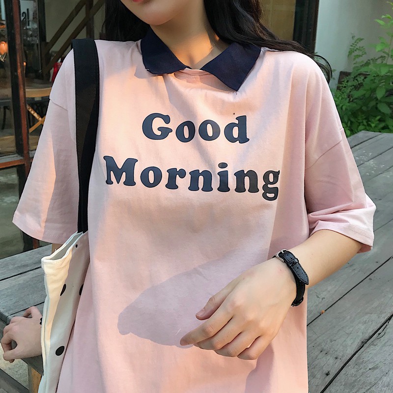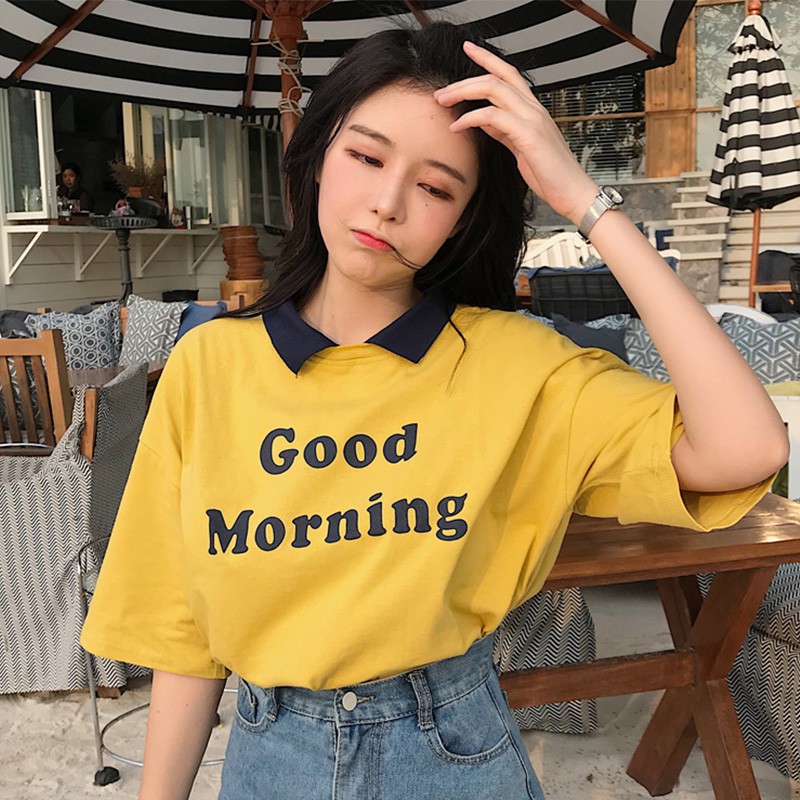 LHfashion👗 เส ื้อยืดแต่งคอปกเก๋ๆสกรีน Good morning แมทช์ได้ทุกแนวไปเลยจ้า