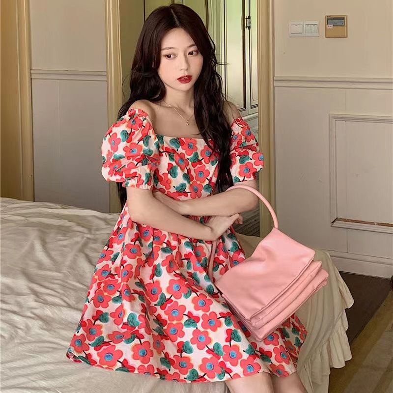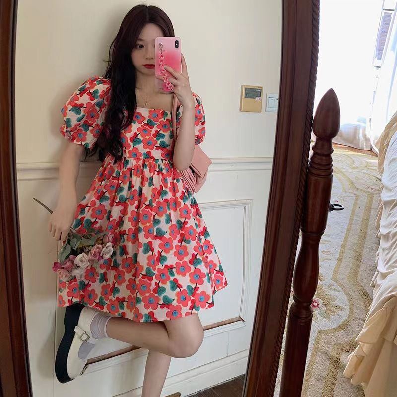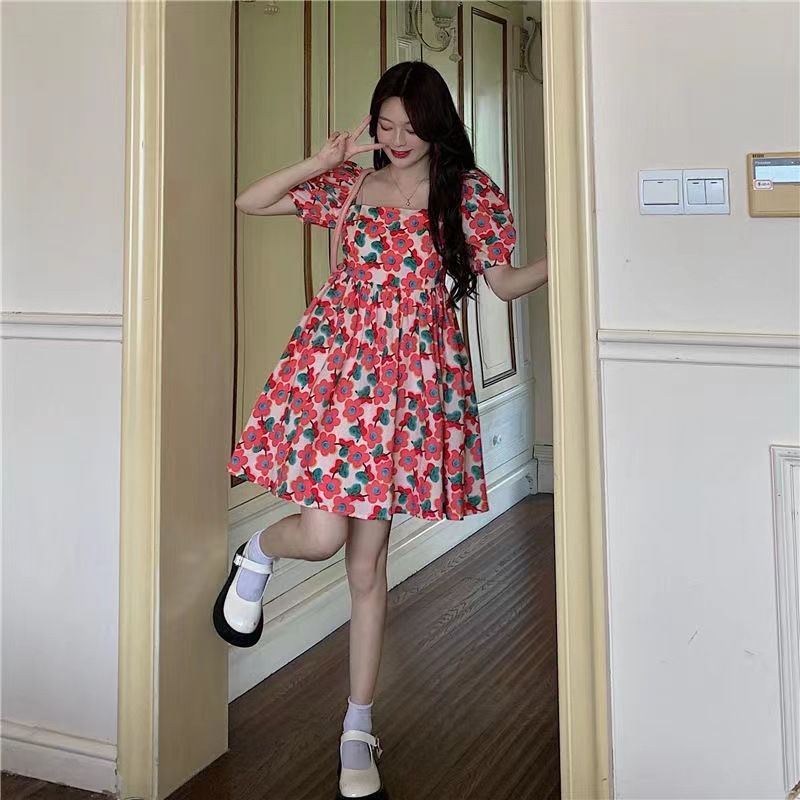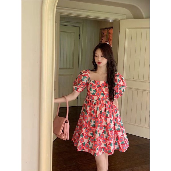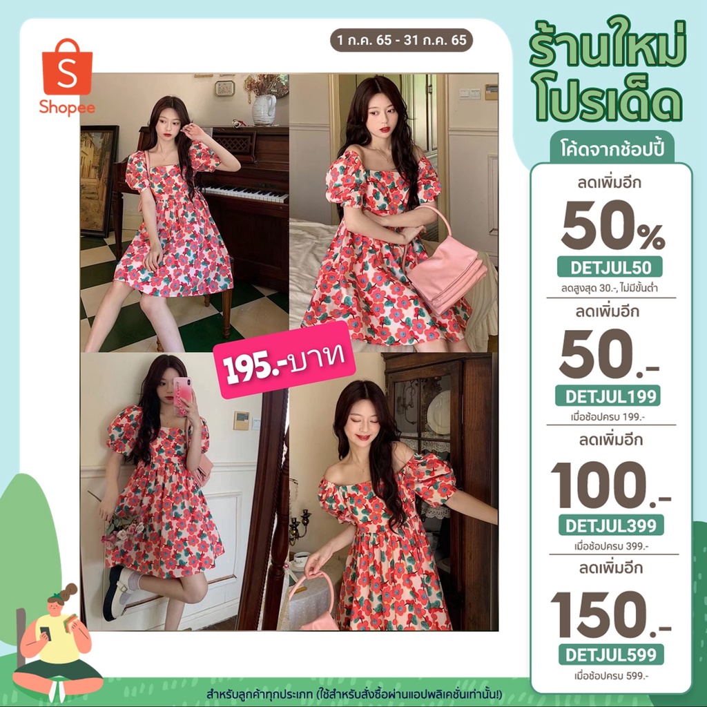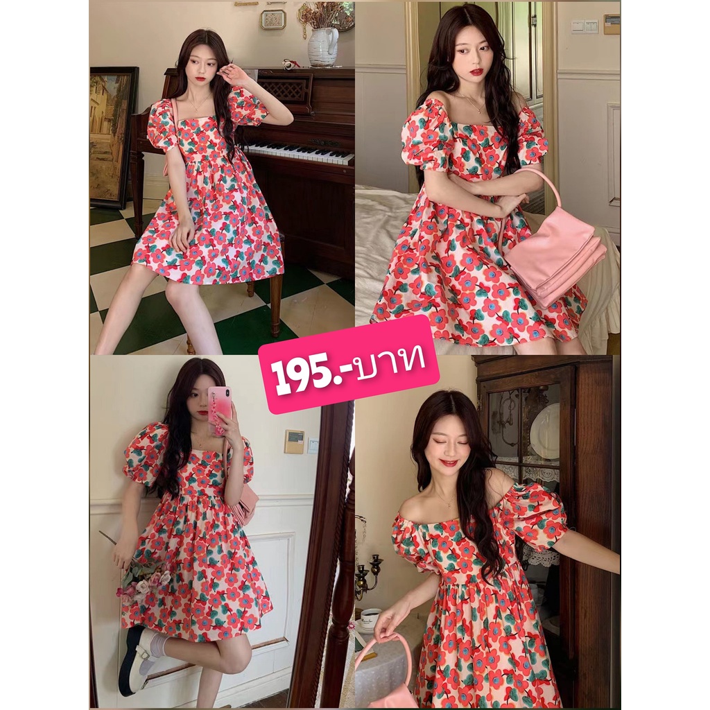 [ลด50% ใช้โค้ด INCS83L] ส่งฟรี กระโปรงลายดอก 👗เดรสหลายดอกชมพู ผ้าโพลีเอสเตอร์พิมพ์ลาย