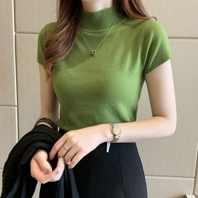 mimi&didi 473 เสื้อไหมพรมแขนยาว เสื้อครอป คอเต่า แขนสั้น สีพื้น เนื้อผ้าบางไม่มาก สไตล์รัดรูป เหมาะสำหรับสาวOffice