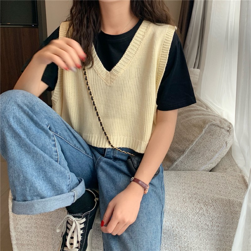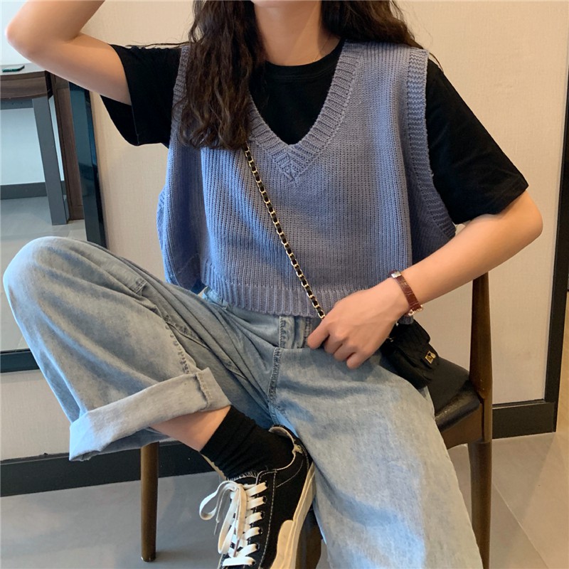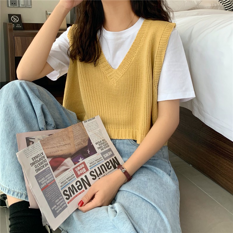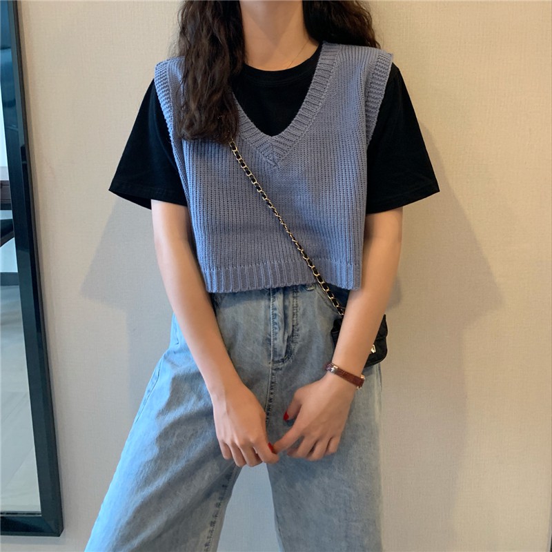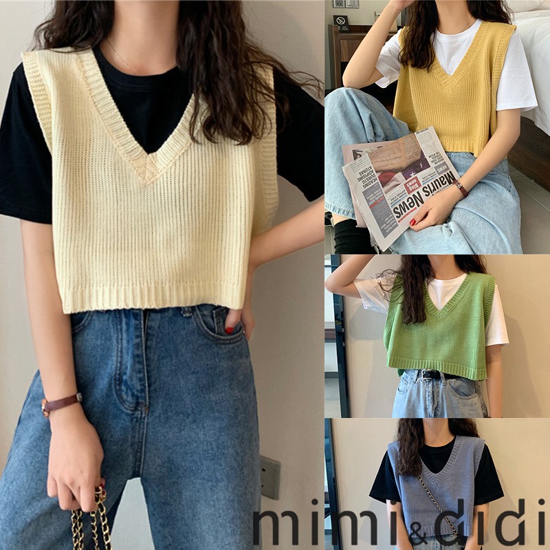 MIMI 73031 เสื้อกั๊กไหมพรมผู้หญิง👍แบบสวมหัว สไตล์ย้อนยุค เสื้อครอป👯เกาหลี สำหรับผู้หญิง คอวี แขนกุด ทรงหลวม 73031
