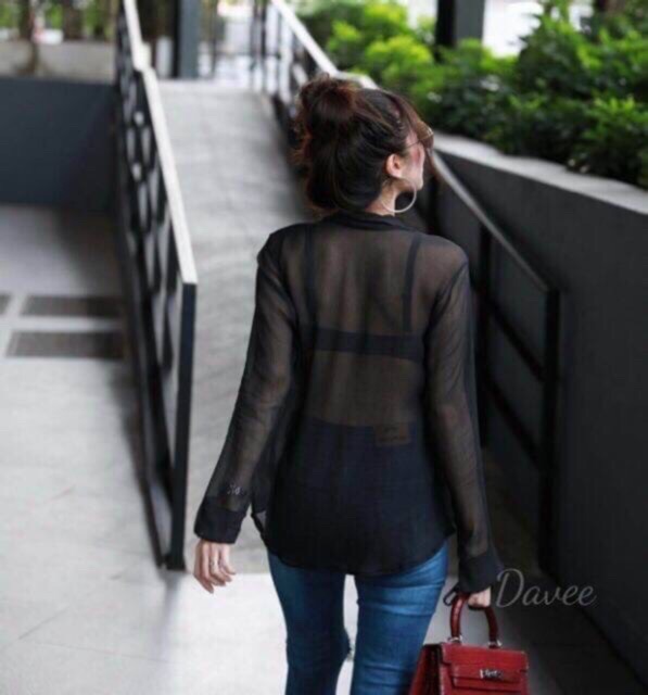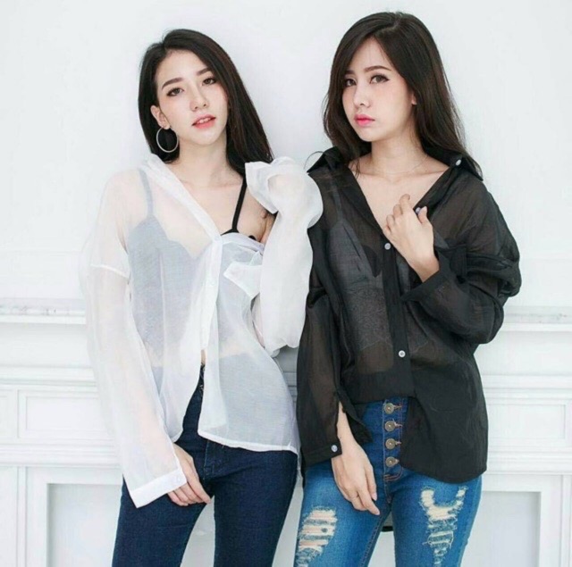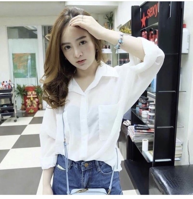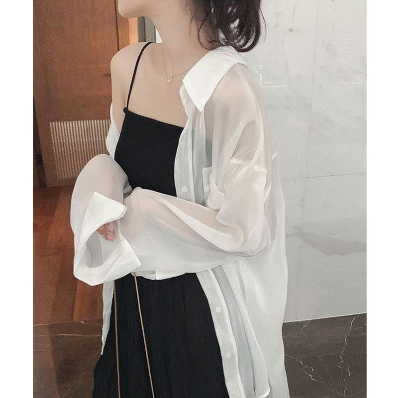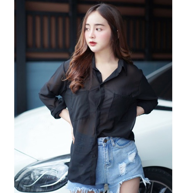 Dahong 💖 เสื้อเชิ้ตชีฟองแฟชั่น เสื้อป้องกันแสงแดด เสื้อสีขาว มีกระเป๋าหน้า2ข้าง สไตล์เกาหลี008