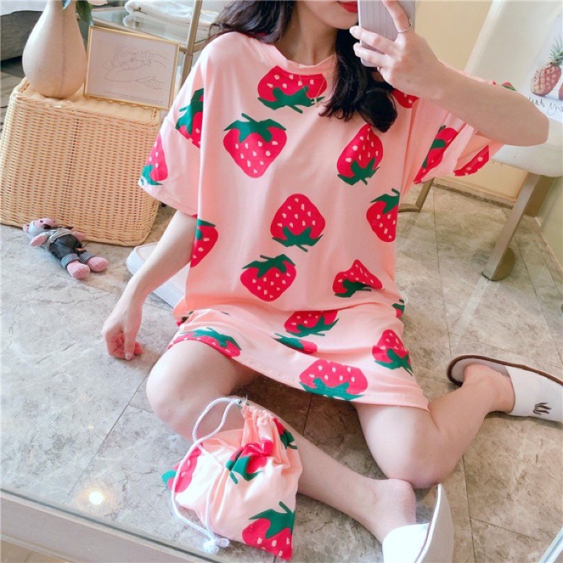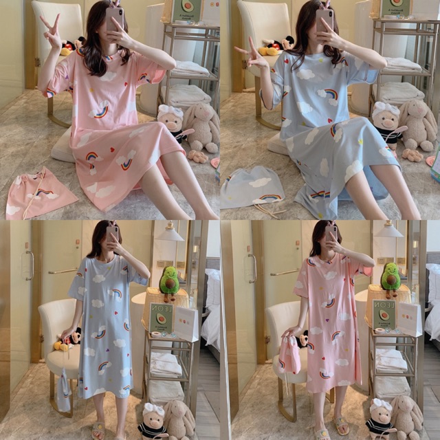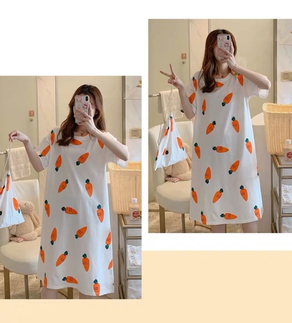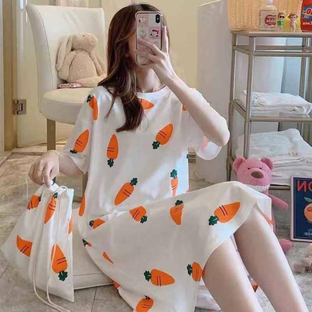 🔥พร้อมส่ง🔥ชุดนอนเดรสกระโปรง เดรสแขนสั้นลายน่ารักๆ ใส่สบาย แถมฟรีถุงผ้า