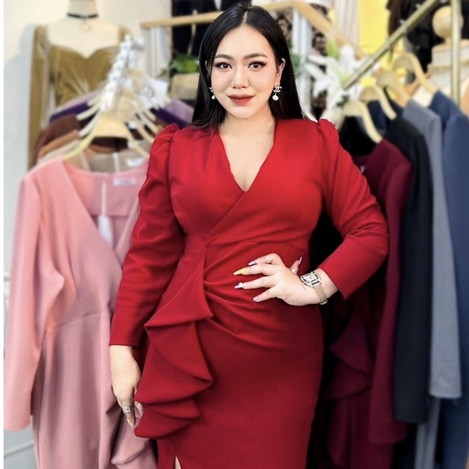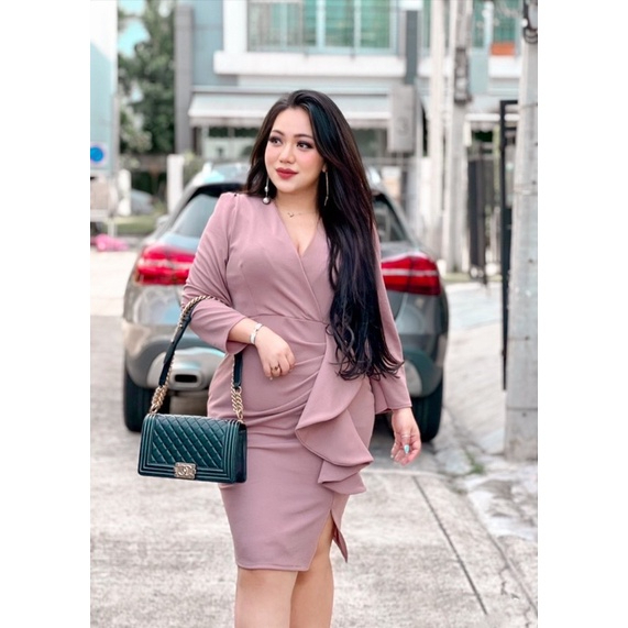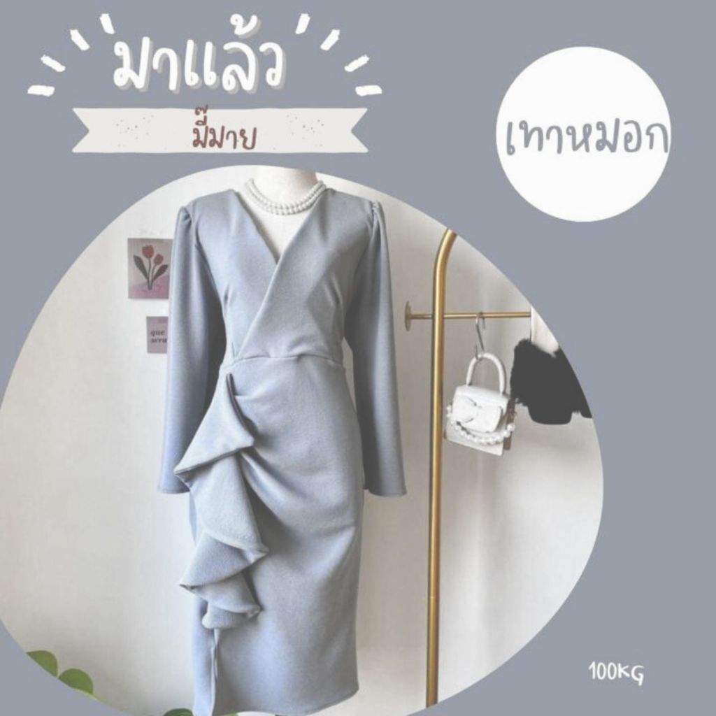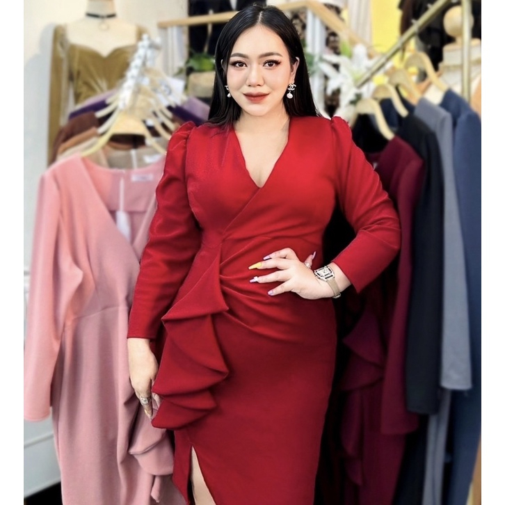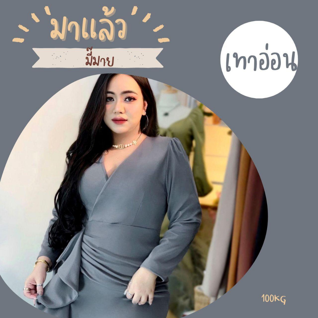 100KG PLUS SIZE เดรสสาวอวบไปออกงานดีเทลจีบเอวระบาย เดรสพรางหุ่นสาวอวบ อก38-46 รุ่น ด.มี้มาย(G51)
