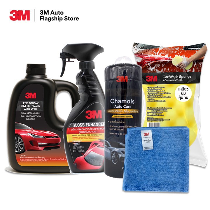 3M แชมพูล้างรถ PN39000W + เคลือบเงารถยนต์ PN39034LT + ฟองน้ำล้างรถ 3M + ผ้าชามัวส์ซับน้ำ Chamois + ผ้าไมโครฯ สีฟ้า FB270