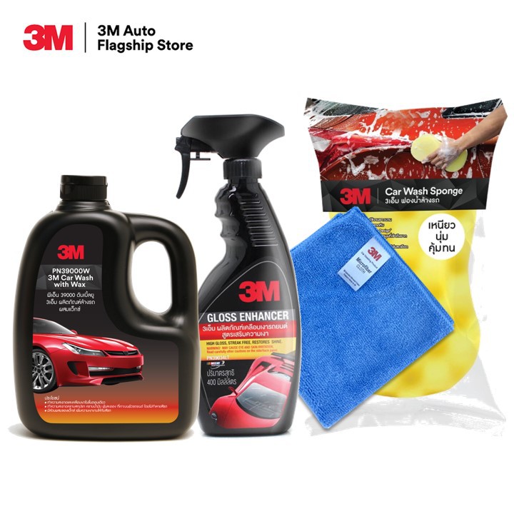 3M แชมพูล้างรถ PN39000W+ เคลือบเงารถยนต์ PN39034LT+ ผ้าไมโครไฟเบอร์ 30x30 cm. สีฟ้า+ ฟองน้ำ Car Sponge