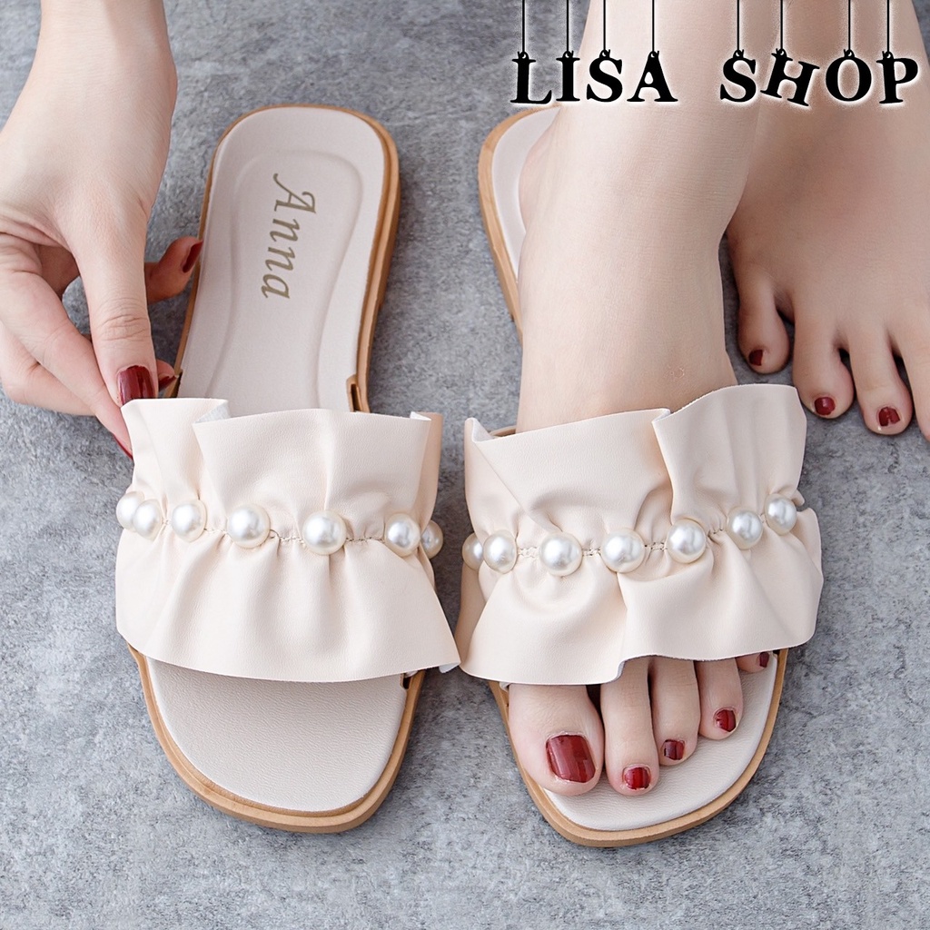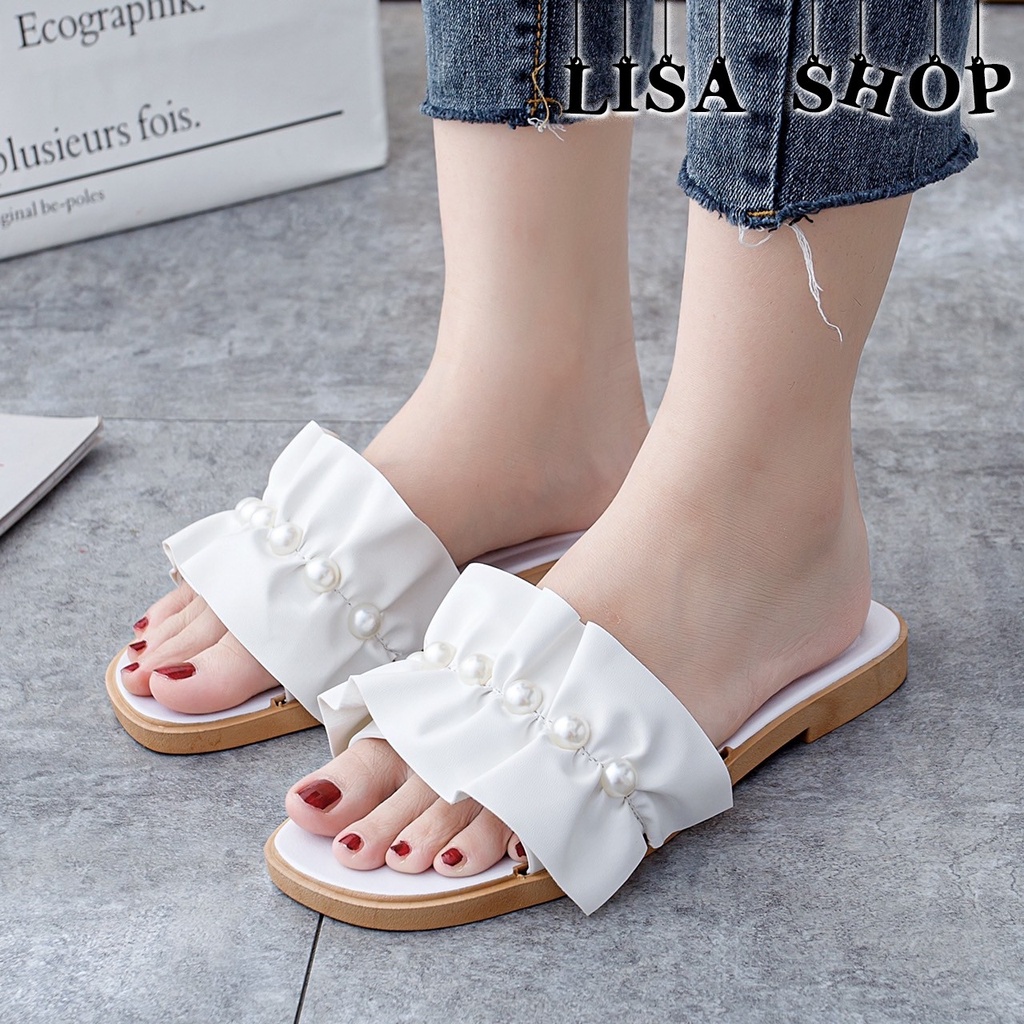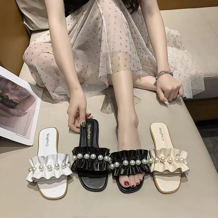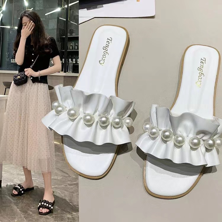 รองเท้าแตะสำหรับผู้หญิง แต่งจีบประดับไข่มุขด้านหน้า รองเท้าแตะแฟชั่น T97