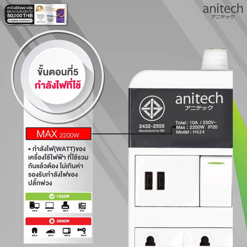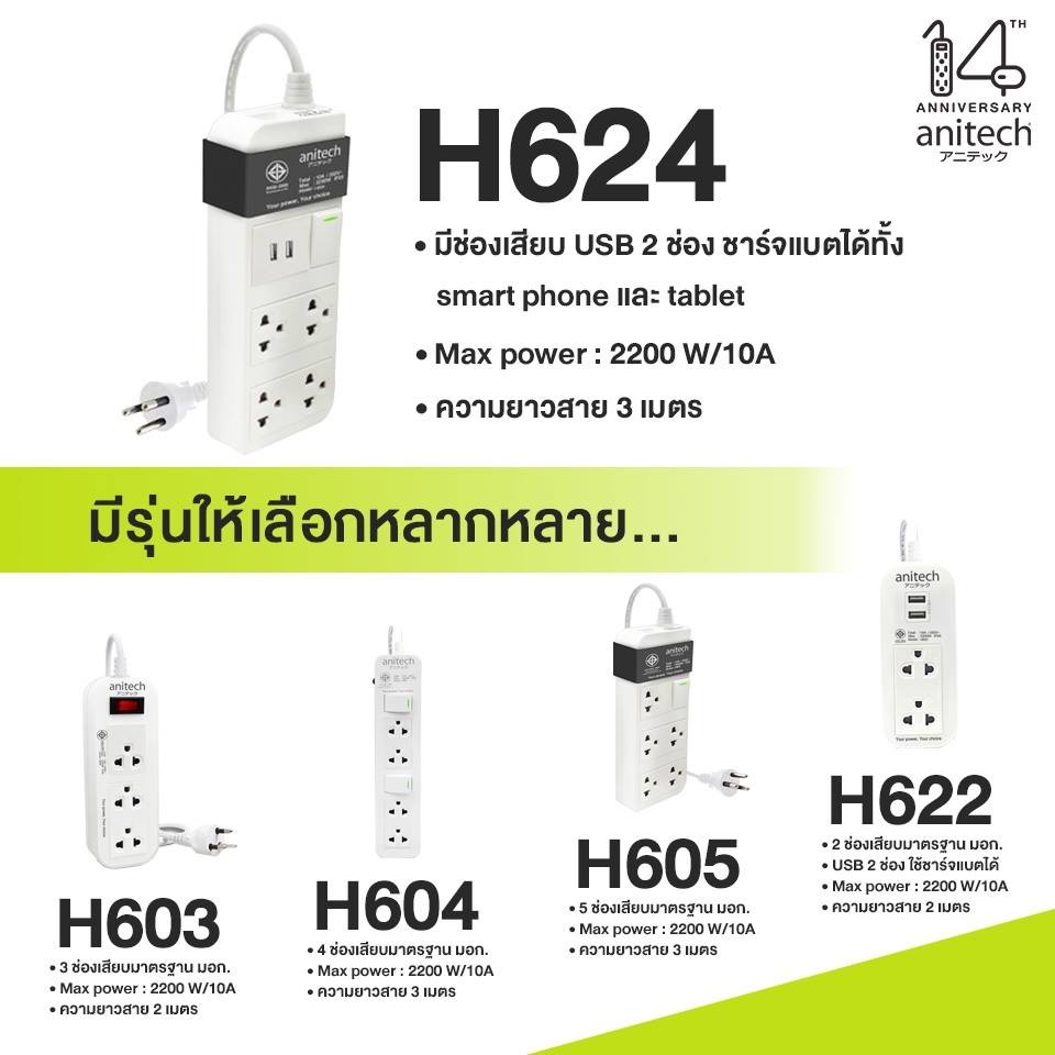 Anitech แอนิเทค ปลั๊กไฟ มอก. 4 ช่อง 2 USB รุ่น H624 สายไฟยาว 3 เมตร