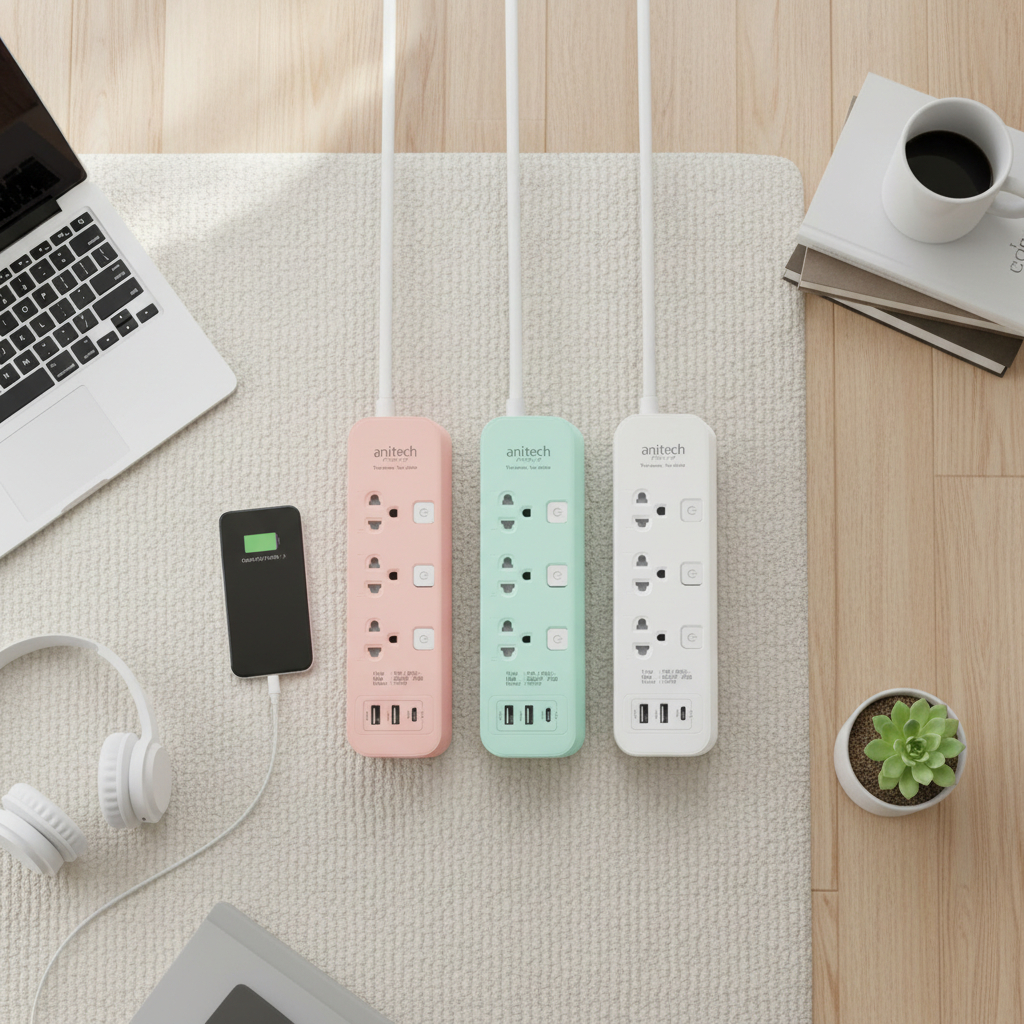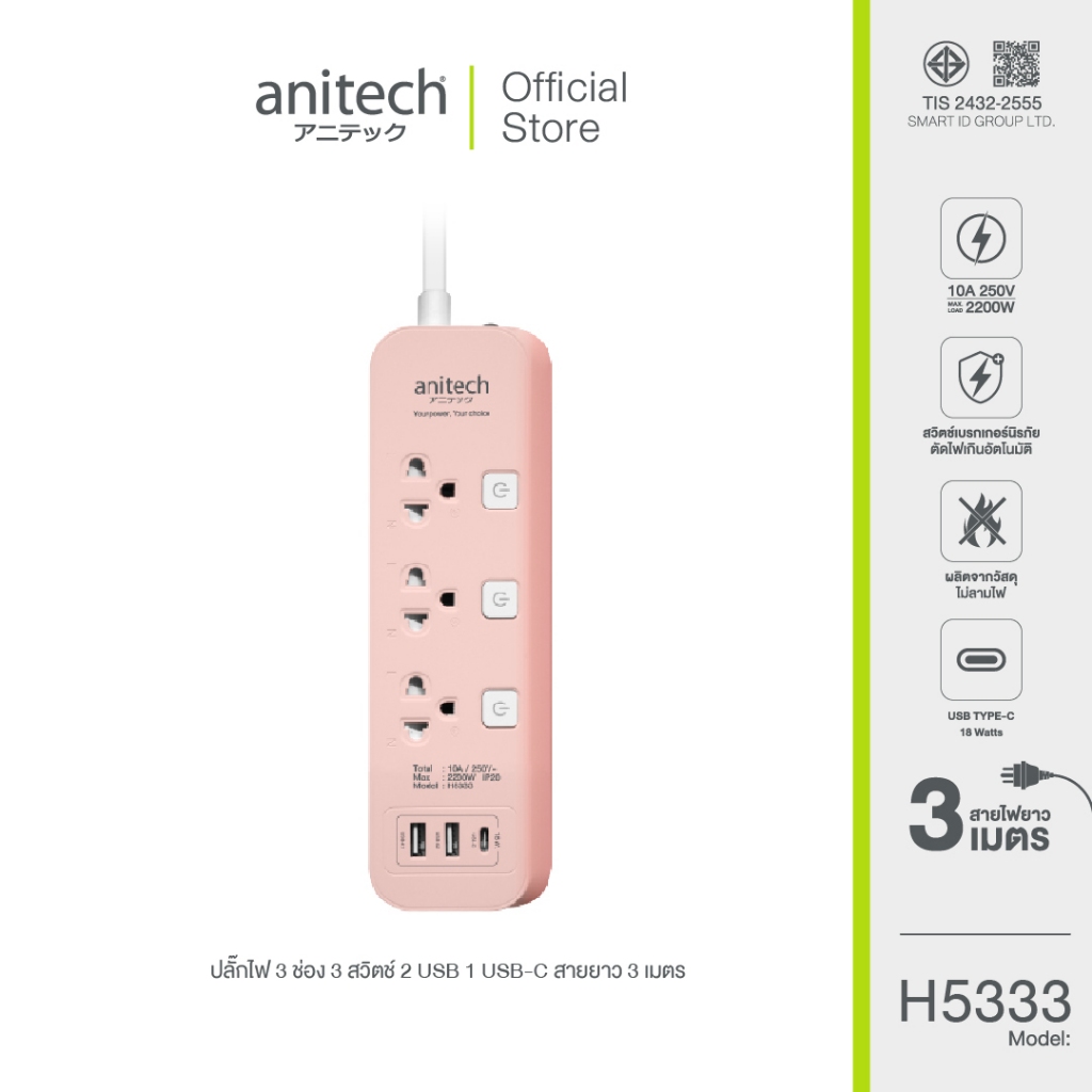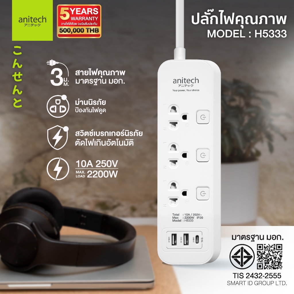 Anitech แอนิเทค ปลั๊กไฟมาตรฐาน มอก. 3 ช่อง 3 สวิตซ์ 2 USB 1 USB-C รุ่น H5333 [สินค้ารับประกัน 2 ปี]