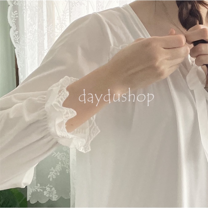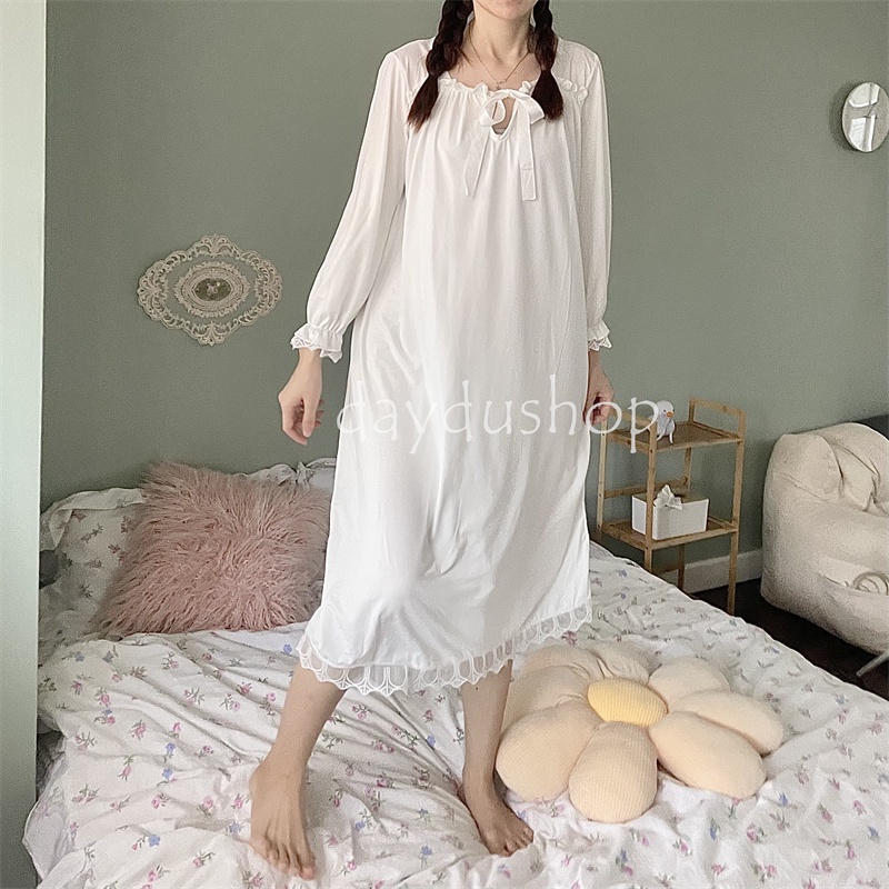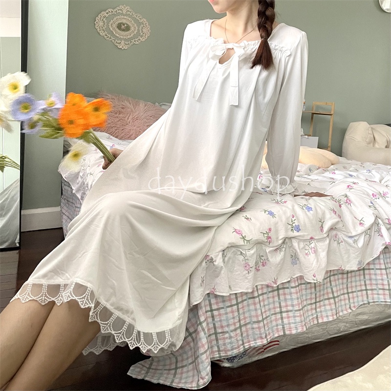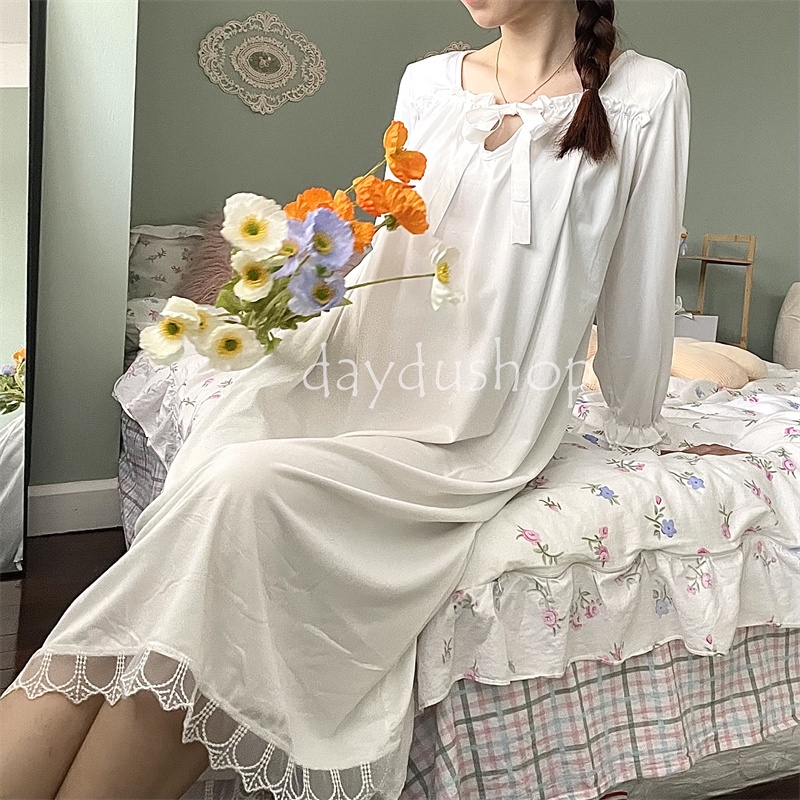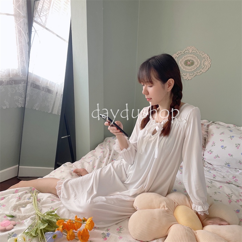 🚚พร้อมส่ง 🐼DayDu ชุดนอนเดรสลูกไม้แขนยาวสไตล์เกาหลีวผ้านิ่มใส่สบาย ไซส์ใหญ่M-_XL D03
