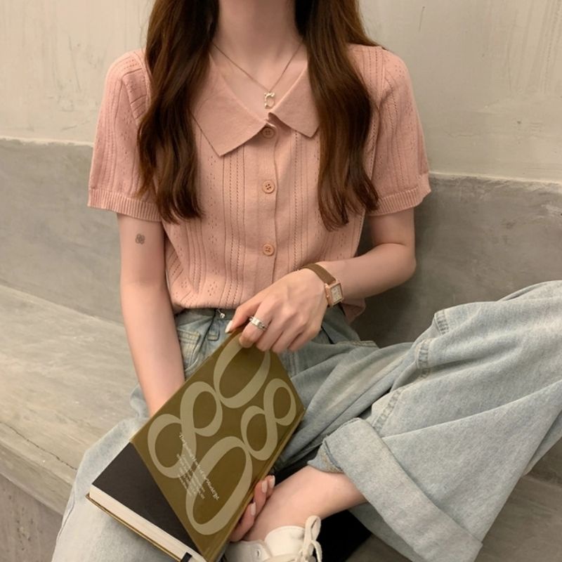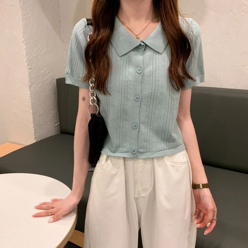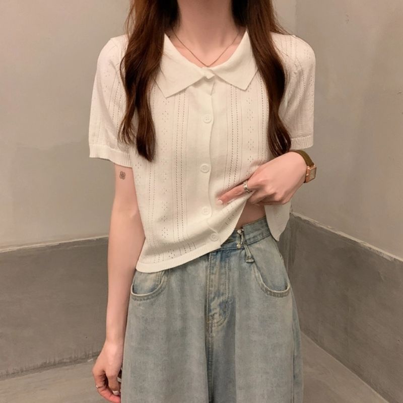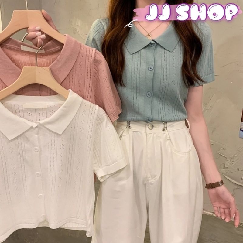 JJ Shop💜พร้อมส่ง เสื้อครอปไหมพรมคอปกแขนสั้น ผ้านิ่มใส่สบายมาก "9169"