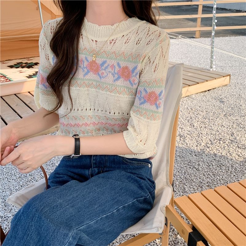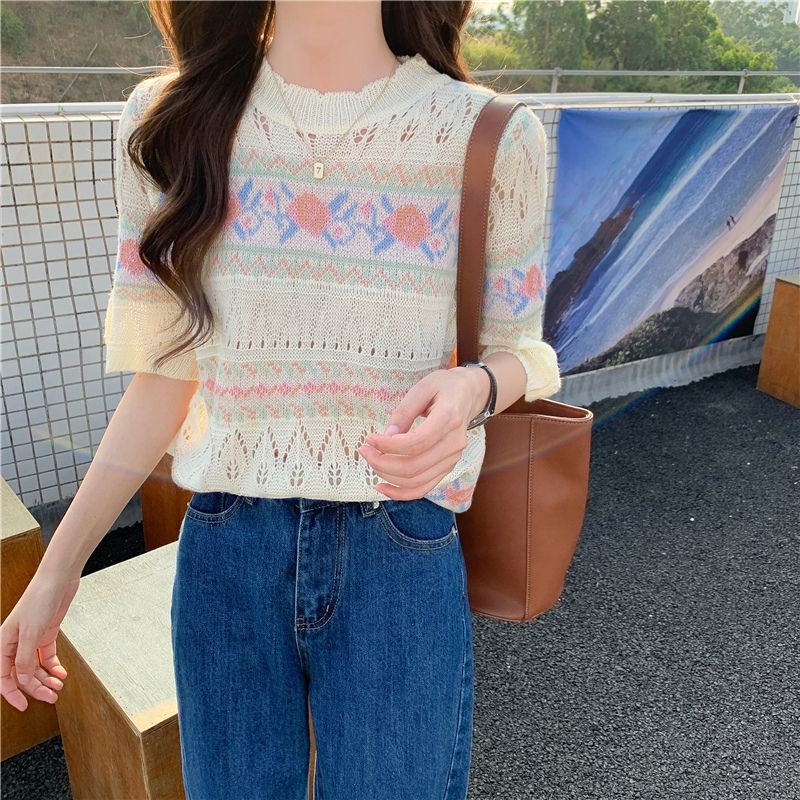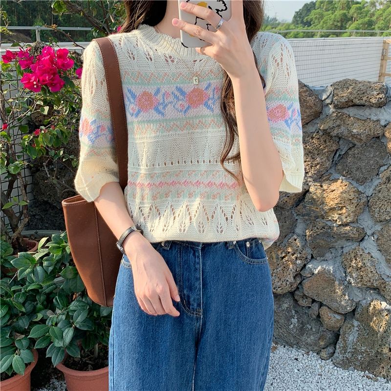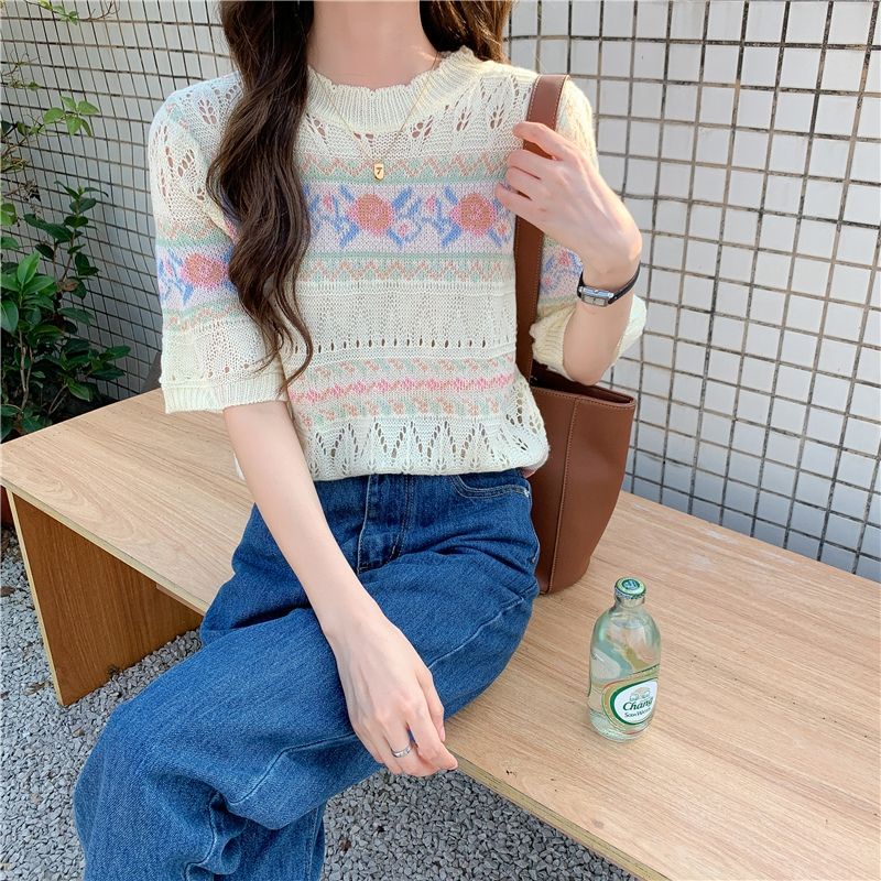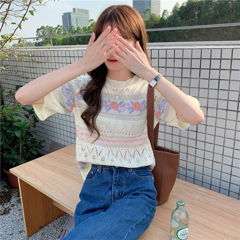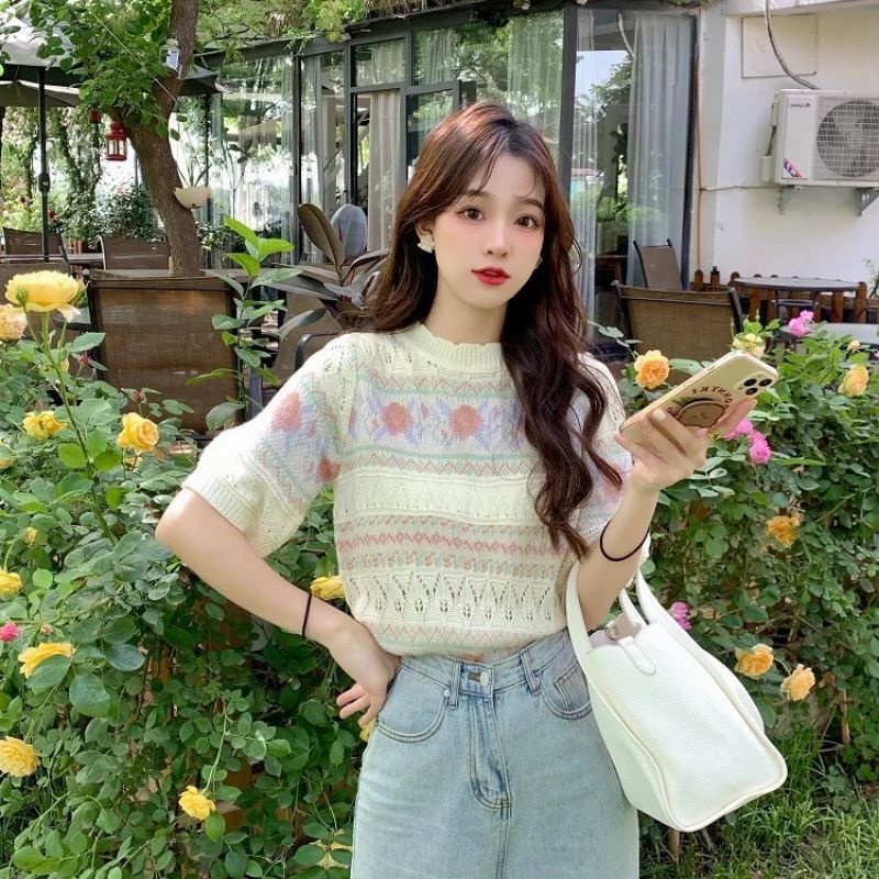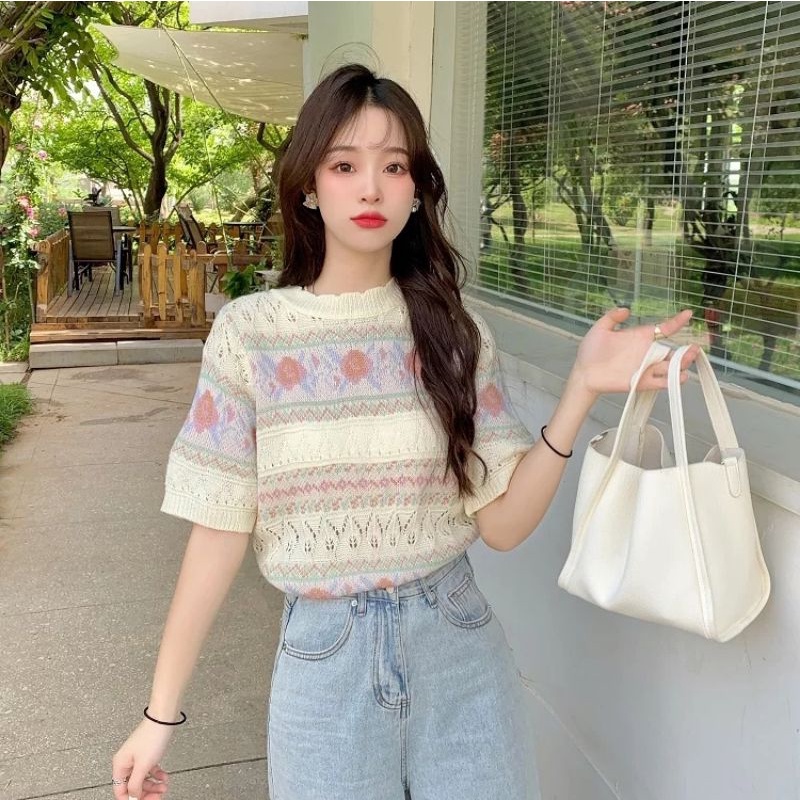 JJ Shop💜พร้อมส่ง เสื้อถักไหมพรมแขนสั้น ผ้านิ่มใส่สบายมาก "1955"