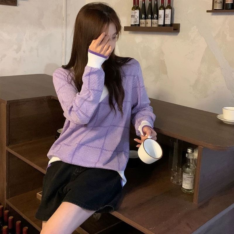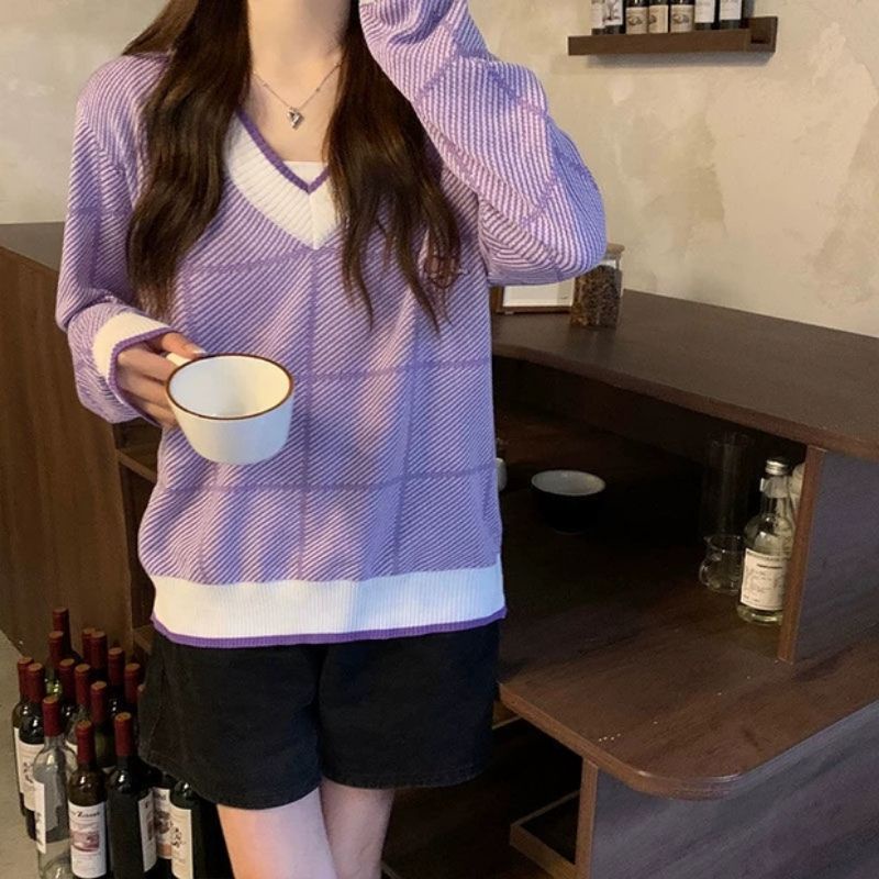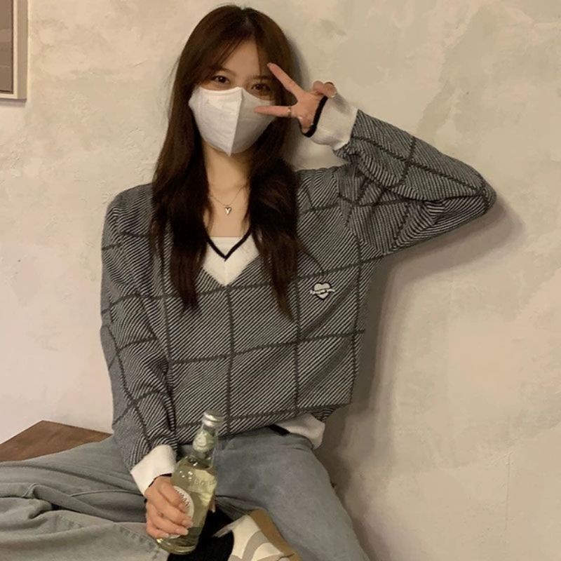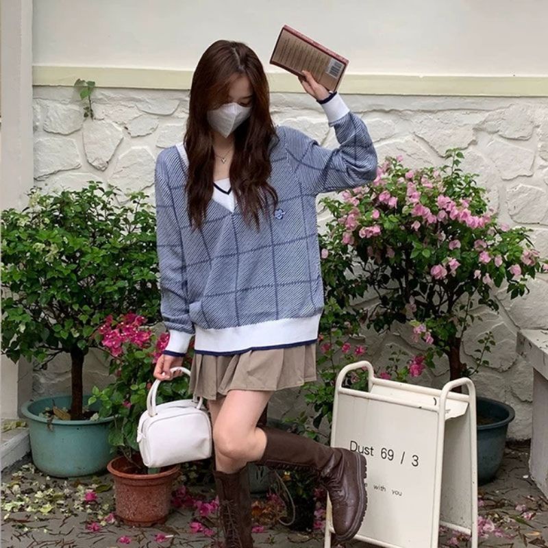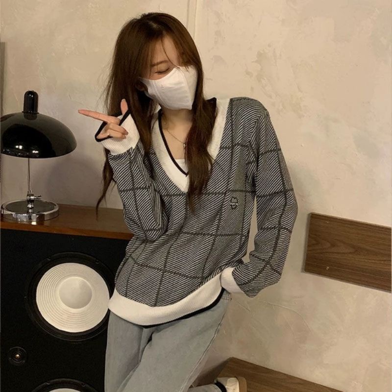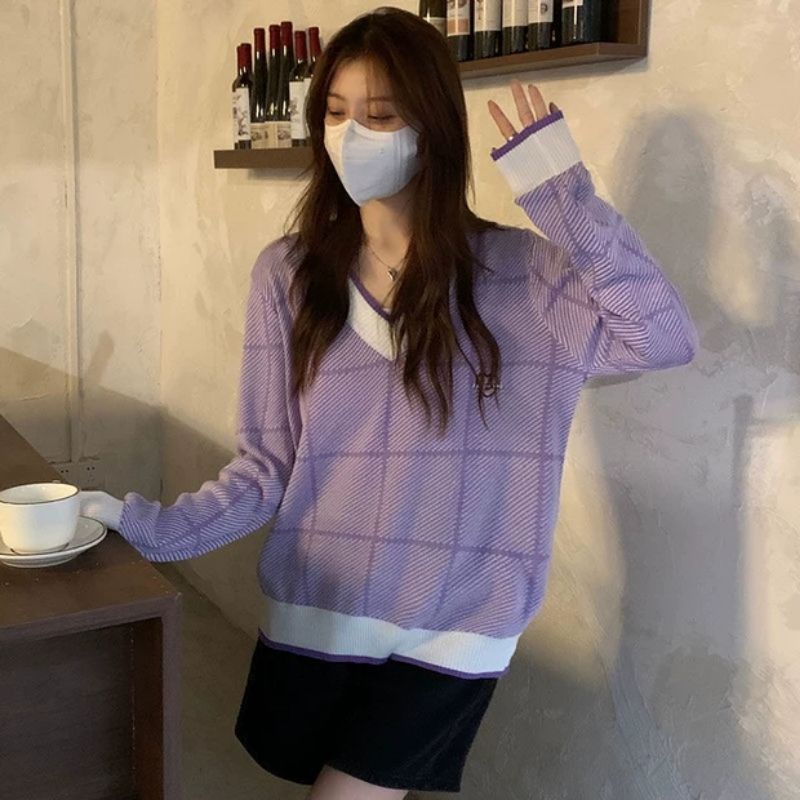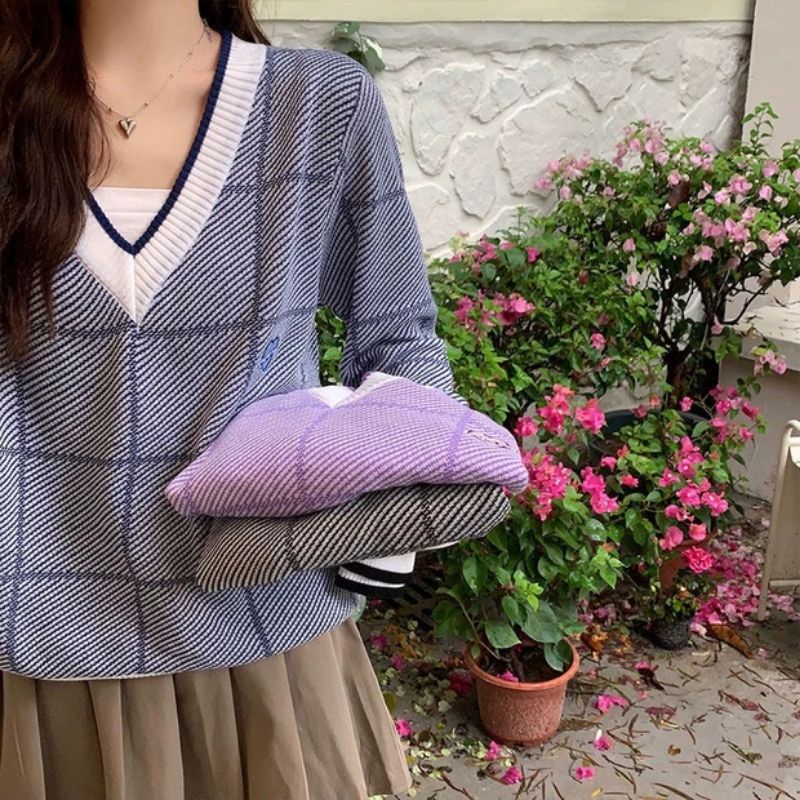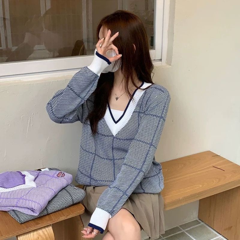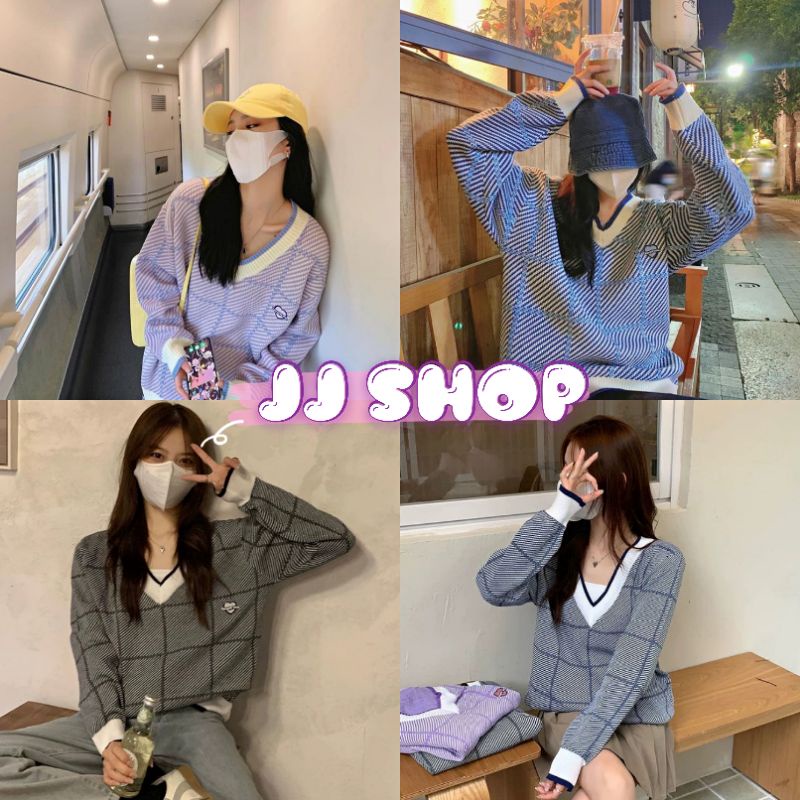 JJ Shop💜พร้อมส่ง เสื้อไหมพรมคอวีแขนยาว ลายตาราง น่ารักเกาหลีมาก "37008" -N