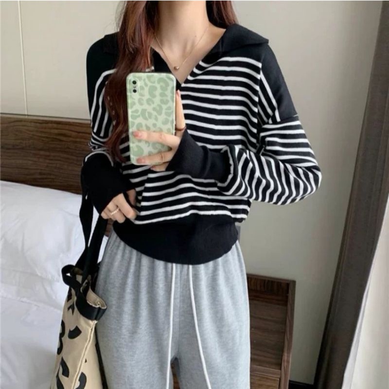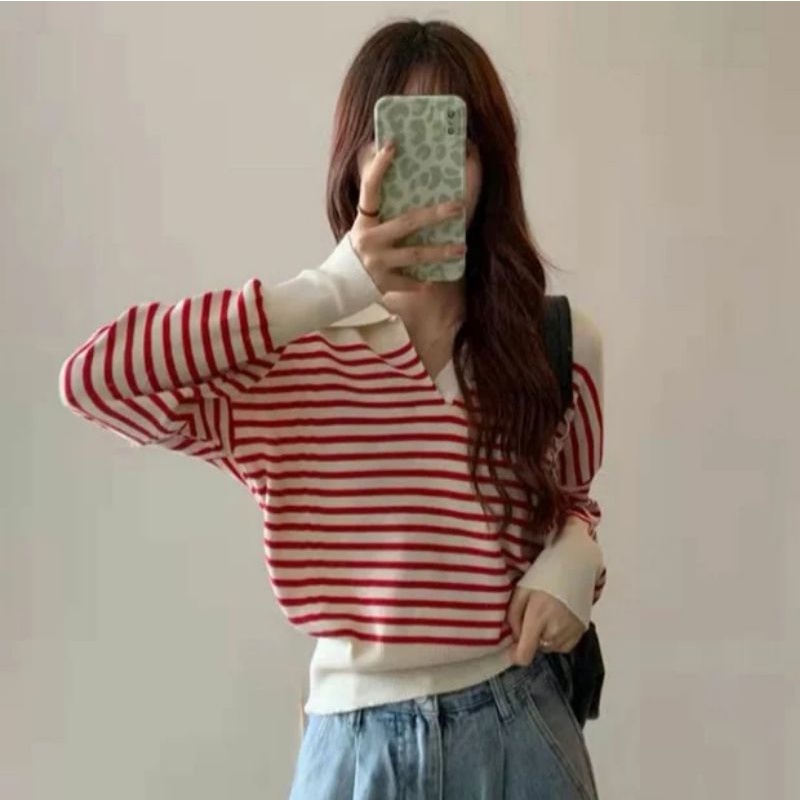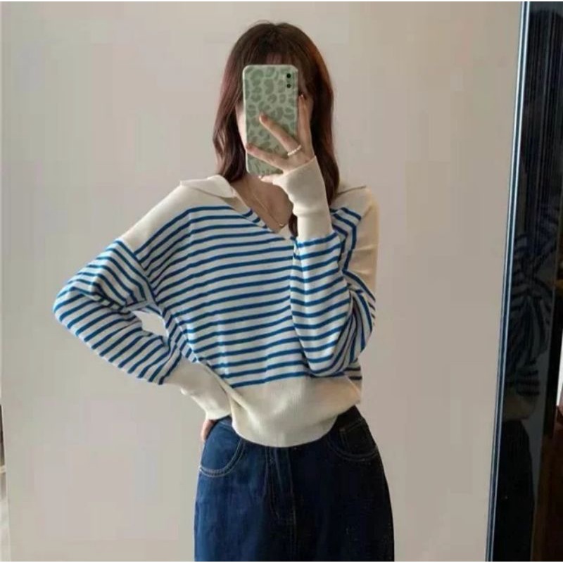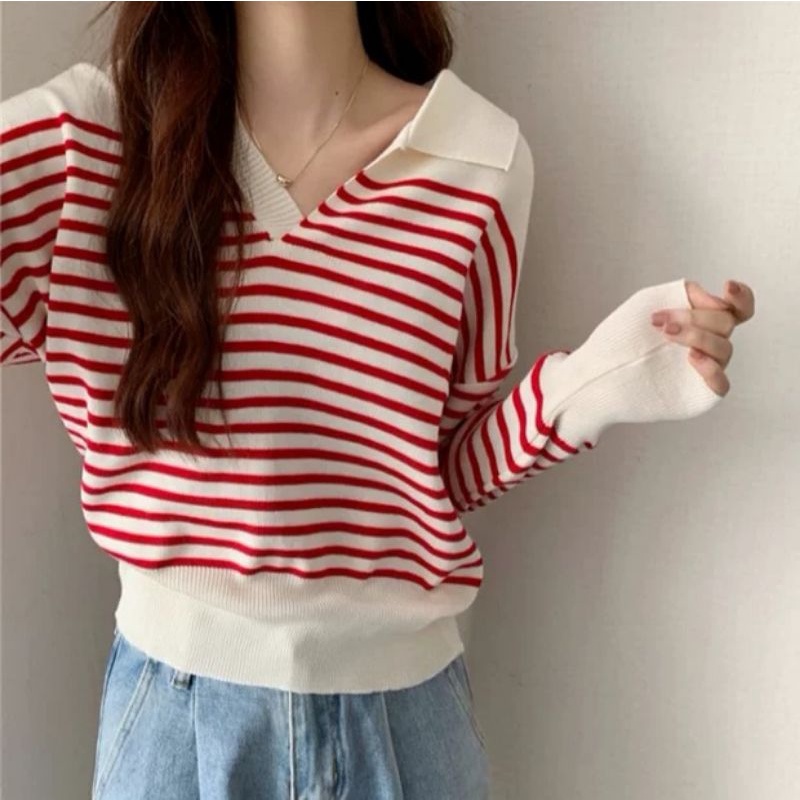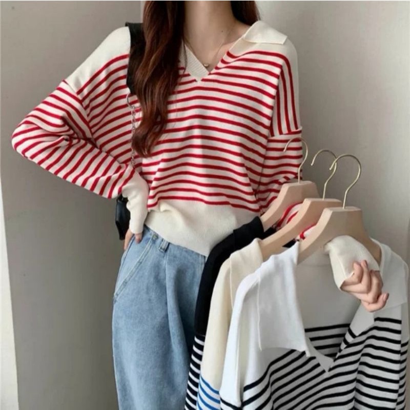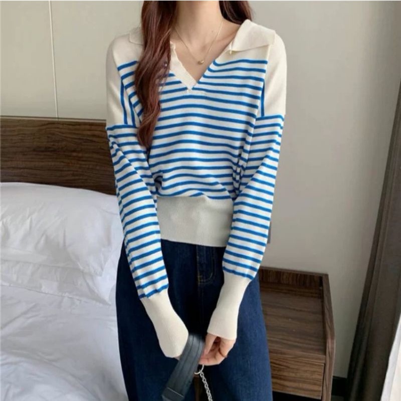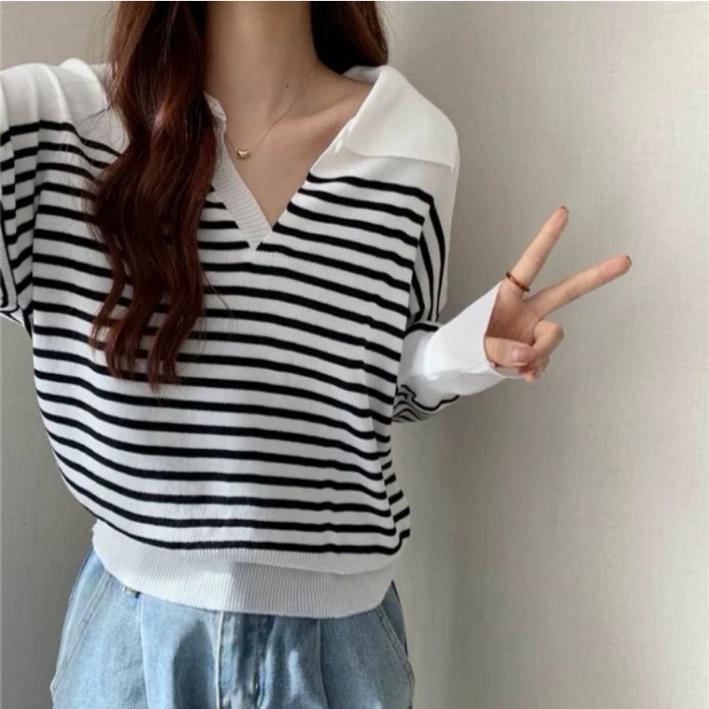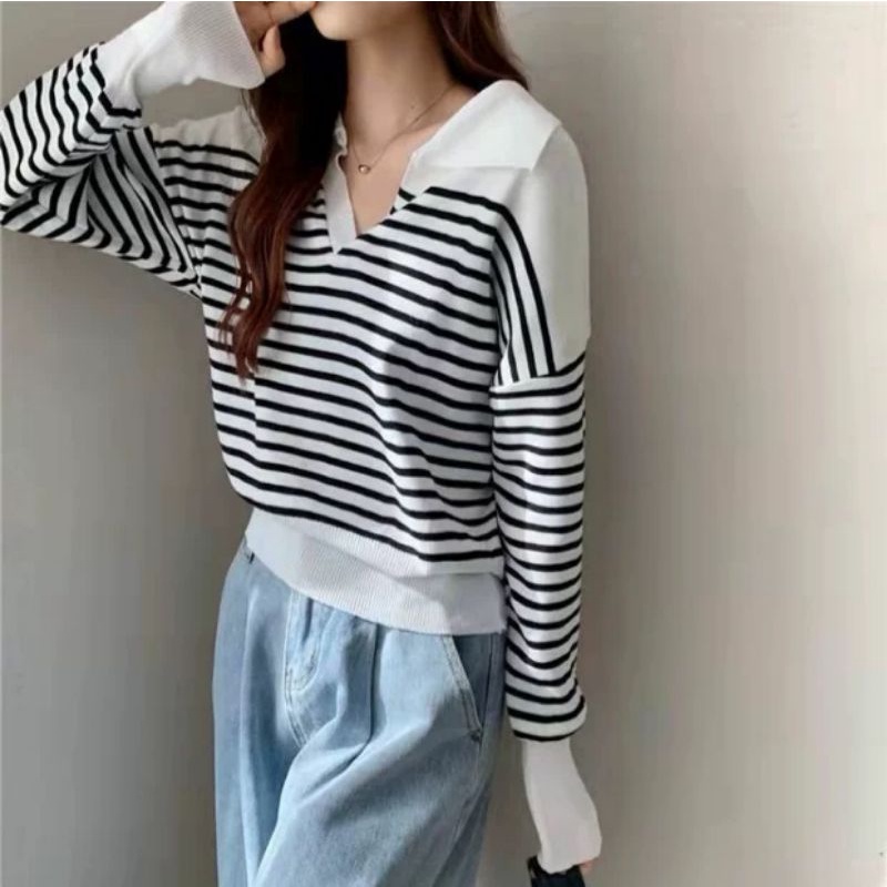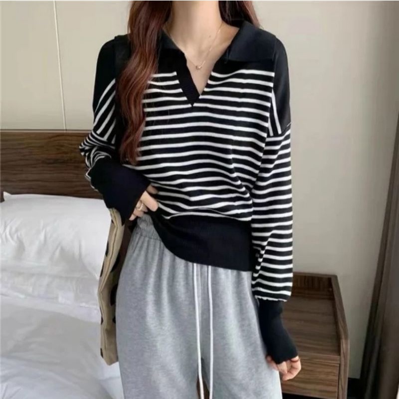 JJ Shop💜พร้อมส่ง เสื้อไหมพรมคอปก ลายทางแขนยาว ใส่สบายผ้านิ่มสุดๆ "8281" -N