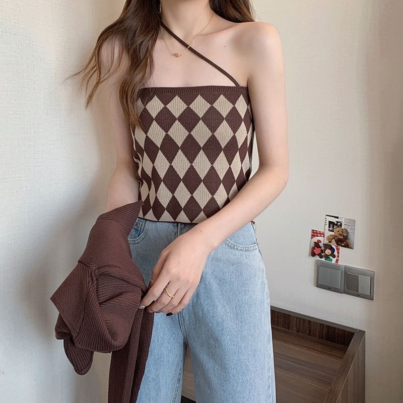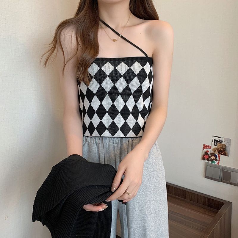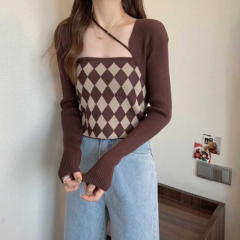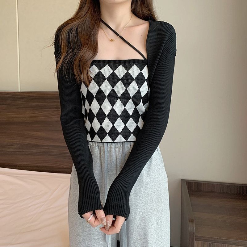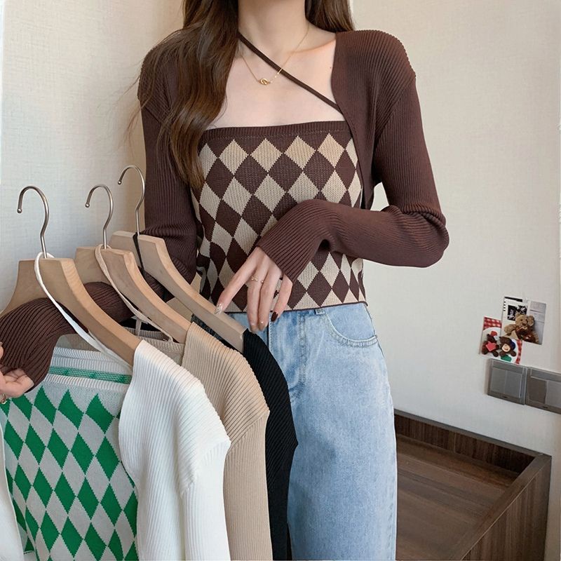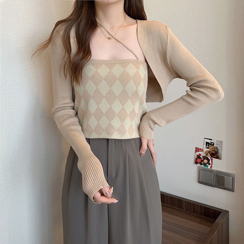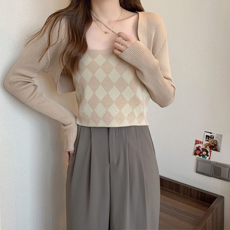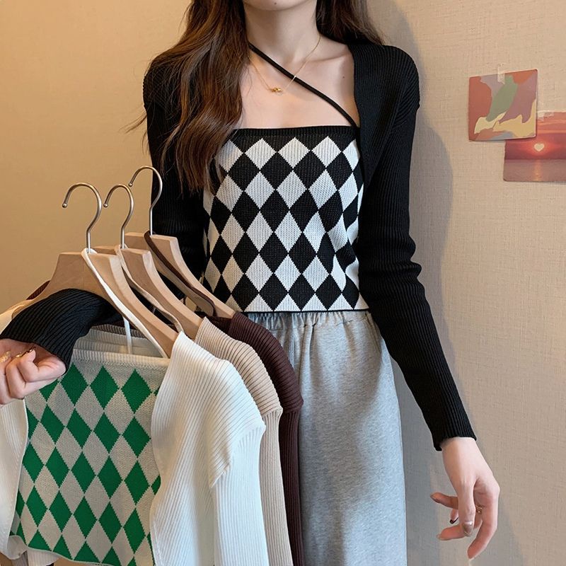 JJ Shop💜พร้อมส่ง เซ็ทเสื้อคลุมไหมพรม+สายเดี่ยว ลายตารางหมากรุกน่ารักมาก"6A39+6A39-1" -C