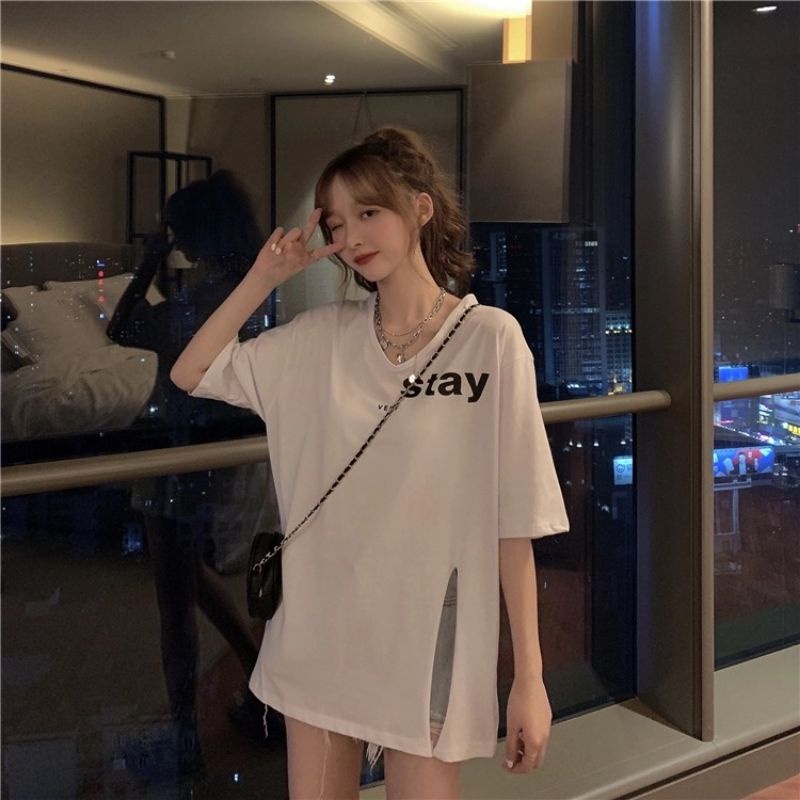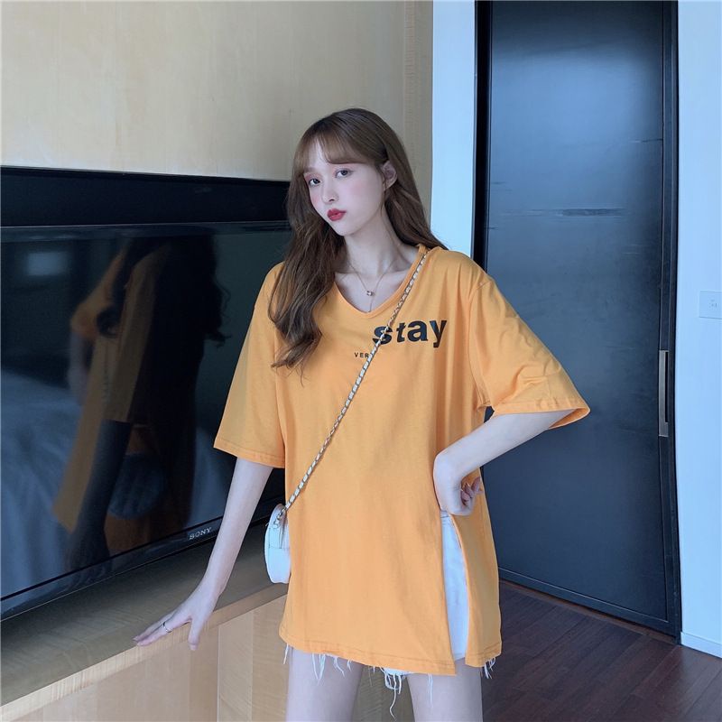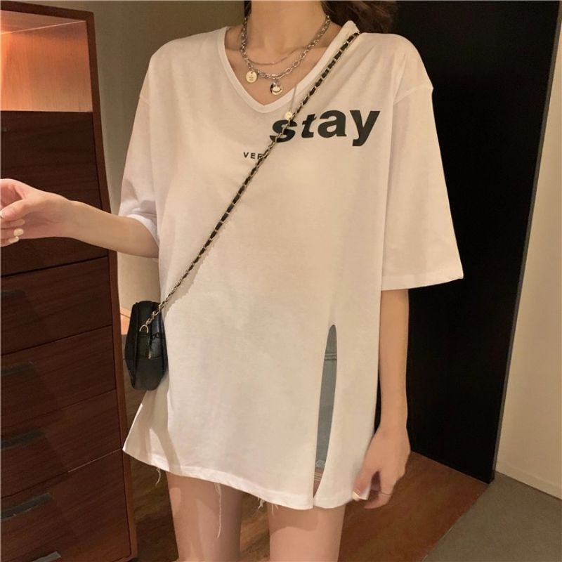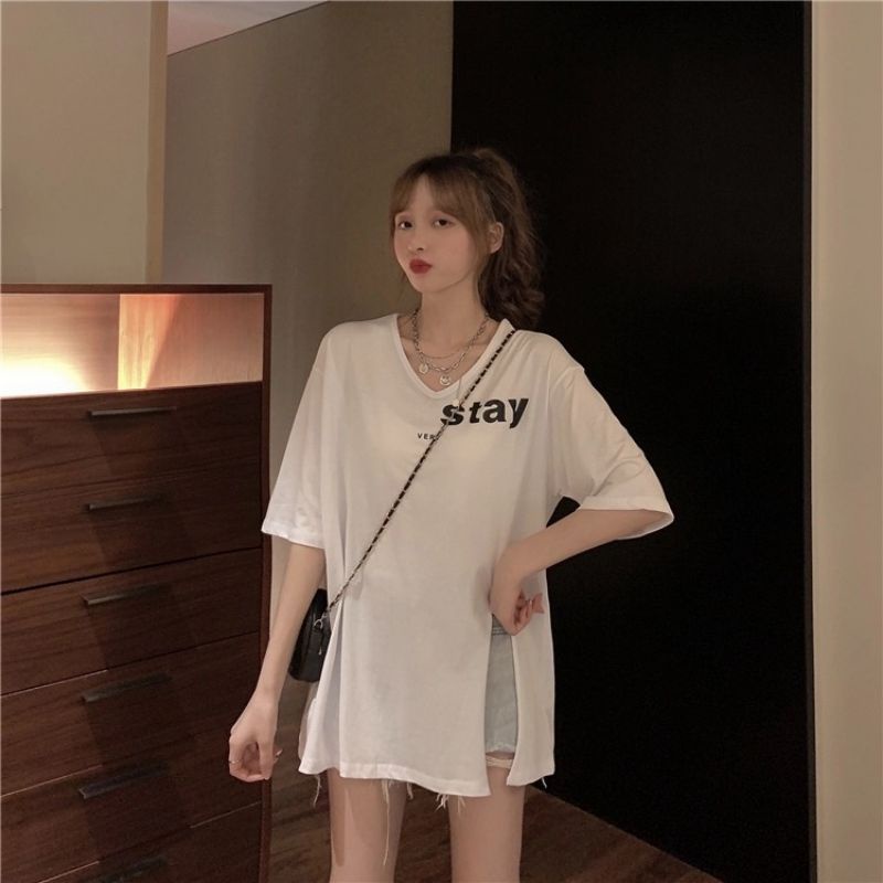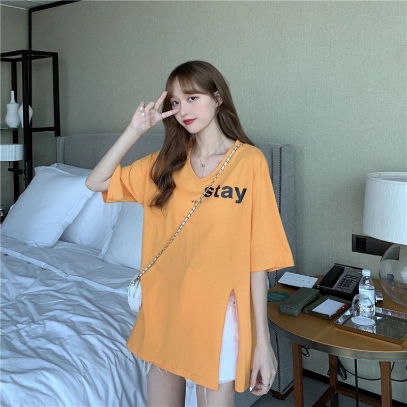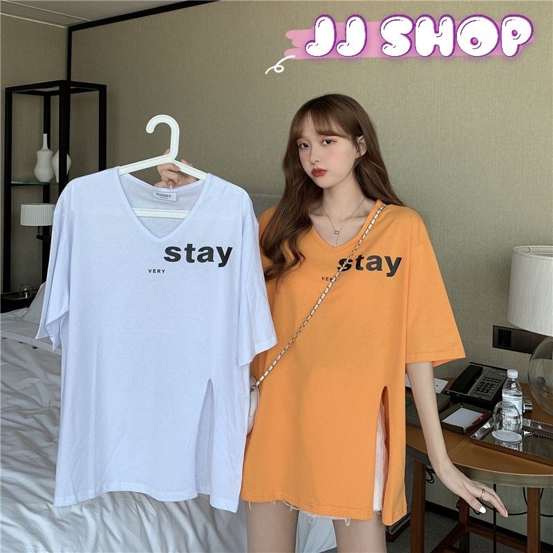 JJ Shop💜พร้อมส่ง เสื้อคอวีแขนสั้น สกีตัวอักษร สีน่ารักไม่ซ้ำใคร "DX-Stay" -N 04