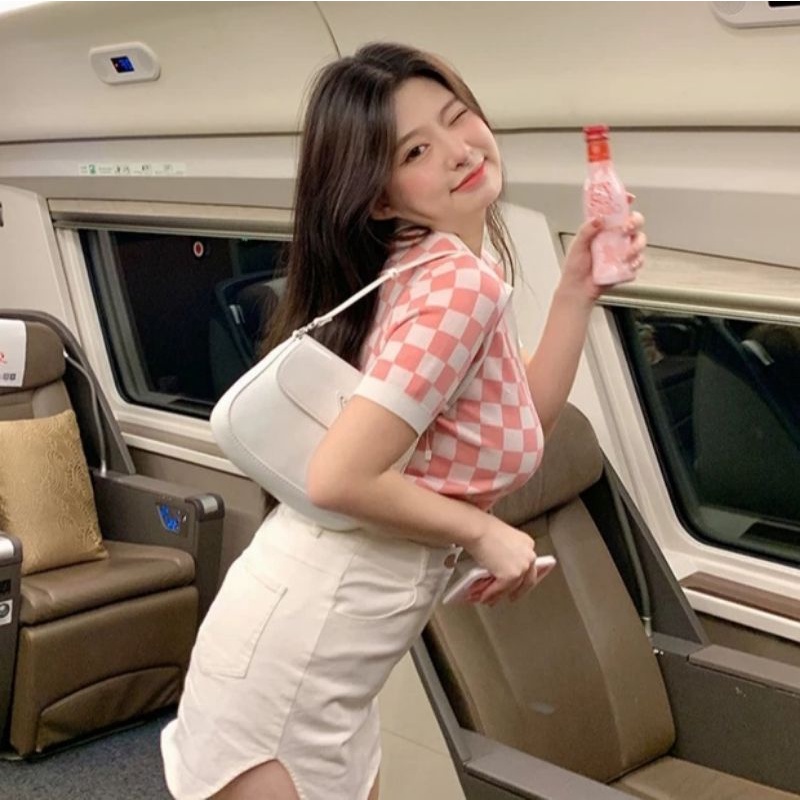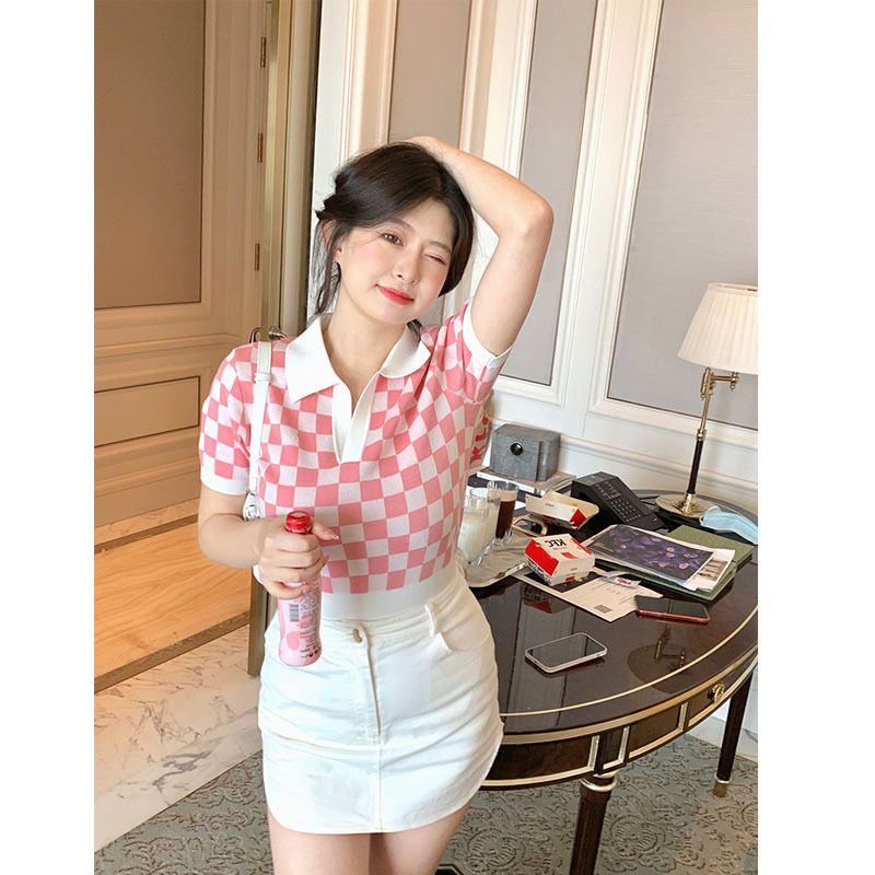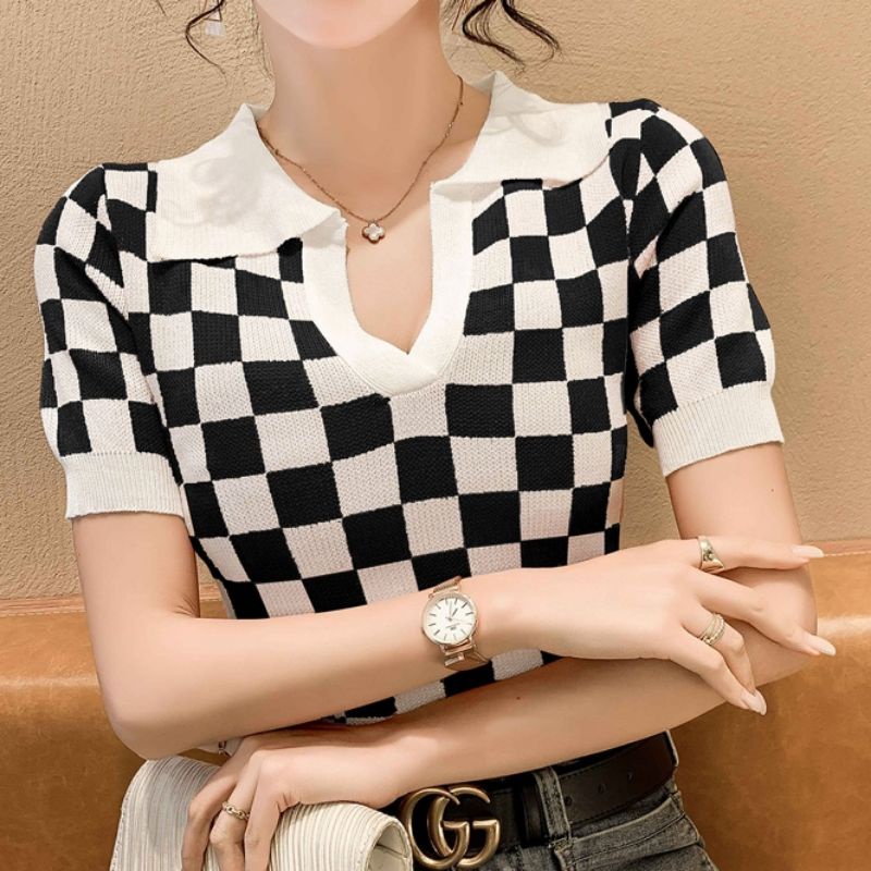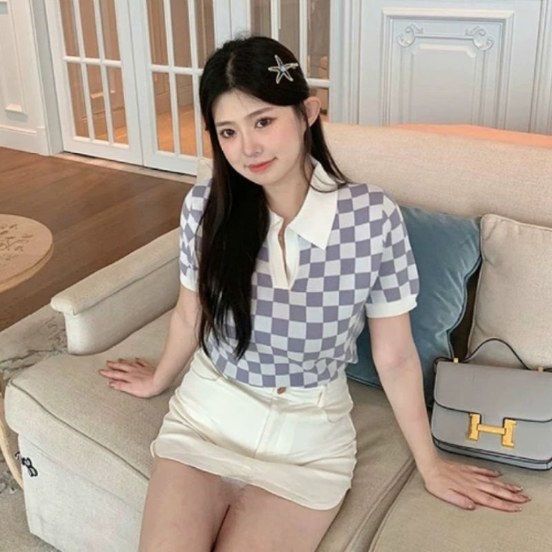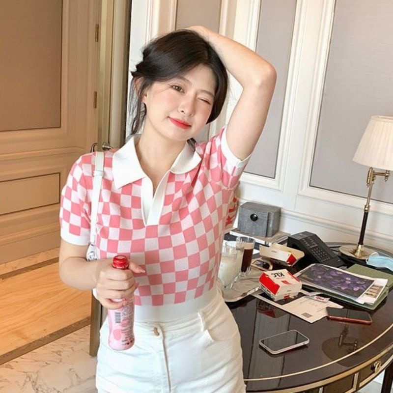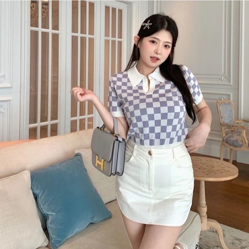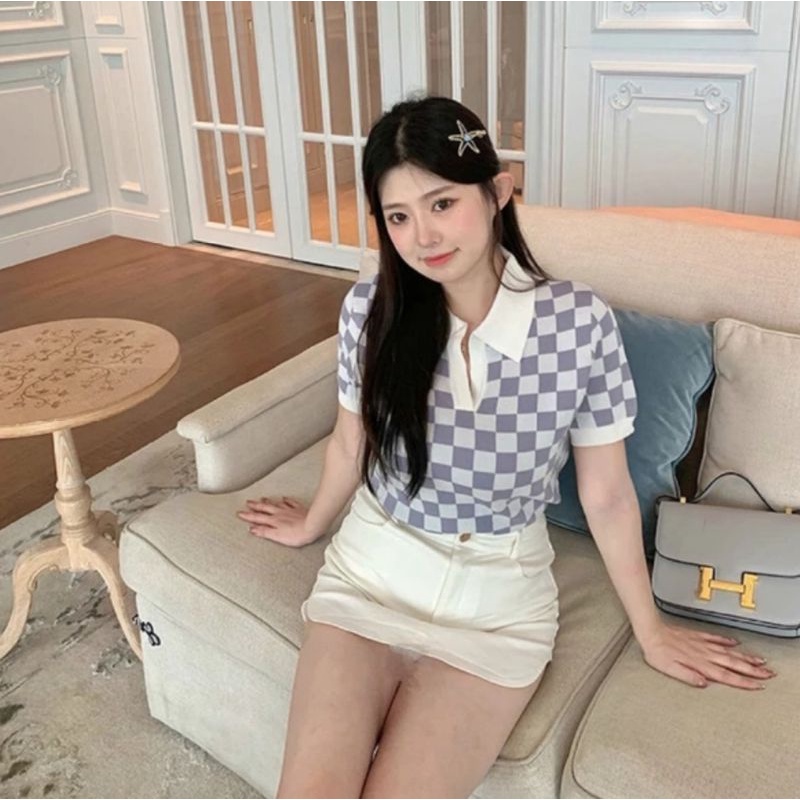 JJ Shop💜พร้อมส่ง เสื้อคอปกไหมพรม ลายคารางสีสุดคิ้วน่ารักๆ "32050"