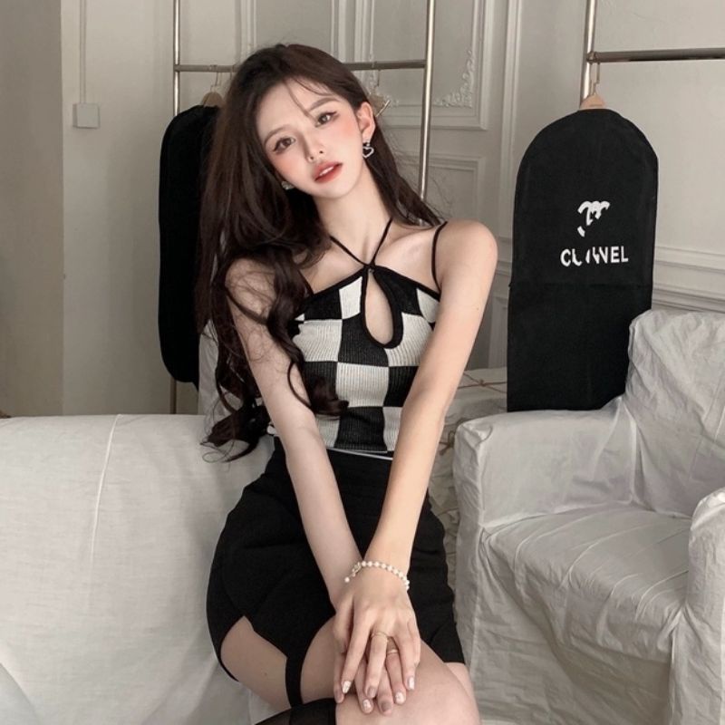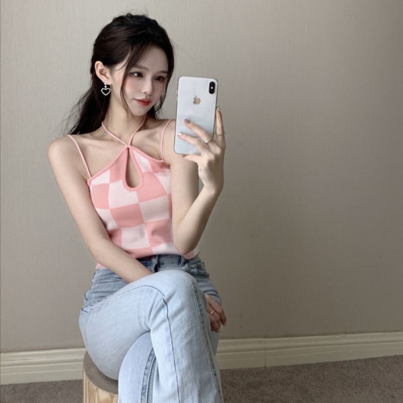 JJ Shop💜พร้อมส่ง เสื้อสายเดี่ยวไหมพรม ลายตารางใหญ่สุดน่ารัก "22013/22013-3" -N