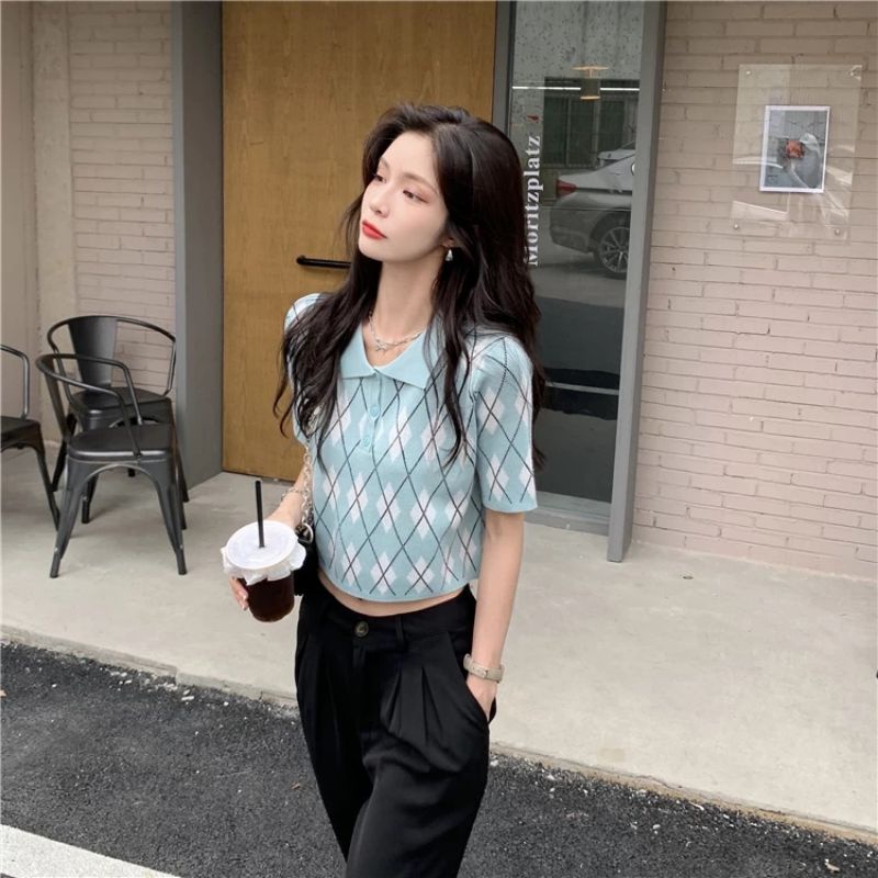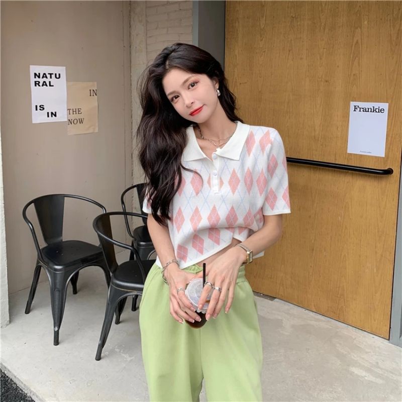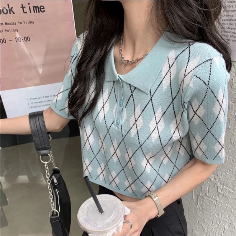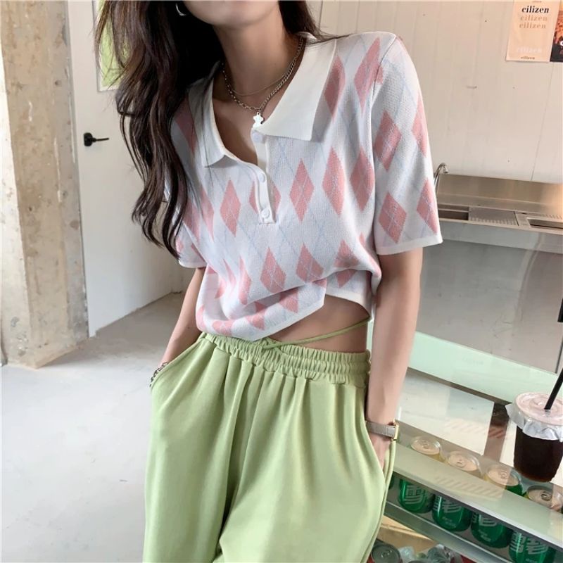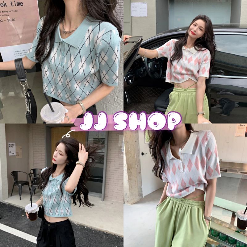 JJ Shop💜พร้อมส่งเสื้อไหใพรมคอปก ลายตารากหมากรุก สีน่ารักมาก "66026" -N