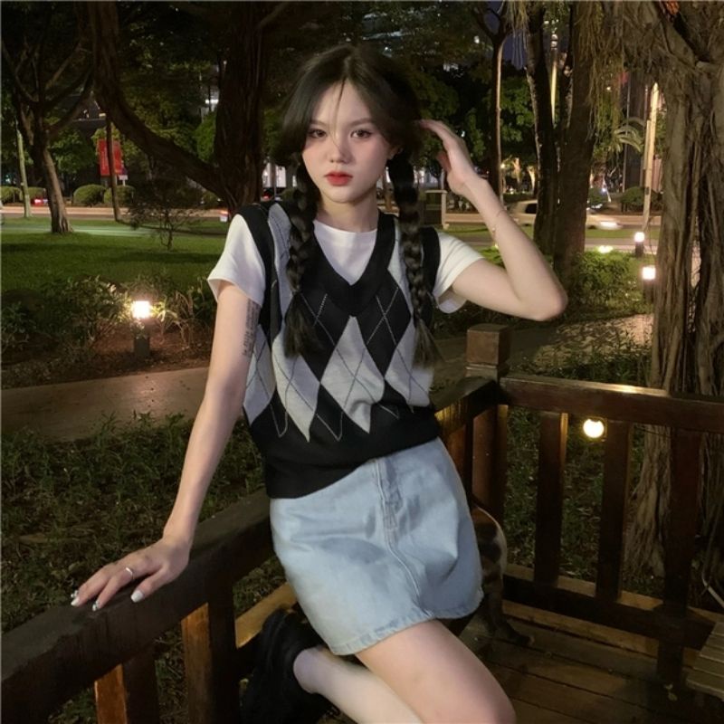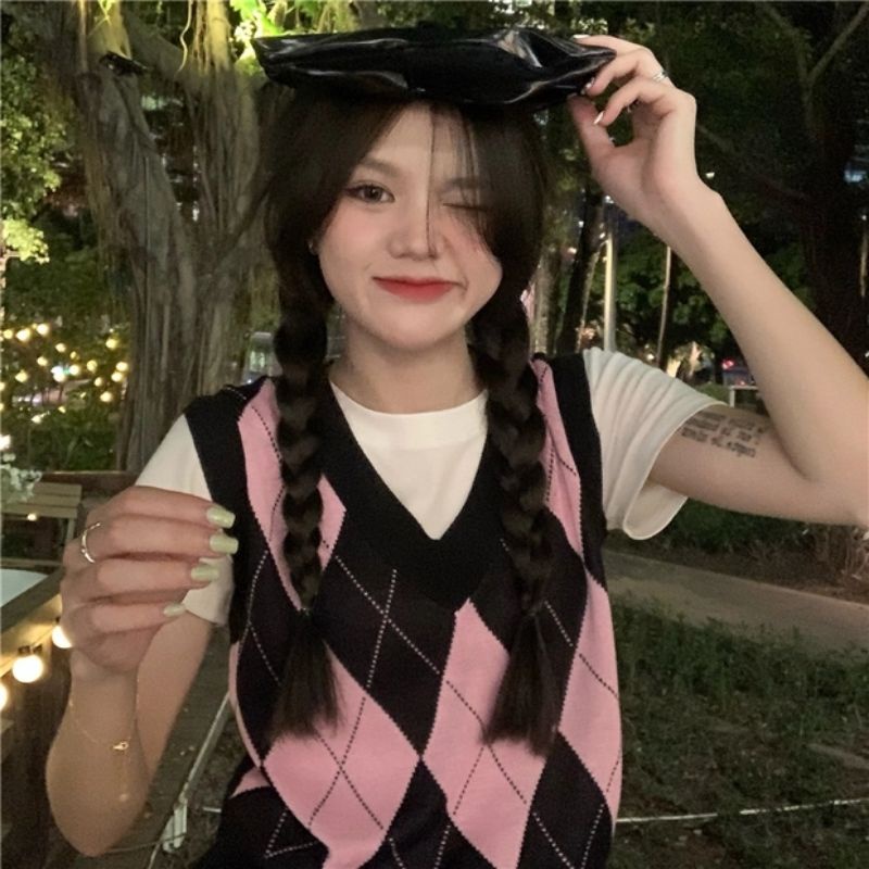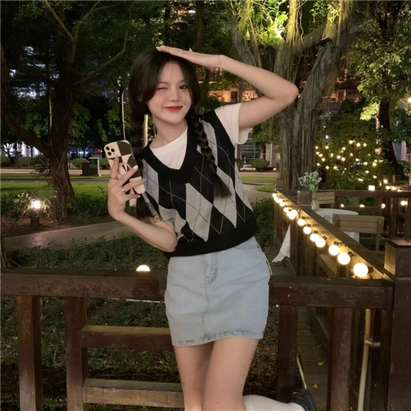 JJ Shop💜พร้อมส่ง เสื้อกั้กไหมพรม ลายตารางหมากรุก น่ารัก "23145"