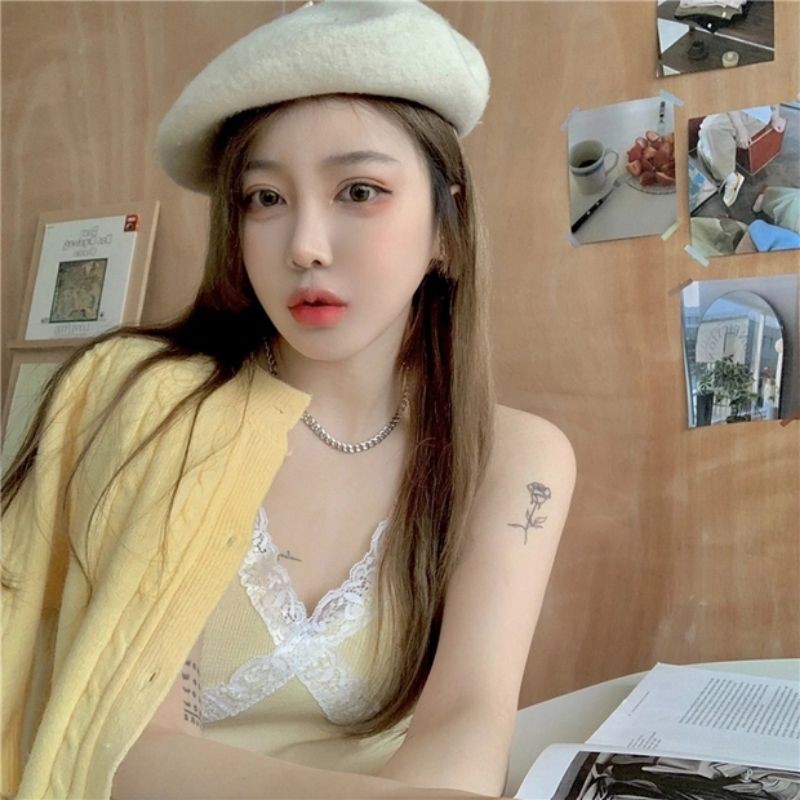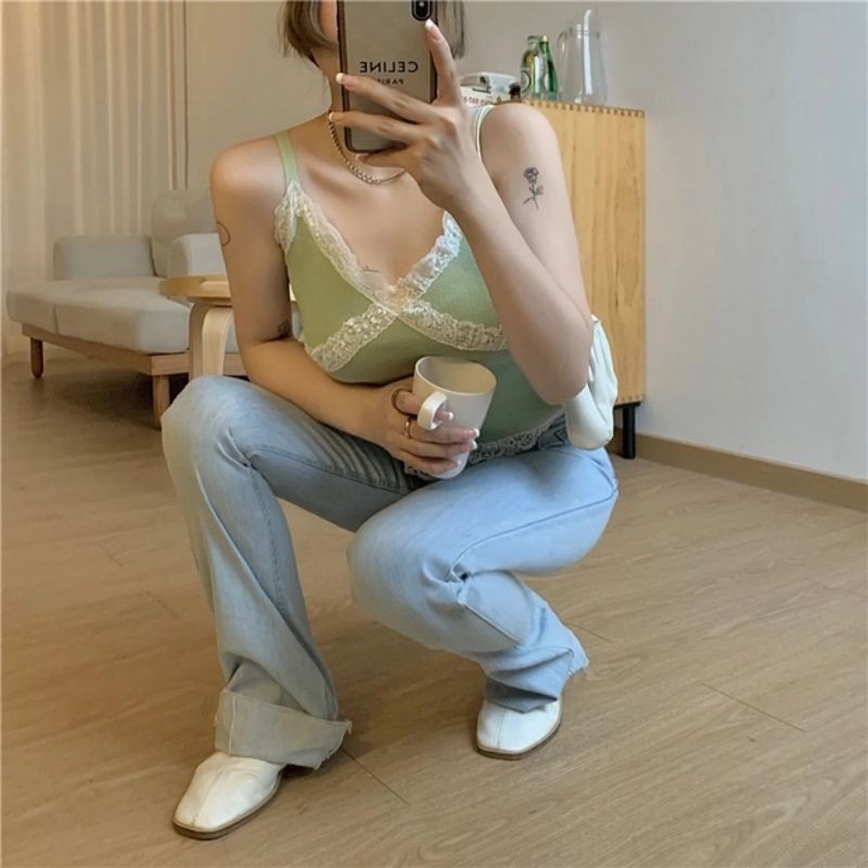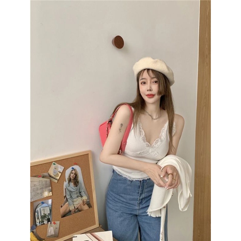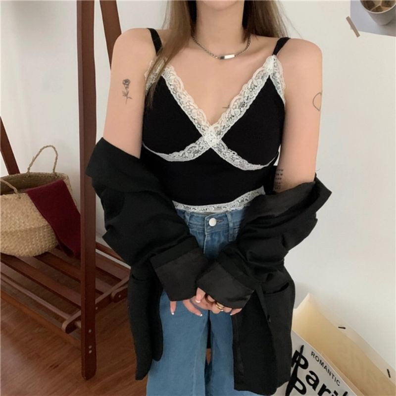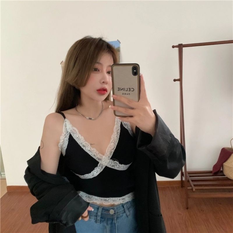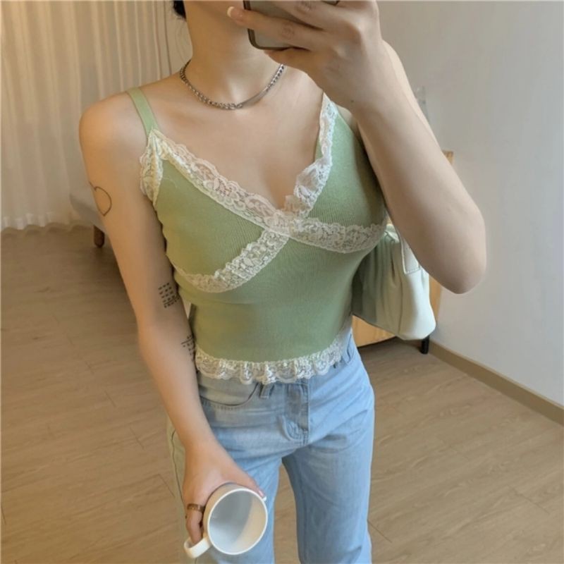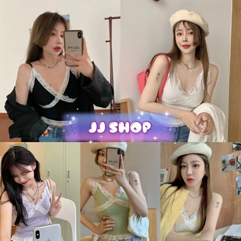 JJ Shop💓พร้อมส่ง เสื้อสายเดี่ยวไหมพรม ดีเทลลูกไม้สุดเซ็กซี่ "1635" -N