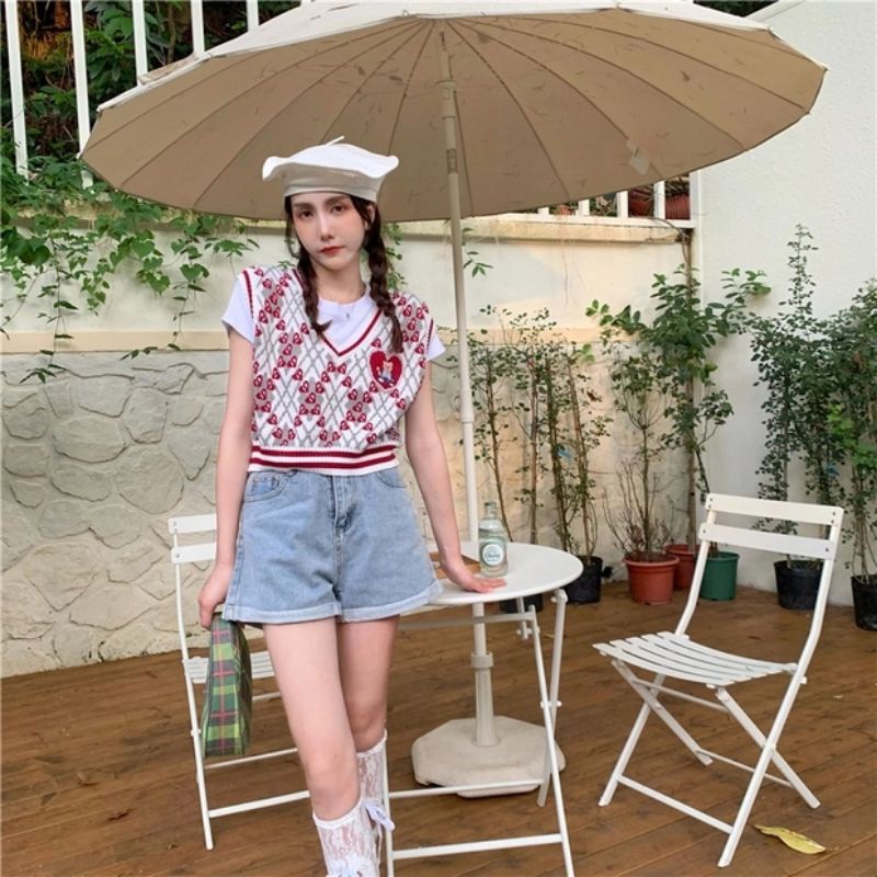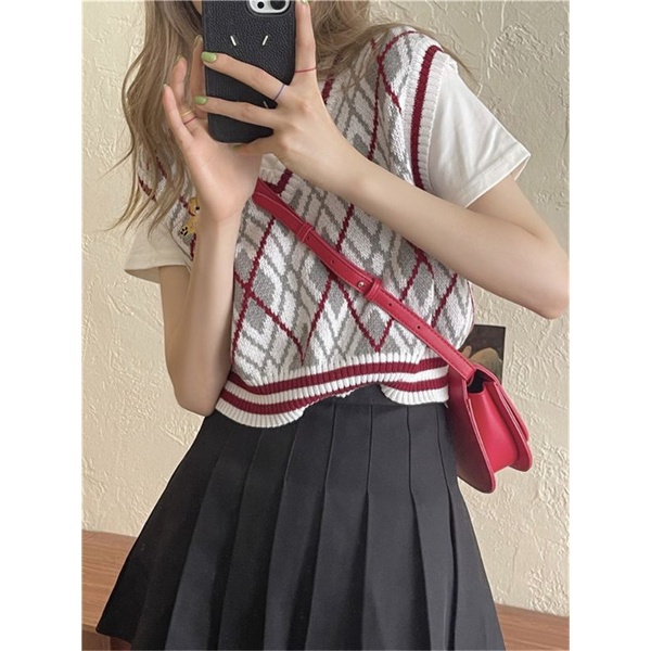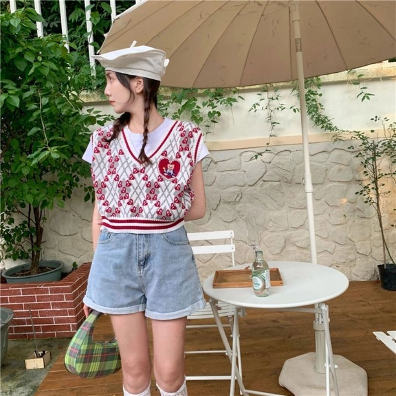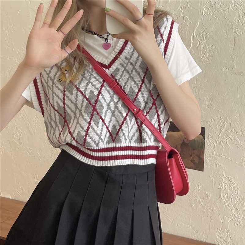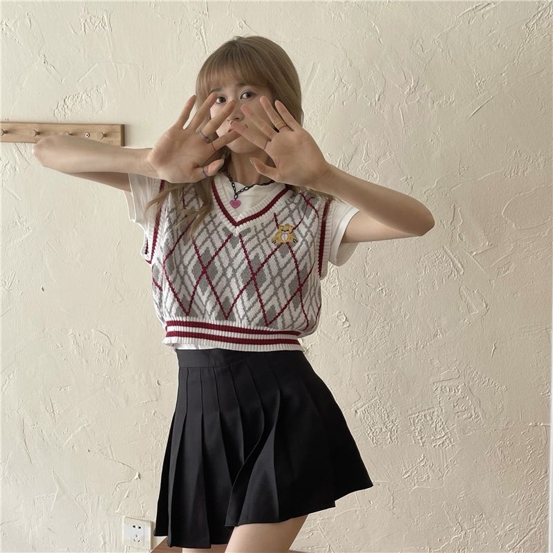 JJ Shop💜พร้อมส่ง เสื้อกั๊กไหมพรม ปักน้องที่หน้าอก เสื้อลายตารางน่ารัก "8596"