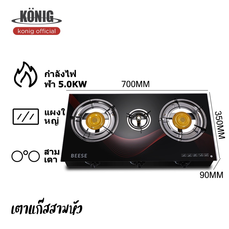 KONIG เตาแก๊ส หัวคู่ หน้าสแตนเลส/ฟิล์มกระจกนิรภัย 4.2KW ขนาด เตาแก๊ส 2 หัว/ 3 หัว